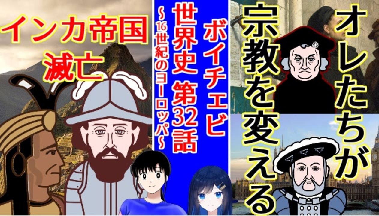 日テレ系「まんが日本史」をオマージュし、<br>学習漫画「世界の歴史」を教科書とした<br>ボイチェビ世界史 第32回は、<br>16世紀のヨーロッパ(海外領土を含むj)です。<br>具体的には、大航海時代の続きと、<br>宗教改革を取り扱います。<br><br>「歴史学者・ことりさん」が、<br>no.7(voicevox)の声でご案内いたします。<br>そしてアシスタントに双葉湊音ちゃんを起用。<br><br>EDテーマ「風のメルヘン」は、誕生祭に因んで、<br>no.7(neutrino)が歌います。<br>注意点<br>・セリフおよび画像は、その一部は教科書など参考文献から<br>引用させていただくことがあります。<br>・演出のために、舞台の時代にそぐわない画像や<br>音楽を使う場合がございます。<br>・セリフ発声はすべて合成音声<br>・BGMは、ファイナルファンタジー等の、他者作成のBGMや音楽を借ります。<br>・若干の表記ゆれはご容赦ください。<br>・親作品は動画最後のスタッフロール画面に掲載します。<br><br>1:10 第1章 揺らぐカトリック<br><a href="https://www.nicovideo.jp/watch/sm44895524?from=70" target="_blank" rel="noopener nofollow">https://www.nicovideo.jp/watch/sm44895524?from=70</a><br><br>5:29 第2章 アステカの最期 <br><a href="https://www.nicovideo.jp/watch/sm44895524?from=329" target="_blank" rel="noopener nofollow">https://www.nicovideo.jp/watch/sm44895524?from=329</a><br><br>7:53 第3章 イギリス国教会誕生!<br><a href="https://www.nicovideo.jp/watch/sm44895524?from=473" target="_blank" rel="noopener nofollow">https://www.nicovideo.jp/watch/sm44895524?from=473</a><br><br>11:52 第4章 デスピサロ <br><a href="https://www.nicovideo.jp/watch/sm44895524?from=712" target="_blank" rel="noopener nofollow">https://www.nicovideo.jp/watch/sm44895524?from=712</a><br><br>14:15 第5章 カルヴァン派の成立<br><a href="https://www.nicovideo.jp/watch/sm44895524?from=855" target="_blank" rel="noopener nofollow">https://www.nicovideo.jp/watch/sm44895524?from=855</a>