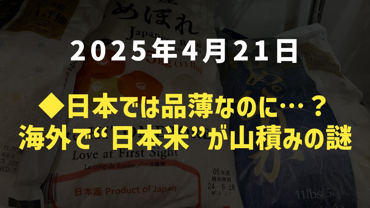 米不足が報じられる日本。一方、私が住む米国の日系スーパーには、日本産のお米や加工食品が豊富に並んでいました。 <br>昨年までは見かけなかった品が、今年は大量に棚に…。 <br>現地で実際に撮影された投稿写真を元に、「今、何が起きているのか?」 <br><br>・北海道産ゆめぴりか <br>・岩手県産ひとめぼれ <br>・サトウのごはん などの実例あり <br><br>気づいた方はぜひ、コメントであなたの地域の状況も教えてください。<br><br>ジャンル:暮らし/食と物流/海外レポート<br>※この動画は特定の意図や団体の主張ではなく、現地の記録と考察をもとに制作しています。<br><br><br>◆ 今回の台本<br><a href="https://keiichiro8140.hatenablog.com/entry/20250421001" target="_blank" rel="noopener nofollow">https://keiichiro8140.hatenablog.com/entry/20250421001</a><br><br><br>アメリカ在住のゆみぃさんのツイート<br><a href="https://t.co/kNFgvWsiy6" target="_blank" rel="noopener nofollow">https://t.co/kNFgvWsiy6</a><br><br>Yahooニュース<br><a href="https://news.yahoo.co.jp/articles/fe3933263a9773265d9960442625c5f8887eab3d" target="_blank" rel="noopener nofollow">https://news.yahoo.co.jp/articles/fe3933263a9773265d9960442625c5f8887eab3d</a><br><br><br>日本のお米<br>海外で見かけた日本食<br>食卓と物流<br>これは知っておきたい<br>日常に潜む違和感<br>米事情2025<br>スーパーの棚から<br>気になる現象<br>情報の流れを考える<br>ニュース<br>気になったニュース<br><br><br>マイリンク<br><a href="https://lit.link/keiichiro8140" target="_blank" rel="noopener nofollow">https://lit.link/keiichiro8140</a><br><br><br />著作権、肖像権に配慮して作成しております。<br><br>◆気になったニュースの台本!?<br>メモ代わりに作った台本をそのままあげてます<br><a href="https://keiichiro8140.hatenablog.com/." target="_blank" rel="noopener nofollow">https://keiichiro8140.hatenablog.com/.</a><br><br><br>ここからはシリーズ紹介<br><br><br>◆ ワクチン解毒・デトックス<br><a href="https://x.gd/fZweg" target="_blank" rel="noopener nofollow">https://x.gd/fZweg</a><br><br>◆ウイリアム・マキス博士のがん治療(イベルメクチン・フェンベンダゾール等)<br><a href="https://x.gd/AtFYS" target="_blank" rel="noopener nofollow">https://x.gd/AtFYS</a><br><br>◆予防接種健康被害救済制度<br><a href="https://x.gd/0xK9x" target="_blank" rel="noopener nofollow">https://x.gd/0xK9x</a><br><br>◆気になったニュース #1501~<br><br>◆ 【ショートver】気になったニュース<br><a href="https://x.gd/7MxXC" target="_blank" rel="noopener nofollow">https://x.gd/7MxXC</a><br><br>◆ 気になったニュース #1001~<br><a href="https://x.gd/Lp8gv" target="_blank" rel="noopener nofollow">https://x.gd/Lp8gv</a><br><br>◆ 気になったニュース #501~<br><a href="https://x.gd/EmbS4" target="_blank" rel="noopener nofollow">https://x.gd/EmbS4</a><br><br>◆ 気になったニュース #1~#500<br><a href="https://x.gd/uPhNb" target="_blank" rel="noopener nofollow">https://x.gd/uPhNb</a><br><br>◆ X(旧Twitter)・テレグラムで気になった情報<br><a href="https://x.gd/YG6FT" target="_blank" rel="noopener nofollow">https://x.gd/YG6FT</a><br><br>◆ 日比谷5万人パレードデ⚪生放送アーカイブ動画<br><a href="https://x.gd/3CHJv" target="_blank" rel="noopener nofollow">https://x.gd/3CHJv</a><br><br>◆日比谷5万人パレード⚪モのマイリスト作ってみました<br><a href="https://nico.ms/mylist/76828848?ref=sp_other" target="_blank" rel="noopener nofollow">https://nico.ms/mylist/76828848?ref=sp_other</a><br><br>◆3.30 令和の百姓⚪⚪<br><a href="https://www.nicovideo.jp/series/511791?ref=garage_share_other" target="_blank" rel="noopener nofollow">https://www.nicovideo.jp/series/511791?ref=garage_share_other</a><br><br>◆ 及川幸久さんの【XNEWS】シリーズ<br><a href="https://x.gd/3k78K" target="_blank" rel="noopener nofollow">https://x.gd/3k78K</a><br><br>◆これまでの動画<a href="https://x.gd/sPXoJ" target="_blank" rel="noopener nofollow">https://x.gd/sPXoJ</a><br><br>◆もしも(BAN)の時のためのマイリンク集<a href="https://lit.link/K-16_News44" target="_blank" rel="noopener nofollow">https://lit.link/K-16_News44</a><br><br>
