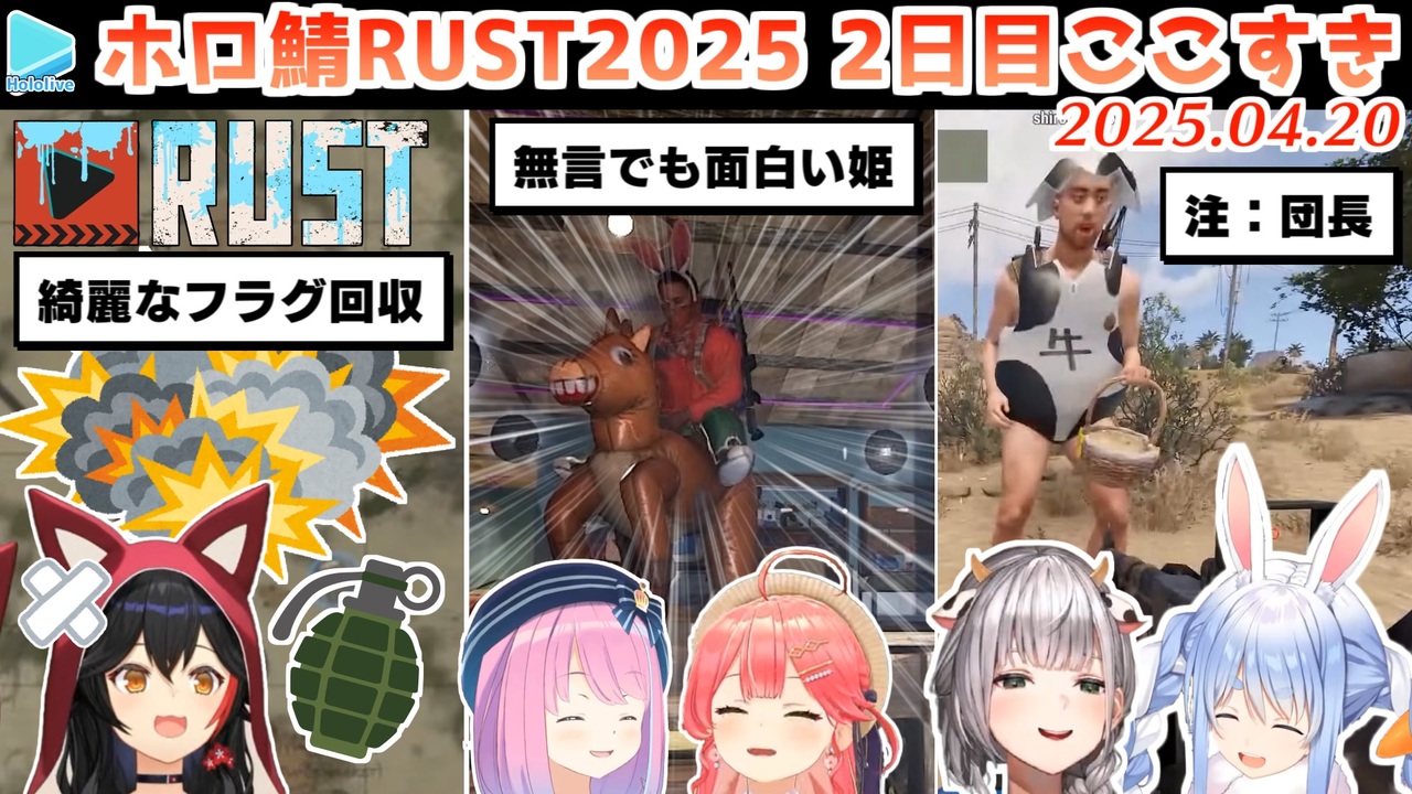 <a href="#" class="seekTime" data-seekTime="00:00" onclick="seekNicoPlayer('#00:00'); return false;">#00:00</a> たそビブデート<br><a href="#" class="seekTime" data-seekTime="01:46" onclick="seekNicoPlayer('#01:46'); return false;">#01:46</a> ぎりわるわため<br><a href="#" class="seekTime" data-seekTime="02:59" onclick="seekNicoPlayer('#02:59'); return false;">#02:59</a> フブミオみこスバでオイルリグ<br><a href="#" class="seekTime" data-seekTime="06:45" onclick="seekNicoPlayer('#06:45'); return false;">#06:45</a> こっそりフブミオ邸へ<br><a href="#" class="seekTime" data-seekTime="08:53" onclick="seekNicoPlayer('#08:53'); return false;">#08:53</a> トイレは回復します<br><a href="#" class="seekTime" data-seekTime="09:34" onclick="seekNicoPlayer('#09:34'); return false;">#09:34</a> あずぺこの戦利品<br><a href="#" class="seekTime" data-seekTime="10:56" onclick="seekNicoPlayer('#10:56'); return false;">#10:56</a> フラグ回収<br><a href="#" class="seekTime" data-seekTime="12:07" onclick="seekNicoPlayer('#12:07'); return false;">#12:07</a> 綺麗な足してるだろ<br><a href="#" class="seekTime" data-seekTime="13:25" onclick="seekNicoPlayer('#13:25'); return false;">#13:25</a> 無言でも面白い姫<br><a href="#" class="seekTime" data-seekTime="15:15" onclick="seekNicoPlayer('#15:15'); return false;">#15:15</a> ユニコーン<br><a href="#" class="seekTime" data-seekTime="17:24" onclick="seekNicoPlayer('#17:24'); return false;">#17:24</a> みこち墜落<br><a href="#" class="seekTime" data-seekTime="17:54" onclick="seekNicoPlayer('#17:54'); return false;">#17:54</a> ぺこらからノエルへプレゼント<br><br>元動画様はこちら<br>【holoRUST】Day2仙人のホロ鯖おさんぽRUST【ホロライブ/大空スバル】<br><a href="https://youtu.be/qZkkS2s8Nrg" target="_blank" rel="noopener nofollow">https://youtu.be/qZkkS2s8Nrg</a><br><br>【 holoRUST 】色々と大変なRUSTの世界で、平和にフブキと生活!【 ホロライブ / 大神ミオ 】<br><a href="https://youtu.be/djHm7lVCKhY" target="_blank" rel="noopener nofollow">https://youtu.be/djHm7lVCKhY</a><br><br>【 holoRUST 】holoRUST参戦!!!!!!!!!!PvE🔥DAY2【ホロライブ/さくらみこ】<br><a href="https://youtu.be/3MSM9J8aeVE" target="_blank" rel="noopener nofollow">https://youtu.be/3MSM9J8aeVE</a><br><br>【holoRUST】ホロライブサーバー上陸!DAY2 ぺこ!【ホロライブ/兎田ぺこら】<br><a href="https://youtu.be/IzCdmmbzX30" target="_blank" rel="noopener nofollow">https://youtu.be/IzCdmmbzX30</a><br><br>【 holoRUST 】フレア平和すぎるRUSTで新生活を送るってよ【不知火フレア/ホロライブ】<br><a href="https://youtu.be/RkZDaiYSmg0" target="_blank" rel="noopener nofollow">https://youtu.be/RkZDaiYSmg0</a><br><br>【holoRUST】記憶よ甦れ!RUSTきたああああああ!【天音かなた/ホロライブ】<br><a href="https://youtu.be/snCZALpaWCY" target="_blank" rel="noopener nofollow">https://youtu.be/snCZALpaWCY</a><br><br>【 holoRUST 】ベイさん(馬)とお散歩がしたい!!【角巻わため/ホロライブ4期生】<br><a href="https://youtu.be/-nR9untN_MU" target="_blank" rel="noopener nofollow">https://youtu.be/-nR9untN_MU</a><br><br>【holoRUST】ホロ鯖RUST参戦!!!!!DAY2【ホロライブ / AZKi】<br><a href="https://youtu.be/niSB3I1WMdY" target="_blank" rel="noopener nofollow">https://youtu.be/niSB3I1WMdY</a><br><br>【RUST】DAY 2 - 99% of Biboos quit before they win big<br><a href="https://youtu.be/sjx3S3kvKdo" target="_blank" rel="noopener nofollow">https://youtu.be/sjx3S3kvKdo</a><br /><span style="color: #b7b7b7; font-size: 10px;">ホロライブ切り抜き/なめたけ <a href="https://t.co/CBwJLnYR2c" target="_blank" rel="noopener nofollow">https://t.co/CBwJLnYR2c</a></span>