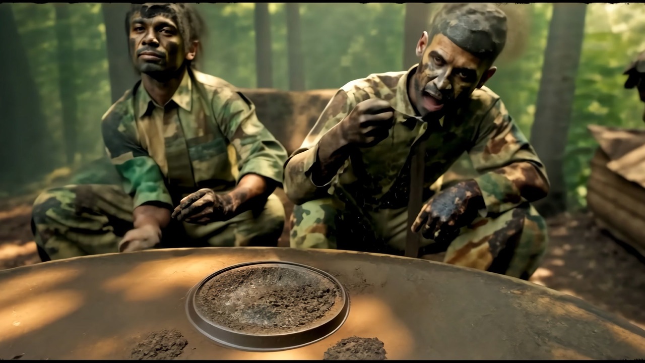 プレデターの襲撃に備えて体に泥を塗る特殊部隊員たち