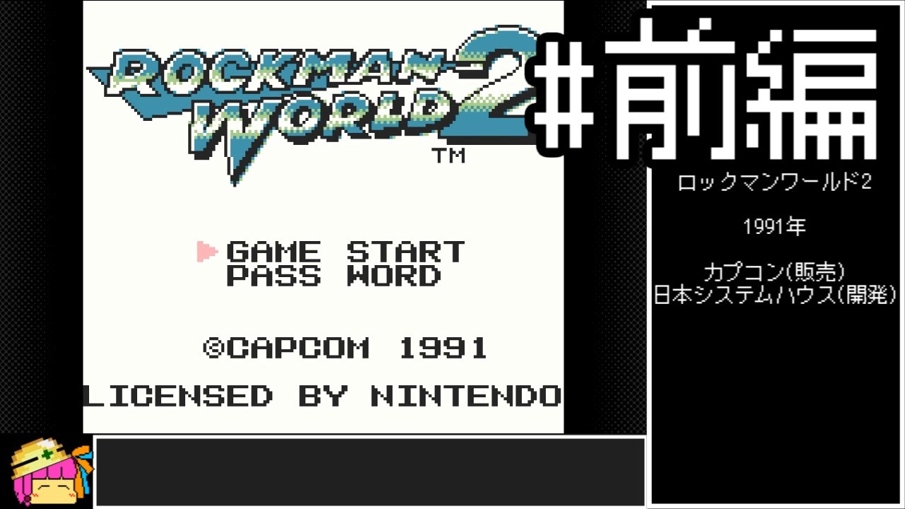 大カプコン展が結構楽しめたので初投稿です。<br>本動画は六波羅清昭様のボイスソフトゲームボーイ実況動画投稿祭2(<a href="https://www.nicovideo.jp/watch/sm44541643" class="watch">sm44541643</a>)に参加させていただいています。<br><br>ルール<br>①ノーダメージ<br>②パスワードが表示されてる画面でセーブ可<br><br>プレイ環境:SwitchOnline版<br><br>A.I.VOICE2 つくよみちゃん<br /><br>Part1リンク <a href="https://www.nicovideo.jp/mylist/39072031" target="_blank" rel="noopener">mylist/39072031</a><br>※前パート、次パートはシリーズから飛んでください