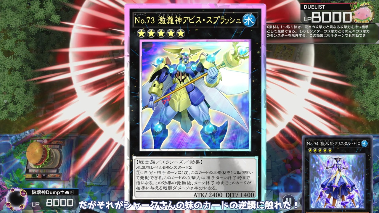 シャークデッキ強化の陰で、実は超強化されていた神《No.73 激瀧神アビス・スプラッシュ》。<br>これはもうデザイナーズコンボでしょう。<br><br>▼デッキレシピ<br> 1戦目:《シエンの間者》採用型<br><a href="https://www.db.yugioh-card.com/yugiohdb/member_deck.action?cgid=e4a0b52d3062ec11b60874c7d3f07738&dno=91&request_locale=ja" target="_blank" rel="noopener nofollow">https://www.db.yugioh-card.com/yugiohdb/member_deck.action?cgid=e4a0b52d3062ec11b60874c7d3f07738&dno=91&request_locale=ja</a><br><br>2戦目:《エクシーズ・リバーサル》採用型 <a href="https://www.db.yugioh-card.com/yugiohdb/member_deck.action?cgid=e4a0b52d3062ec11b60874c7d3f07738&dno=92&request_locale=ja" target="_blank" rel="noopener nofollow">https://www.db.yugioh-card.com/yugiohdb/member_deck.action?cgid=e4a0b52d3062ec11b60874c7d3f07738&dno=92&request_locale=ja</a><br><br>VOICEVOX:VOICEVOX:ナースロボ_タイプT<br>VOICEVOX:九州そら<br /><br>*いいね、フォロー等してもらえると喜びます。<br><br>Part1集<a href="https://www.nicovideo.jp/mylist/16658153" target="_blank" rel="noopener">mylist/16658153</a><br>単発集<a href="https://www.nicovideo.jp/mylist/14303522" target="_blank" rel="noopener">mylist/14303522</a><br>コミュニティco260029<br>⛏YouTube:<a href="https://www.youtube.com/channel/UCmLknQigwjfOQ1GcLmGhE0w" target="_blank" rel="noopener nofollow">https://www.youtube.com/channel/UCmLknQigwjfOQ1GcLmGhE0w</a><br>⛏ツイッター: <a href="https://twitter.com/Dump29" target="_blank" rel="noopener nofollow">https://twitter.com/Dump29</a>