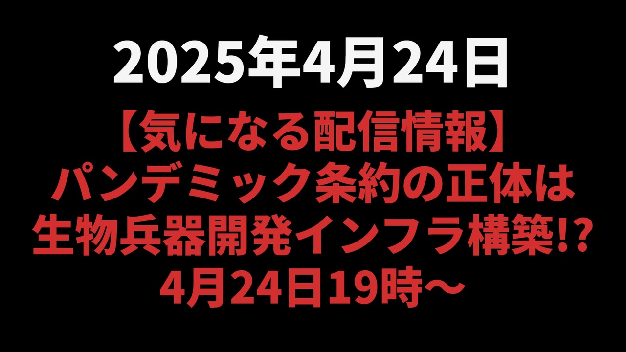 我那覇真子チャンネルが4月24日19時より緊急生配信!<br><a href="https://x.gd/m0K3X" target="_blank" rel="noopener nofollow">https://x.gd/m0K3X</a><br><br>WHO総会を目前に控え、パンデミック条約の隠された意図を徹底追及。<br>ジャーナリスト我那覇真子が、国際的な感染症対策の専門家ジェームズ・ログスキー氏に独占インタビュー。<br><br>条約の裏に潜む「生物兵器開発インフラ」の構築とは何か?<br>グローバルな動きが日本に与える影響とは?<br><br>見逃せない真相に迫る一時間。<br><br><br>◆ 今回の台本<br><a href="https://keiichiro8140.hatenablog.com/entry/20250424005" target="_blank" rel="noopener nofollow">https://keiichiro8140.hatenablog.com/entry/20250424005</a><br><br><br>我那覇真子<br>パンデミック条約<br>WHO<br>生物兵器<br>JamesRoguski<br>生物兵器開発インフラ<br>グローバリスト<br>ワクチン問題<br>日本独立<br>ニュース<br>気になったニュース<br><br><br>マイリンク<br><a href="https://lit.link/keiichiro8140" target="_blank" rel="noopener nofollow">https://lit.link/keiichiro8140</a><br><br />著作権、肖像権に配慮して作成しております。<br><br>◆気になったニュースの台本!?<br>メモ代わりに作った台本をそのままあげてます<br><a href="https://keiichiro8140.hatenablog.com/." target="_blank" rel="noopener nofollow">https://keiichiro8140.hatenablog.com/.</a><br><br><br>ここからはシリーズ紹介<br><br><br>◆ ワクチン解毒・デトックス<br><a href="https://x.gd/fZweg" target="_blank" rel="noopener nofollow">https://x.gd/fZweg</a><br><br>◆ウイリアム・マキス博士のがん治療(イベルメクチン・フェンベンダゾール等)<br><a href="https://x.gd/AtFYS" target="_blank" rel="noopener nofollow">https://x.gd/AtFYS</a><br><br>◆予防接種健康被害救済制度<br><a href="https://x.gd/0xK9x" target="_blank" rel="noopener nofollow">https://x.gd/0xK9x</a><br><br>◆気になったニュース #1501~<br><br>◆ 【ショートver】気になったニュース<br><a href="https://x.gd/7MxXC" target="_blank" rel="noopener nofollow">https://x.gd/7MxXC</a><br><br>◆ 気になったニュース #1001~<br><a href="https://x.gd/Lp8gv" target="_blank" rel="noopener nofollow">https://x.gd/Lp8gv</a><br><br>◆ 気になったニュース #501~<br><a href="https://x.gd/EmbS4" target="_blank" rel="noopener nofollow">https://x.gd/EmbS4</a><br><br>◆ 気になったニュース #1~#500<br><a href="https://x.gd/uPhNb" target="_blank" rel="noopener nofollow">https://x.gd/uPhNb</a><br><br>◆ X(旧Twitter)・テレグラムで気になった情報<br><a href="https://x.gd/YG6FT" target="_blank" rel="noopener nofollow">https://x.gd/YG6FT</a><br><br>◆ 日比谷5万人パレードデ⚪生放送アーカイブ動画<br><a href="https://x.gd/3CHJv" target="_blank" rel="noopener nofollow">https://x.gd/3CHJv</a><br><br>◆日比谷5万人パレード⚪モのマイリスト作ってみました<br><a href="https://nico.ms/mylist/76828848?ref=sp_other" target="_blank" rel="noopener nofollow">https://nico.ms/mylist/76828848?ref=sp_other</a><br><br>◆3.30 令和の百姓⚪⚪<br><a href="https://www.nicovideo.jp/series/511791?ref=garage_share_other" target="_blank" rel="noopener nofollow">https://www.nicovideo.jp/series/511791?ref=garage_share_other</a><br><br>◆ 及川幸久さんの【XNEWS】シリーズ<br><a href="https://x.gd/3k78K" target="_blank" rel="noopener nofollow">https://x.gd/3k78K</a><br><br>◆これまでの動画<a href="https://x.gd/sPXoJ" target="_blank" rel="noopener nofollow">https://x.gd/sPXoJ</a><br><br>◆もしも(BAN)の時のためのマイリンク集<a href="https://lit.link/K-16_News44" target="_blank" rel="noopener nofollow">https://lit.link/K-16_News44</a><br><br>