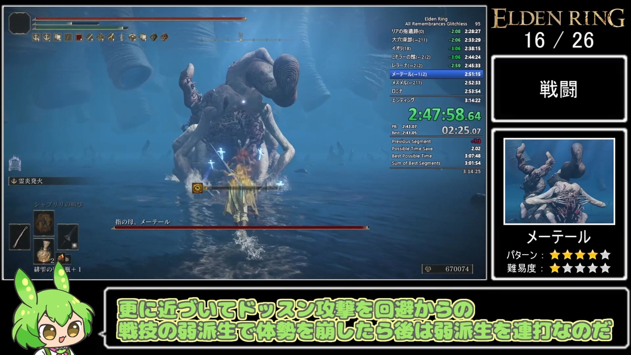 Switch2の抽選に落選して悲しいので初投稿です。<br><br>ver1.16です。DLCを含んだ全追憶ボスを倒します。RTAは3時間40分39秒です。<br>※ Part7からPart6に変更しました!<br><br>前 → <a href="https://www.nicovideo.jp/watch/sm44888180" class="watch">sm44888180</a><br>次 → <a href="https://www.nicovideo.jp/watch/sm44938418" class="watch">sm44938418</a><br><br>元動画 <a href="https://www.youtube.com/watch?v=5hcKFlKnuyE" target="_blank" rel="noopener nofollow">https://www.youtube.com/watch?v=5hcKFlKnuyE</a><br>Twitter <a href="https://twitter.com/Hamaa7_" target="_blank" rel="noopener nofollow">https://twitter.com/Hamaa7_</a><br><br>Part1まとめ <a href="https://www.nicovideo.jp/mylist/73580294" target="_blank" rel="noopener nofollow">https://www.nicovideo.jp/mylist/73580294</a><br><br>VOICEVOX:ずんだもん <a href="https://voicevox.hiroshiba.jp" target="_blank" rel="noopener nofollow">https://voicevox.hiroshiba.jp</a><br>ずんだもん立ち絵 <a href="https://seiga.nicovideo.jp/seiga/im10887998" target="_blank" rel="noopener nofollow">https://seiga.nicovideo.jp/seiga/im10887998</a>