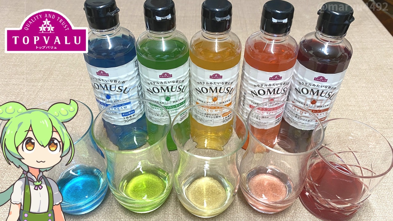トップバリュでは、朝・昼・夜と、お酢を美味しく手軽に楽しむ商品を<br>2025年3月から展開しており<br>以前紹介した牛乳で作るフルーチェっぽいのもその1つとなります。<br>今回は、カクテルのようにりんご酢を水や炭酸水で割って楽しむ<br>NOMUSU(のむ酢)というシリーズを紹介します。<br><br><br>【関連動画】<br>トップバリュの「りんご酢と国産果汁で作ったフルーチェっぽいやつ(各278円)」2025.04.07<br><a href="https://www.nicovideo.jp/watch/sm44852931" target="_blank" rel="noopener nofollow">https://www.nicovideo.jp/watch/sm44852931</a><br>トップバリュの赤いヤツ「商品名がちょっと変わったお高めのジュース」2024.05.21<br><a href="https://www.nicovideo.jp/watch/sm43793917" target="_blank" rel="noopener nofollow">https://www.nicovideo.jp/watch/sm43793917</a><br><br>【参考】<br>NOMUSU(のむ酢)ガルフストリーム ※本体価格278円/300ml(トップバリュ)<br><a href="https://www.topvalu.net/items/detail/4549414668285/" target="_blank" rel="noopener nofollow">https://www.topvalu.net/items/detail/4549414668285/</a><br>大興産業株式会社<br><a href="http://udurasu.co.jp/" target="_blank" rel="noopener nofollow">http://udurasu.co.jp/</a><br>“朝・昼・夜”を彩る新感覚のお酢ライフ <br>お酢をおいしく手軽に楽しむ新商品を発売 2025.03.06(PR TIMES)<br><a href="https://prtimes.jp/main/html/rd/p/000004935.000007505.html" target="_blank" rel="noopener nofollow">https://prtimes.jp/main/html/rd/p/000004935.000007505.html</a><br><br>【使用した素材】(※敬称略) <br>(合成音声)VOICEVOX/ずんだもん/四国めたん/<br><a href="https://voicevox.hiroshiba.jp/" target="_blank" rel="noopener nofollow">https://voicevox.hiroshiba.jp/</a> <br>(立ち絵)坂本アヒル<br> <a href="https://seiga.nicovideo.jp/seiga/im10788496?track" target="_blank" rel="noopener nofollow">https://seiga.nicovideo.jp/seiga/im10788496?track</a><br>(楽曲)甘茶の音楽工房/「楽しい麦畑」「フルーツパフェ」「お城の舞踏会」<br><a href="https://amachamusic.chagasi.com/" target="_blank" rel="noopener nofollow">https://amachamusic.chagasi.com/</a>