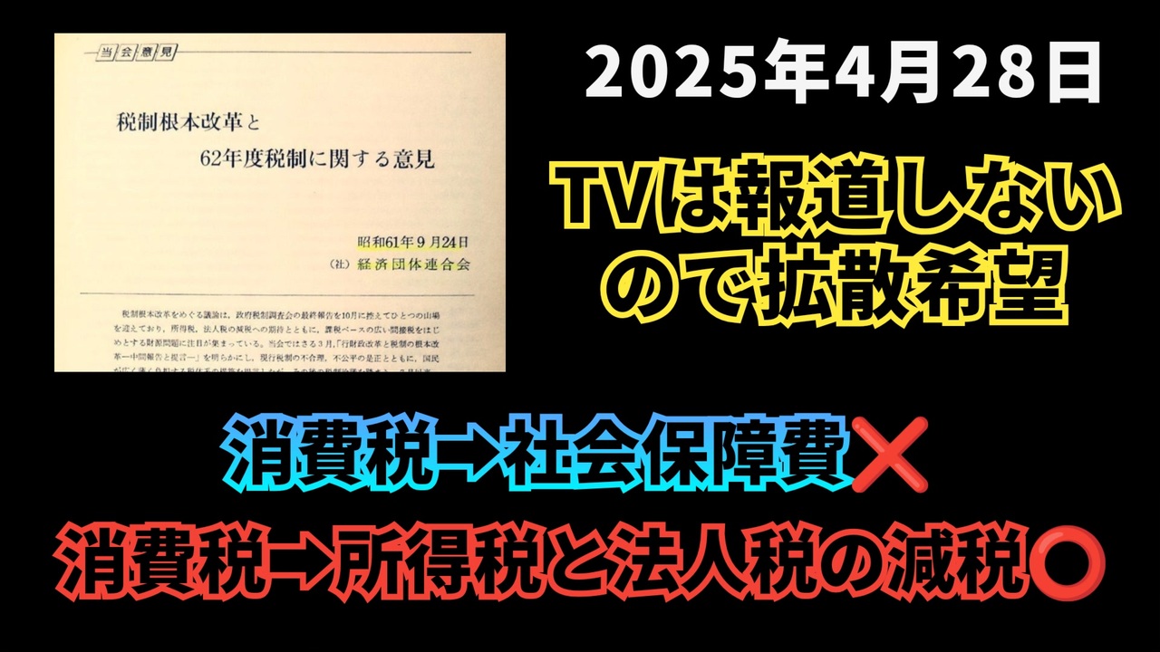 ◆消費税はなぜ導入されたのか?経団連が求めた本当の理由<br><a href="https://x.com/Bruce_SUNNY/status/1916009928134955043?t=OwOlLyEDEdFD3XQLh-xaOg&s=19" target="_blank" rel="noopener nofollow">https://x.com/Bruce_SUNNY/status/1916009928134955043?t=OwOlLyEDEdFD3XQLh-xaOg&s=19</a><br><br>消費税の誕生には、意外な背景がありました。1986年、経団連は政府に対し「所得税・法人税を減税するために消費税を導入せよ」と強く提言。財源確保と税負担の公平化、財政安定を名目に、実際には国民に新たな負担を課す形となったのです。1989年、消費税は3%で導入され、現在の税制の基盤となりました。本当の目的を知ると、私たちの見方が変わるかもしれません。<br><br><br>◆ 今回の台本<br><a href="https://keiichiro8140.hatenablog.com/entry/20250428001" target="_blank" rel="noopener nofollow">https://keiichiro8140.hatenablog.com/entry/20250428001</a><br><br><br>所得税<br>法人税<br>消費税<br>経団連<br>財政基盤<br>税制改革<br>税負担構造<br>減税政策<br>財源確保<br>ニュース<br>気になったニュース<br><br><br>マイリンク<br><a href="https://lit.link/keiichiro8140" target="_blank" rel="noopener nofollow">https://lit.link/keiichiro8140</a><br><br><br />著作権、肖像権に配慮して作成しております。<br><br>◆気になったニュースの台本!?<br>メモ代わりに作った台本をそのままあげてます<br><a href="https://keiichiro8140.hatenablog.com/." target="_blank" rel="noopener nofollow">https://keiichiro8140.hatenablog.com/.</a><br><br><br>ここからはシリーズ紹介<br><br><br>◆ ワクチン解毒・デトックス<br><a href="https://x.gd/fZweg" target="_blank" rel="noopener nofollow">https://x.gd/fZweg</a><br><br>◆ウイリアム・マキス博士のがん治療(イベルメクチン・フェンベンダゾール等)<br><a href="https://x.gd/AtFYS" target="_blank" rel="noopener nofollow">https://x.gd/AtFYS</a><br><br>◆予防接種健康被害救済制度<br><a href="https://x.gd/0xK9x" target="_blank" rel="noopener nofollow">https://x.gd/0xK9x</a><br><br>◆気になったニュース #1501~<br><br>◆ 【ショートver】気になったニュース<br><a href="https://x.gd/7MxXC" target="_blank" rel="noopener nofollow">https://x.gd/7MxXC</a><br><br>◆ 気になったニュース #1001~<br><a href="https://x.gd/Lp8gv" target="_blank" rel="noopener nofollow">https://x.gd/Lp8gv</a><br><br>◆ 気になったニュース #501~<br><a href="https://x.gd/EmbS4" target="_blank" rel="noopener nofollow">https://x.gd/EmbS4</a><br><br>◆ 気になったニュース #1~#500<br><a href="https://x.gd/uPhNb" target="_blank" rel="noopener nofollow">https://x.gd/uPhNb</a><br><br>◆ X(旧Twitter)・テレグラムで気になった情報<br><a href="https://x.gd/YG6FT" target="_blank" rel="noopener nofollow">https://x.gd/YG6FT</a><br><br>◆ 日比谷5万人パレードデ⚪生放送アーカイブ動画<br><a href="https://x.gd/3CHJv" target="_blank" rel="noopener nofollow">https://x.gd/3CHJv</a><br><br>◆日比谷5万人パレード⚪モのマイリスト作ってみました<br><a href="https://nico.ms/mylist/76828848?ref=sp_other" target="_blank" rel="noopener nofollow">https://nico.ms/mylist/76828848?ref=sp_other</a><br><br>◆3.30 令和の百姓⚪⚪<br><a href="https://www.nicovideo.jp/series/511791?ref=garage_share_other" target="_blank" rel="noopener nofollow">https://www.nicovideo.jp/series/511791?ref=garage_share_other</a><br><br>◆ 及川幸久さんの【XNEWS】シリーズ<br><a href="https://x.gd/3k78K" target="_blank" rel="noopener nofollow">https://x.gd/3k78K</a><br><br>◆これまでの動画<a href="https://x.gd/sPXoJ" target="_blank" rel="noopener nofollow">https://x.gd/sPXoJ</a><br><br>◆もしも(BAN)の時のためのマイリンク集<a href="https://lit.link/K-16_News44" target="_blank" rel="noopener nofollow">https://lit.link/K-16_News44</a><br><br>