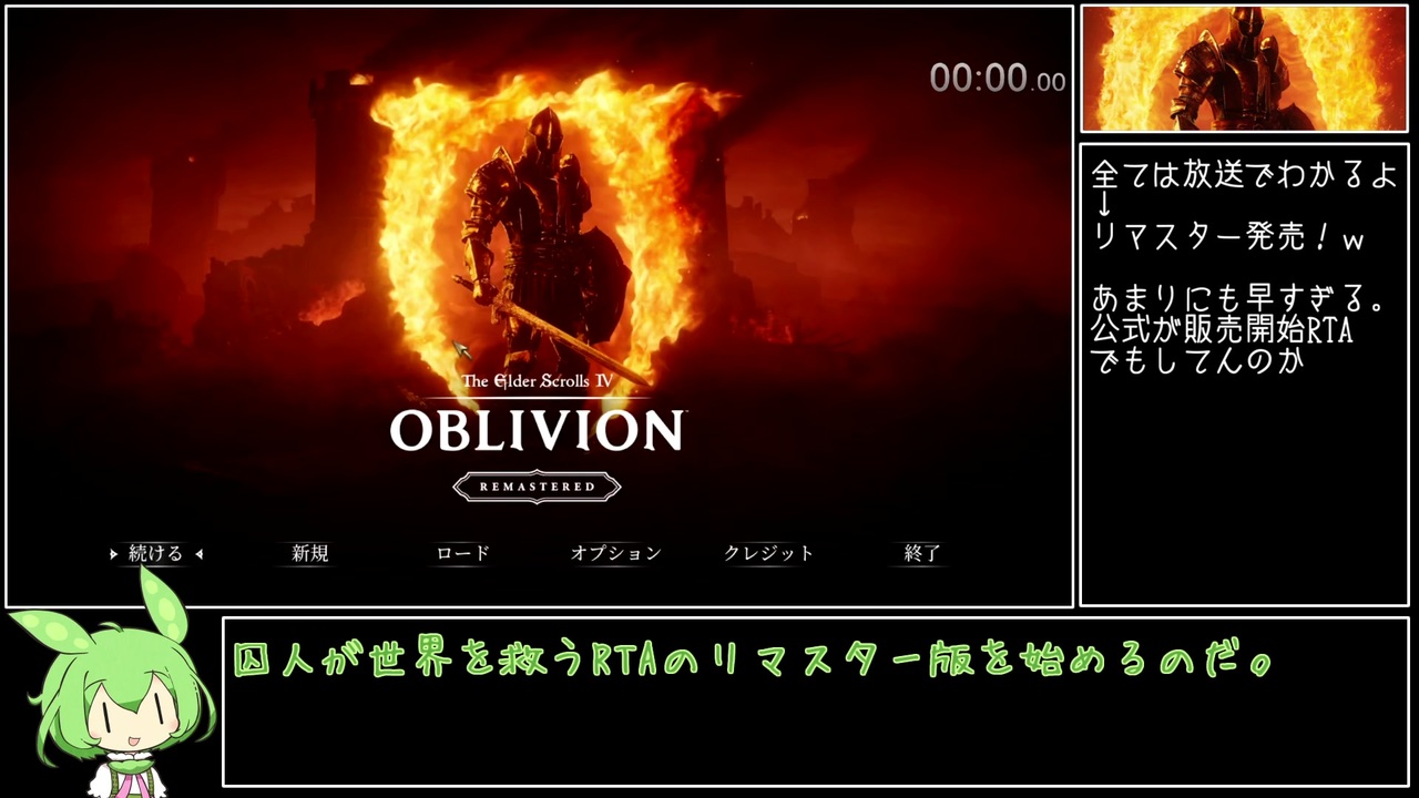 めちゃくちゃお久しぶりです。オブリのリマスターが突如配信されたせいで、急遽舞い戻ってきました。<br>というか普通にプレイするつもりだったのに、RTA出来る可能性を見出してしまったので走ることになりました。<br>どうやら私は苦行とRTAからは逃げられない運命のようです。<br>つべ版→<a href="https://www.youtube.com/watch?v=ikPIM7eqFA4" target="_blank" rel="noopener nofollow">https://www.youtube.com/watch?v=ikPIM7eqFA4</a><br><br>VOICEVOX→<a href="https://voicevox.hiroshiba.jp" target="_blank" rel="noopener nofollow">https://voicevox.hiroshiba.jp</a><br>立ち絵→<a href="https://seiga.nicovideo.jp/user/illust/20132633" target="_blank" rel="noopener nofollow">https://seiga.nicovideo.jp/user/illust/20132633</a><br><br>旧Oblivion本編Any%→<a href="https://www.nicovideo.jp/watch/sm41056043" target="_blank" rel="noopener nofollow">https://www.nicovideo.jp/watch/sm41056043</a><br>DDDA本編NG+(元世界3位)→<a href="https://nico.ms/sm41025071" target="_blank" rel="noopener nofollow">https://nico.ms/sm41025071</a><br>DDDA黒呪島NG+(元世界記録)→<a href="https://nico.ms/sm42028908" target="_blank" rel="noopener nofollow">https://nico.ms/sm42028908</a><br>投稿動画→<a href="https://www.nicovideo.jp/mylist/73678657" target="_blank" rel="noopener nofollow">https://www.nicovideo.jp/mylist/73678657</a>