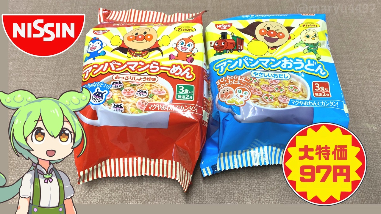 ビッグに行ったら入り口付近の目立つ場所に<br>アンパンマンラーメンとおうどんがあり、値段を見ると100円くらい。<br>これは安いのかなと試しに買ってみることにしました。<br><br><br>【関連動画】<br>日清食品のノンフライカップ麺「麺職人 丸鶏ガラ醤油(128円)」2025.02.06<br><a href="https://www.nicovideo.jp/watch/sm44608424" target="_blank" rel="noopener nofollow">https://www.nicovideo.jp/watch/sm44608424</a><br><br>【参考】<br>「アンパンマン」シリーズ4品 (2月17日発売)2025.02.03(日清食品)<br><a href="https://www.nissin.com/jp/company/news/13158/" target="_blank" rel="noopener nofollow">https://www.nissin.com/jp/company/news/13158/</a><br>やなせたかしのあんぱんまん1973(全6巻)(フレーベル館出版サイト)<br><a href="https://book.froebel-kan.co.jp/book/detail/9784577051290" target="_blank" rel="noopener nofollow">https://book.froebel-kan.co.jp/book/detail/9784577051290</a><br><br>【使用した素材】(※敬称略) <br>(合成音声)VOICEVOX/ずんだもん/四国めたん/<br><a href="https://voicevox.hiroshiba.jp/" target="_blank" rel="noopener nofollow">https://voicevox.hiroshiba.jp/</a> <br>(立ち絵)坂本アヒル<br> <a href="https://seiga.nicovideo.jp/seiga/im10788496?track" target="_blank" rel="noopener nofollow">https://seiga.nicovideo.jp/seiga/im10788496?track</a><br>(楽曲)甘茶の音楽工房/「楽しい麦畑」「フルーツパフェ」「お城の舞踏会」<br><a href="https://amachamusic.chagasi.com/" target="_blank" rel="noopener nofollow">https://amachamusic.chagasi.com/</a>