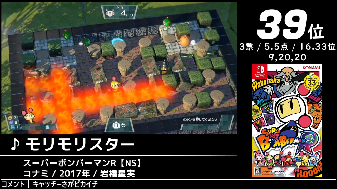 47位~23位の27曲を収録しています。<br>2024年11月1日~2025年1月3日にかけて開催された「第3回みんなで掘り出すゲーム音楽ベスト100」の結果を動画化したものです。<span style="font-size: 10px;">集計人≠動画制作者</span><br> <br> <br>↓全体の結果はこちら↓<br> <a href="https://w.atwiki.jp/gamemusicbest100/pages/10781.html" target="_blank" rel="noopener nofollow">https://w.atwiki.jp/gamemusicbest100/pages/10781.html</a><br><br><br>※収録時間が5分以上の楽曲です。ご留意ください。<br><a href="#" class="seekTime" data-seekTime="44:56" onclick="seekNicoPlayer('#44:56'); return false;">#44:56</a>~<br><br><br>【投票者コメントについて】<br>原則としてすべてのコメントを掲載するつもりですが、一部のものは独断で省略させていただくことがあります。ご了承ください。<br> <br> <br>Part.10→<a href="https://www.nicovideo.jp/watch/sm44912157" class="watch">sm44912157</a><br>Part.12→<a href="https://www.nicovideo.jp/watch/sm44964350" class="watch">sm44964350</a><br>第3回掘り出しまとめ→<a href="https://www.nicovideo.jp/mylist/77530184" target="_blank" rel="noopener">mylist/77530184</a><br> <br> <br>【ショートカット】<br>①<a href="#" class="seekTime" data-seekTime="0:35" onclick="seekNicoPlayer('#0:35'); return false;">#0:35</a> / ②<a href="#" class="seekTime" data-seekTime="2:59" onclick="seekNicoPlayer('#2:59'); return false;">#2:59</a> / ③<a href="#" class="seekTime" data-seekTime="6:04" onclick="seekNicoPlayer('#6:04'); return false;">#6:04</a> / ④<a href="#" class="seekTime" data-seekTime="8:33" onclick="seekNicoPlayer('#8:33'); return false;">#8:33</a> / ⑤<a href="#" class="seekTime" data-seekTime="11:27" onclick="seekNicoPlayer('#11:27'); return false;">#11:27</a> / ⑥<a href="#" class="seekTime" data-seekTime="13:18" onclick="seekNicoPlayer('#13:18'); return false;">#13:18</a> / ⑦<a href="#" class="seekTime" data-seekTime="15:53" onclick="seekNicoPlayer('#15:53'); return false;">#15:53</a> / ⑧<a href="#" class="seekTime" data-seekTime="19:23" onclick="seekNicoPlayer('#19:23'); return false;">#19:23</a> / ⑨<a href="#" class="seekTime" data-seekTime="22:22" onclick="seekNicoPlayer('#22:22'); return false;">#22:22</a> / ⑩<a href="#" class="seekTime" data-seekTime="25:46" onclick="seekNicoPlayer('#25:46'); return false;">#25:46</a> / ⑪<a href="#" class="seekTime" data-seekTime="28:19" onclick="seekNicoPlayer('#28:19'); return false;">#28:19</a> / ⑫<a href="#" class="seekTime" data-seekTime="31:21" onclick="seekNicoPlayer('#31:21'); return false;">#31:21</a> / ⑬<a href="#" class="seekTime" data-seekTime="34:31" onclick="seekNicoPlayer('#34:31'); return false;">#34:31</a> / ⑭<a href="#" class="seekTime" data-seekTime="36:57" onclick="seekNicoPlayer('#36:57'); return false;">#36:57</a> / ⑮<a href="#" class="seekTime" data-seekTime="40:18" onclick="seekNicoPlayer('#40:18'); return false;">#40:18</a> / ⑯<a href="#" class="seekTime" data-seekTime="44:56" onclick="seekNicoPlayer('#44:56'); return false;">#44:56</a> / ⑰<a href="#" class="seekTime" data-seekTime="50:42" onclick="seekNicoPlayer('#50:42'); return false;">#50:42</a> / ⑱<a href="#" class="seekTime" data-seekTime="52:48" onclick="seekNicoPlayer('#52:48'); return false;">#52:48</a> / ⑲<a href="#" class="seekTime" data-seekTime="54:52" onclick="seekNicoPlayer('#54:52'); return false;">#54:52</a> / ⑳<a href="#" class="seekTime" data-seekTime="58:31" onclick="seekNicoPlayer('#58:31'); return false;">#58:31</a> / ㉑<a href="#" class="seekTime" data-seekTime="60:41" onclick="seekNicoPlayer('#60:41'); return false;">#60:41</a> / ㉒<a href="#" class="seekTime" data-seekTime="65:29" onclick="seekNicoPlayer('#65:29'); return false;">#65:29</a> / ㉓<a href="#" class="seekTime" data-seekTime="68:13" onclick="seekNicoPlayer('#68:13'); return false;">#68:13</a> / ㉔<a href="#" class="seekTime" data-seekTime="71:14" onclick="seekNicoPlayer('#71:14'); return false;">#71:14</a> / ㉕<a href="#" class="seekTime" data-seekTime="73:44" onclick="seekNicoPlayer('#73:44'); return false;">#73:44</a> / ㉖<a href="#" class="seekTime" data-seekTime="76:37" onclick="seekNicoPlayer('#76:37'); return false;">#76:37</a> / ㉗<a href="#" class="seekTime" data-seekTime="79:29" onclick="seekNicoPlayer('#79:29'); return false;">#79:29</a>