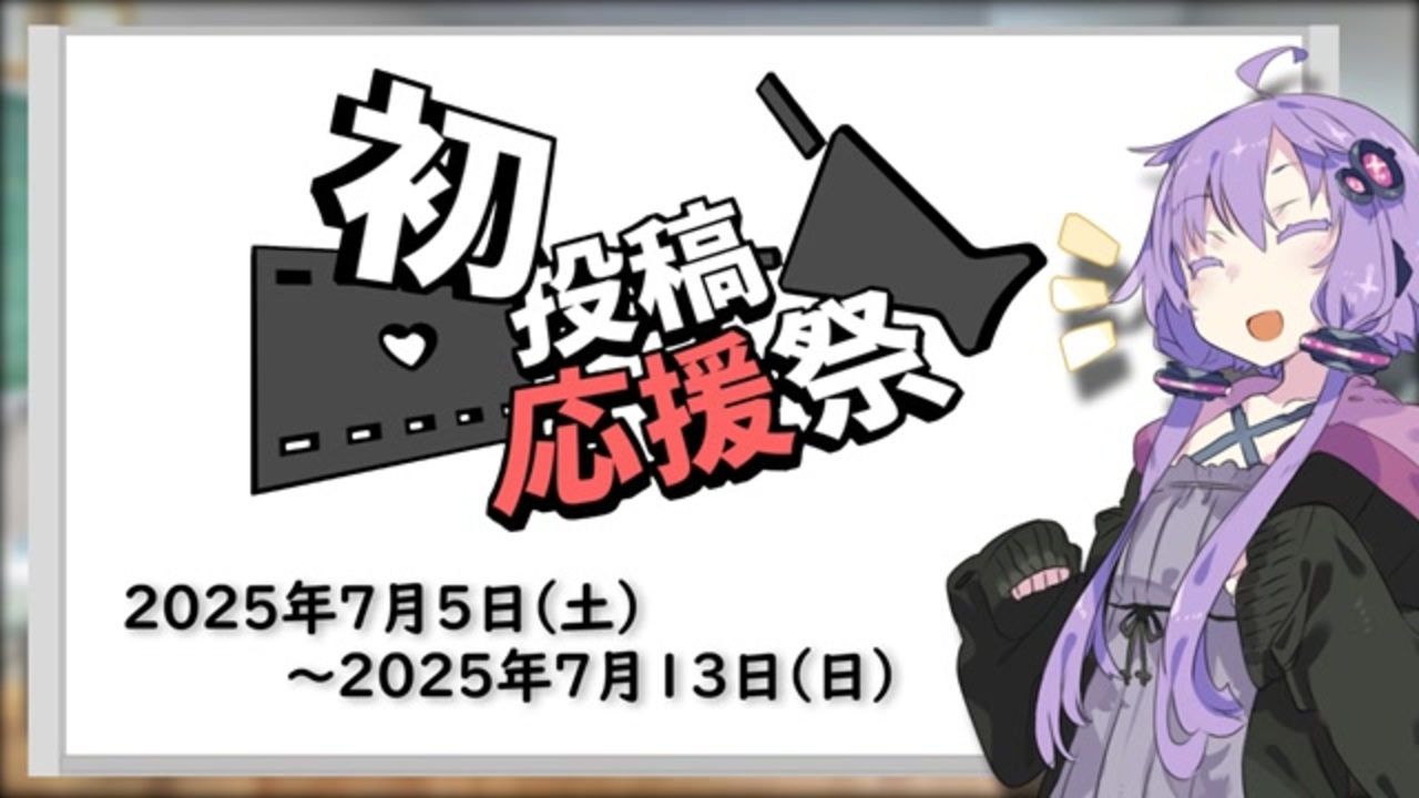 お借りした素材はコンテンツツリーにて<br><br>【開催期間】<br>2025/7/5(土) ~7/13(日) <br><br>【参加タグ】<br>2025初投稿動画応援祭(必ずタグをロックしてください)<br><br>────────────────────────────────<br> 2025初投稿動画応援祭 告知動画<br>これ<br><br>2025初投稿動画応援祭 企画概要(note)<br><a href="https://note.com/yukariunoka/n/neb3ffe259546" target="_blank" rel="noopener nofollow">https://note.com/yukariunoka/n/neb3ffe259546</a><br><br>初投稿動画応援祭ロゴ(静画)<br><a href="https://seiga.nicovideo.jp/seiga/im11592821" target="_blank" rel="noopener nofollow">https://seiga.nicovideo.jp/seiga/im11592821</a><br><br>────────────────────────────────<br>2025初投稿動画祭 告知動画<br><a href="https://www.nicovideo.jp/watch/sm44936211" target="_blank" rel="noopener nofollow">https://www.nicovideo.jp/watch/sm44936211</a><br><br>2025初投稿動画祭 企画概要(note)<br><a href="https://note.com/yukun1007/n/nd3237b9b3898" target="_blank" rel="noopener nofollow">https://note.com/yukun1007/n/nd3237b9b3898</a><br><br>初投稿動画祭ロゴ(静画)<br><a href="https://seiga.nicovideo.jp/seiga/im10948774" target="_blank" rel="noopener nofollow">https://seiga.nicovideo.jp/seiga/im10948774</a><br><br>────────────────────────────────<br>主催<br><br>灯火 <a href="https://x.com/YukariUnoka" target="_blank" rel="noopener nofollow">https://x.com/YukariUnoka</a><br>ぐっちー <a href="https://x.com/gtzosns" target="_blank" rel="noopener nofollow">https://x.com/gtzosns</a><br><br>※問い合わせ先はnoteに記載<br>────────────────────────────────<br>過去の初投稿動画祭・初投稿動画応援祭の参加動画が見たい方はこちら<br><a href="https://www.nicovideo.jp/mylist/77927304" target="_blank" rel="noopener">mylist/77927304</a>