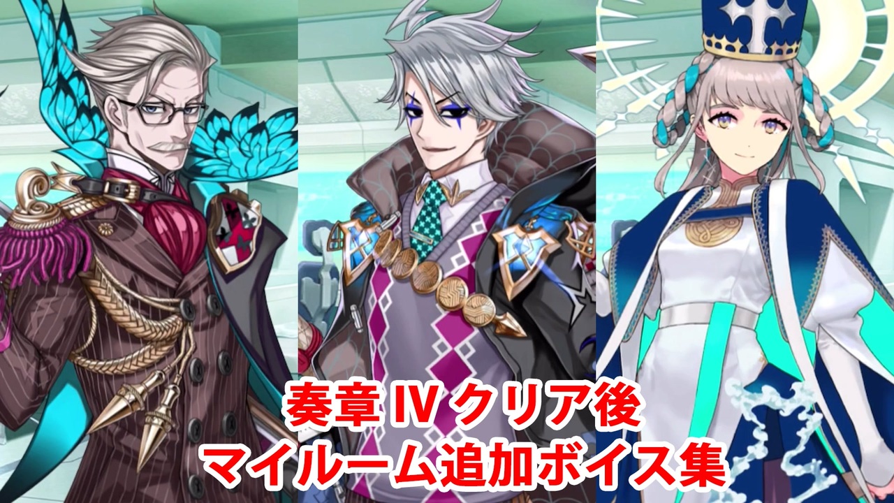 この動画は「奏章Ⅳ 人類裁決法廷 トリニティ・メタトロニオス」のネタバレを含むのでご注意ください。<br><br>「奏章Ⅳ 人類裁決法廷 トリニティ・メタトロニオス」クリア後に開放される<br>ジェームズ・モリアーティ〔ルーラー〕(CV:伊東健人)、ジェームズ・モリアーティ(CV:土師孝也)、女教皇ヨハンナ(CV:日岡なつみ)のマイルーム会話のまとめです。<br><br>モリアーティ×2はダンテ宛、ヨハンナはヤング・モリアーティ宛になります。<br><br>YouTube版はこちら<br><a href="https://www.youtube.com/watch?v=X3qqXlk648E" target="_blank" rel="noopener nofollow">https://www.youtube.com/watch?v=X3qqXlk648E</a><br><br />投稿済ボイス集→<a href="https://www.nicovideo.jp/mylist/57873980" target="_blank" rel="noopener">mylist/57873980</a>、<a href="https://www.nicovideo.jp/mylist/68037946" target="_blank" rel="noopener">mylist/68037946</a>、<a href="https://www.nicovideo.jp/mylist/76708013" target="_blank" rel="noopener">mylist/76708013</a>