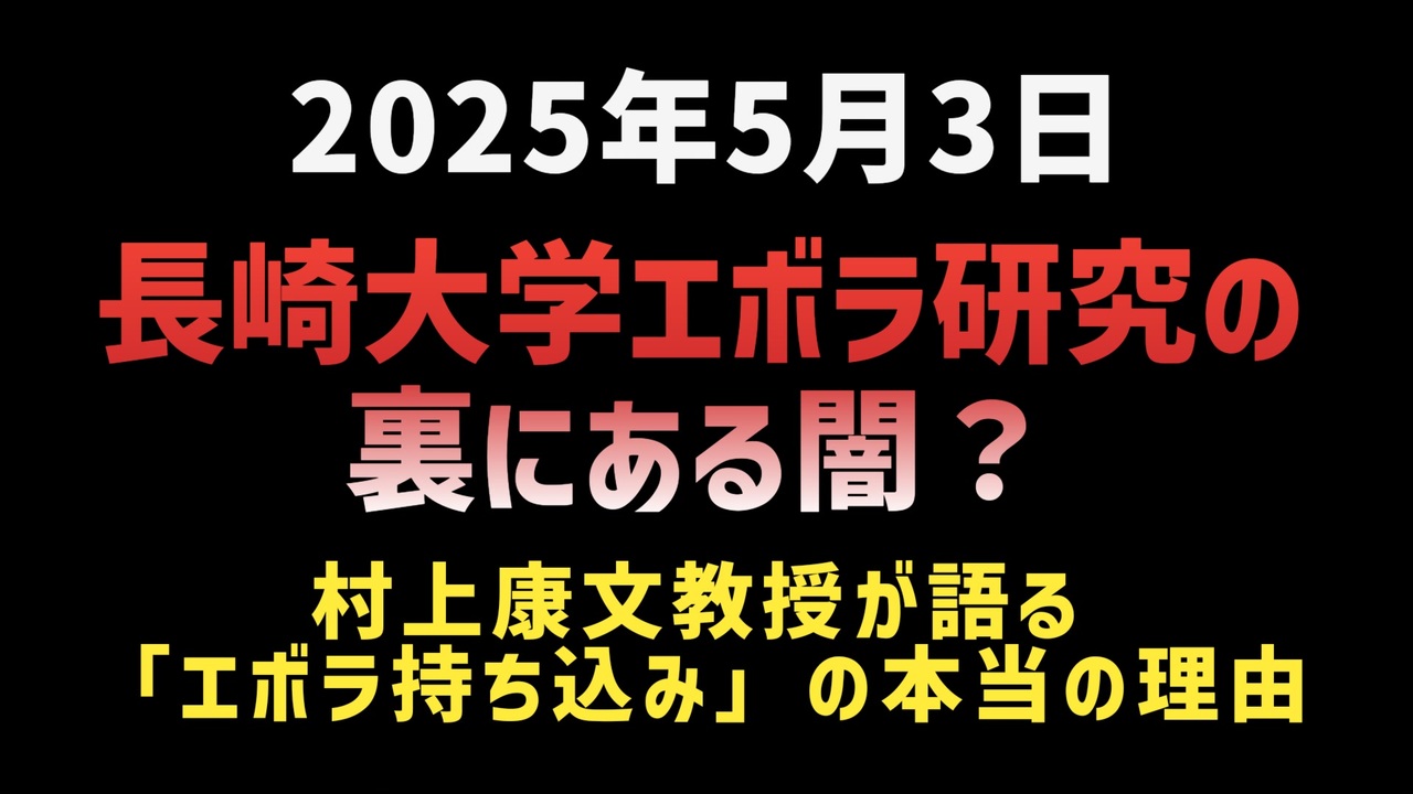 温かいコメントに荒んだ心が癒されます<br>ありがとうございます🙏<br><br><br>◆長崎大学BSL4施設の裏にある闇?村上教授が語る「エボラ持ち込み」の本当の理由とは<br><a href="https://t.co/QcNtv3ETvb" target="_blank" rel="noopener nofollow">https://t.co/QcNtv3ETvb</a><br><a href="https://t.co/S2Jg0Yni73" target="_blank" rel="noopener nofollow">https://t.co/S2Jg0Yni73</a><br><br><br>東京理科大学・村上康文教授が語ったのは、衝撃の“エボラ持ち込み計画”の真相。<br>教授は「日本でエボラを研究する意味はない」と断言。その理由は、感染が広がりにくく、ワクチンよりも隔離が有効だから。<br>ではなぜ、長崎大学にBSL4施設を作り、エボラウイルスをわざわざ日本に持ち込むのか?<br>その答えは「施設を使うために研究する」という逆転の発想。<br>感染症対策ではなく、研究費と施設維持のために行われる“科学の暴走”とは──。<br>あなたの知らない真実がここにあります。<br><br><br>◆ 今回の台本<br><a href="https://keiichiro8140.hatenablog.com/entry/20250503002" target="_blank" rel="noopener nofollow">https://keiichiro8140.hatenablog.com/entry/20250503002</a><br><br><br>村上康文<br>エボラ出血熱<br>BSL4<br>長崎大学<br>感染症利権<br>税金の使い道<br>研究費の闇<br>科学の暴走<br>日本に持ち込まれる危険<br>ニュース<br>気になったニュース<br><br><br>マイリンク<br><a href="https://lit.link/keiichiro8140" target="_blank" rel="noopener nofollow">https://lit.link/keiichiro8140</a><br><br><br />著作権、肖像権に配慮して作成しております。<br><br>◆気になったニュースの台本!?<br>メモ代わりに作った台本をそのままあげてます<br><a href="https://keiichiro8140.hatenablog.com/." target="_blank" rel="noopener nofollow">https://keiichiro8140.hatenablog.com/.</a><br><br><br>ここからはシリーズ紹介<br><br><br>◆ ワクチン解毒・デトックス<br><a href="https://x.gd/fZweg" target="_blank" rel="noopener nofollow">https://x.gd/fZweg</a><br><br>◆ウイリアム・マキス博士のがん治療(イベルメクチン・フェンベンダゾール等)<br><a href="https://x.gd/AtFYS" target="_blank" rel="noopener nofollow">https://x.gd/AtFYS</a><br><br>◆予防接種健康被害救済制度<br><a href="https://x.gd/0xK9x" target="_blank" rel="noopener nofollow">https://x.gd/0xK9x</a><br><br>◆気になったニュース #1501~<br><br>◆ 【ショートver】気になったニュース<br><a href="https://x.gd/7MxXC" target="_blank" rel="noopener nofollow">https://x.gd/7MxXC</a><br><br>◆ 気になったニュース #1001~<br><a href="https://x.gd/Lp8gv" target="_blank" rel="noopener nofollow">https://x.gd/Lp8gv</a><br><br>◆ 気になったニュース #501~<br><a href="https://x.gd/EmbS4" target="_blank" rel="noopener nofollow">https://x.gd/EmbS4</a><br><br>◆ 気になったニュース #1~#500<br><a href="https://x.gd/uPhNb" target="_blank" rel="noopener nofollow">https://x.gd/uPhNb</a><br><br>◆ X(旧Twitter)・テレグラムで気になった情報<br><a href="https://x.gd/YG6FT" target="_blank" rel="noopener nofollow">https://x.gd/YG6FT</a><br><br>◆ 日比谷5万人パレードデ⚪生放送アーカイブ動画<br><a href="https://x.gd/3CHJv" target="_blank" rel="noopener nofollow">https://x.gd/3CHJv</a><br><br>◆日比谷5万人パレード⚪モのマイリスト作ってみました<br><a href="https://nico.ms/mylist/76828848?ref=sp_other" target="_blank" rel="noopener nofollow">https://nico.ms/mylist/76828848?ref=sp_other</a><br><br>◆3.30 令和の百姓⚪⚪<br><a href="https://www.nicovideo.jp/series/511791?ref=garage_share_other" target="_blank" rel="noopener nofollow">https://www.nicovideo.jp/series/511791?ref=garage_share_other</a><br><br>◆ 及川幸久さんの【XNEWS】シリーズ<br><a href="https://x.gd/3k78K" target="_blank" rel="noopener nofollow">https://x.gd/3k78K</a><br><br>◆これまでの動画<a href="https://x.gd/sPXoJ" target="_blank" rel="noopener nofollow">https://x.gd/sPXoJ</a><br><br>◆もしも(BAN)の時のためのマイリンク集<a href="https://lit.link/K-16_News44" target="_blank" rel="noopener nofollow">https://lit.link/K-16_News44</a><br><br>