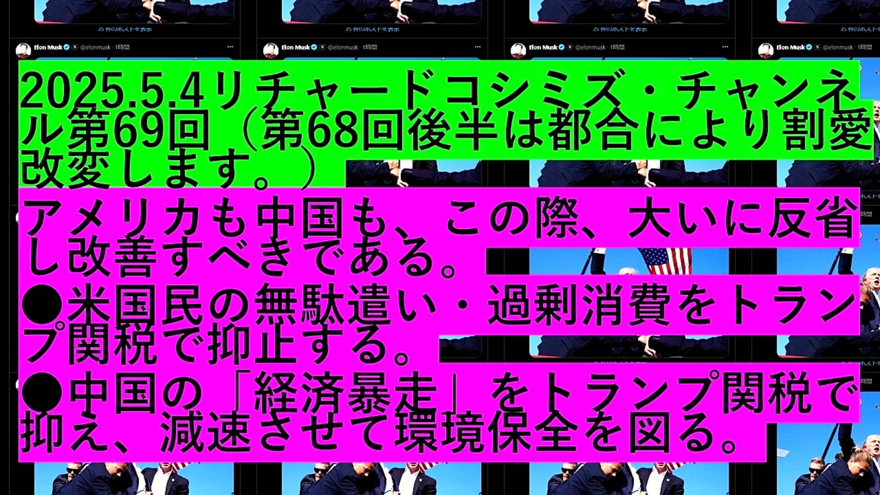 <span style="color: #cc0000;"><strong>◐『「 リチャード・コシミズ・チャンネル 」⦅ 第69回放送 ⦆⦅ 暫定版 ⦆』</strong></span><br><br> <span style="color: #ff0000;"><strong>「『 アメリカ 』も『 中国 』も、この際、大いに『 反省 』し『 改善 』すべきである。『 消費社会 』を『 見直そう 』。</strong></span><br><br> <span style="color: #ff0000;"><strong>◐『 米国民 』の『 無駄遣い 』・『 過剰消費 』を『 ドナルド・トランプ関税 』で『 抑止 』する。</strong></span><br><br> <span style="color: #ff0000;"><strong>◐『 中国 』の『 経済暴走 』を『 ドナルド・トランプ関税 』で『 抑え 』、『 減速 』させて『 環境保全 』を『 図る 』」</strong></span><br><br> <span style="color: #38761d;"><strong>◐『 リチャード・コシミズ・チャンネル⦅ ニコニコ チャンネル ⦆』</strong></span><br> <span style="color: #0000ff;"><strong><a href="https://ch.nicovideo.jp/richardkoshimizu" target="_blank" rel="noopener nofollow">https://ch.nicovideo.jp/richardkoshimizu</a></strong></span><br><br> <span style="color: #38761d;"><strong>◐『 リチャード・コシミズ「 ニコニコ生放送⦅ LIVE ⦆」』</strong></span><br> <span style="color: #0000ff;"><strong><a href="https://www.nicovideo.jp/user/120930363/live_programs" target="_blank" rel="noopener nofollow">https://www.nicovideo.jp/user/120930363/live_programs</a></strong></span><br><br> <span style="color: #38761d;"><strong>◐『 リチャード・コシミズ「 Rumble 」公式「 動画ギャラリー 」』</strong></span><br> <span style="color: #0000ff;"><strong><a href="https://rumble.com/user/richardkoshimizu" target="_blank" rel="noopener nofollow">https://rumble.com/user/richardkoshimizu</a></strong></span><br> <span style="color: #0000ff;"><strong><a href="https://rumble.com/user/RKVideoGallery" target="_blank" rel="noopener nofollow">https://rumble.com/user/RKVideoGallery</a></strong></span><br><br>