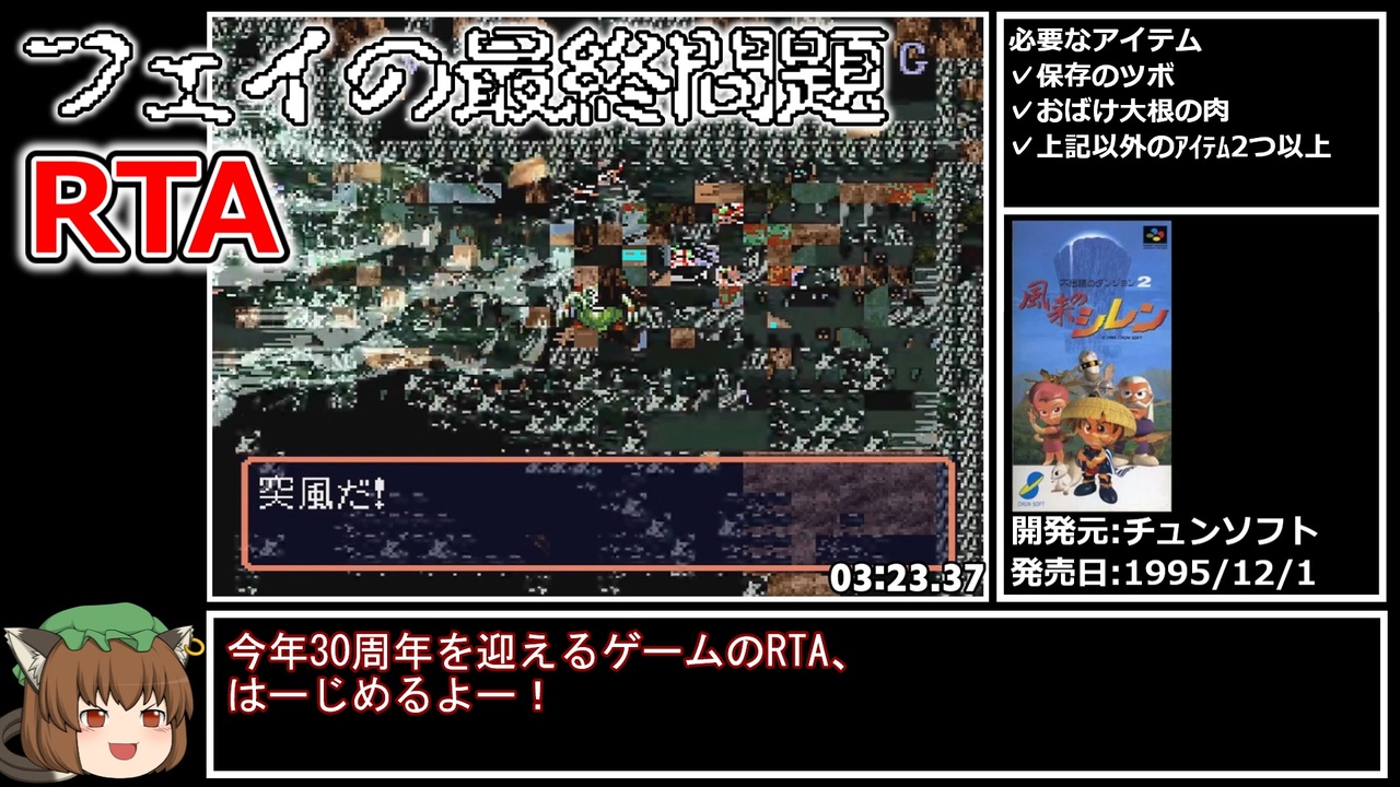 ビックラコキマロッ!<br><br>使用機種:レトロフリーク<br>タイマースタート:風来日記の作成完了時<br>タイマーストップ:フェイの最終問題クリア時(暗転時)<br>レギュレーション:フェイの最終問題・Glithes<br><br>RTAまとめ:<a href="https://www.nicovideo.jp/mylist/56827667" target="_blank" rel="noopener">mylist/56827667</a><br>更新報告:<a href="https://twitter.com/yamabukiginu" target="_blank" rel="noopener nofollow">https://twitter.com/yamabukiginu</a><br>無修正版:<a href="https://www.youtube.com/watch?v=mLeQGulQf4Q" target="_blank" rel="noopener nofollow">https://www.youtube.com/watch?v=mLeQGulQf4Q</a><br><br>今回のチャート(kzy氏のブログ)<br><a href="https://tmc.hatenablog.jp/entry/2025/03/30/092923" target="_blank" rel="noopener nofollow">https://tmc.hatenablog.jp/entry/2025/03/30/092923</a><br>フラグマイニングについて(gm:|氏|)<br><a href="https://www.nicovideo.jp/watch/sm34253938" class="watch">sm34253938</a><br><br><br><a target="_blank" href="https://qa.nicovideo.jp/faq/show/19424?site_domain=default" style="font-size: 13px;color: #657586; text-decoration: underline; line-height: 1.4">この動画は投稿者によって修正されました</a>