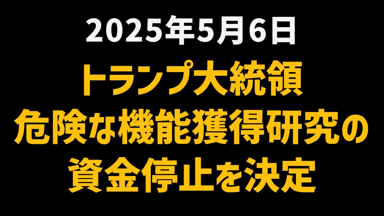◆トランプ大統領令<br>危険な機能獲得研究への資金提供停止<br>Improving the Safety and Security of Biological Research<br><br><a href="https://x.com/KEIICHIRO8140/status/1919599230181900739?t=HczxwHR_tY_gK5-E6Yc5jA&s=19" target="_blank" rel="noopener nofollow">https://x.com/KEIICHIRO8140/status/1919599230181900739?t=HczxwHR_tY_gK5-E6Yc5jA&s=19</a><br><br><br>◆トランプ大統領が機能獲得研究を全面停止!<br>URL<br><a href="https://www.whitehouse.gov/briefing-room/presidential-actions/2025/05/06/executive-order-on-terminating-federal-funding-of-risky-gain-of-function-research/" target="_blank" rel="noopener nofollow">https://www.whitehouse.gov/briefing-room/presidential-actions/2025/05/06/executive-order-on-terminating-federal-funding-of-risky-gain-of-function-research/</a><br><br><br><br>2025年5月6日、トランプ大統領が署名した新たな大統領令が世界に衝撃を与えました。感染力や致死性を強化する「機能獲得研究」への連邦資金提供を全面停止。この決断の背後には、COVID-19の発生源に関する深い疑念と、再び同じ悲劇を繰り返さないという強い意思があります。名指しされた中国やイラン、そして研究の自由を懸念する科学界。波紋は国内外へと広がりを見せています。これは単なる政策ではなく、国家と人類の未来を左右する分岐点です。トランプ政権が描く「アメリカ第一」のシナリオ、その最前線を追います。<br><br><br>◆ 今回の台本<br><a href="https://keiichiro8140.hatenablog.com/entry/20250506002" target="_blank" rel="noopener nofollow">https://keiichiro8140.hatenablog.com/entry/20250506002</a><br><br><br>◆マイリンク<br><a href="https://lit.link/keiichiro8140" target="_blank" rel="noopener nofollow">https://lit.link/keiichiro8140</a><br><br><br>トランプ大統領<br>機能獲得研究<br>大統領令<br>新型コロナウイルス<br>武漢ウイルス研究所<br>連邦資金停止<br>中国<br>バイオセキュリティ<br>アメリカファースト<br>ニュース<br>気になったニュース<br><br />著作権、肖像権に配慮して作成しております。<br><br>◆気になったニュースの台本!?<br>メモ代わりに作った台本をそのままあげてます<br><a href="https://keiichiro8140.hatenablog.com/." target="_blank" rel="noopener nofollow">https://keiichiro8140.hatenablog.com/.</a><br><br><br>ここからはシリーズ紹介<br><br><br>◆ ワクチン解毒・デトックス<br><a href="https://x.gd/fZweg" target="_blank" rel="noopener nofollow">https://x.gd/fZweg</a><br><br>◆ウイリアム・マキス博士のがん治療(イベルメクチン・フェンベンダゾール等)<br><a href="https://x.gd/AtFYS" target="_blank" rel="noopener nofollow">https://x.gd/AtFYS</a><br><br>◆予防接種健康被害救済制度<br><a href="https://x.gd/0xK9x" target="_blank" rel="noopener nofollow">https://x.gd/0xK9x</a><br><br>◆気になったニュース #1501~<br><br>◆ 【ショートver】気になったニュース<br><a href="https://x.gd/7MxXC" target="_blank" rel="noopener nofollow">https://x.gd/7MxXC</a><br><br>◆ 気になったニュース #1001~<br><a href="https://x.gd/Lp8gv" target="_blank" rel="noopener nofollow">https://x.gd/Lp8gv</a><br><br>◆ 気になったニュース #501~<br><a href="https://x.gd/EmbS4" target="_blank" rel="noopener nofollow">https://x.gd/EmbS4</a><br><br>◆ 気になったニュース #1~#500<br><a href="https://x.gd/uPhNb" target="_blank" rel="noopener nofollow">https://x.gd/uPhNb</a><br><br>◆ X(旧Twitter)・テレグラムで気になった情報<br><a href="https://x.gd/YG6FT" target="_blank" rel="noopener nofollow">https://x.gd/YG6FT</a><br><br>◆ 日比谷5万人パレードデ⚪生放送アーカイブ動画<br><a href="https://x.gd/3CHJv" target="_blank" rel="noopener nofollow">https://x.gd/3CHJv</a><br><br>◆日比谷5万人パレード⚪モのマイリスト作ってみました<br><a href="https://nico.ms/mylist/76828848?ref=sp_other" target="_blank" rel="noopener nofollow">https://nico.ms/mylist/76828848?ref=sp_other</a><br><br>◆3.30 令和の百姓⚪⚪<br><a href="https://www.nicovideo.jp/series/511791?ref=garage_share_other" target="_blank" rel="noopener nofollow">https://www.nicovideo.jp/series/511791?ref=garage_share_other</a><br><br>◆ 及川幸久さんの【XNEWS】シリーズ<br><a href="https://x.gd/3k78K" target="_blank" rel="noopener nofollow">https://x.gd/3k78K</a><br><br>◆これまでの動画<a href="https://x.gd/sPXoJ" target="_blank" rel="noopener nofollow">https://x.gd/sPXoJ</a><br><br>◆もしも(BAN)の時のためのマイリンク集<a href="https://lit.link/K-16_News44" target="_blank" rel="noopener nofollow">https://lit.link/K-16_News44</a><br><br>