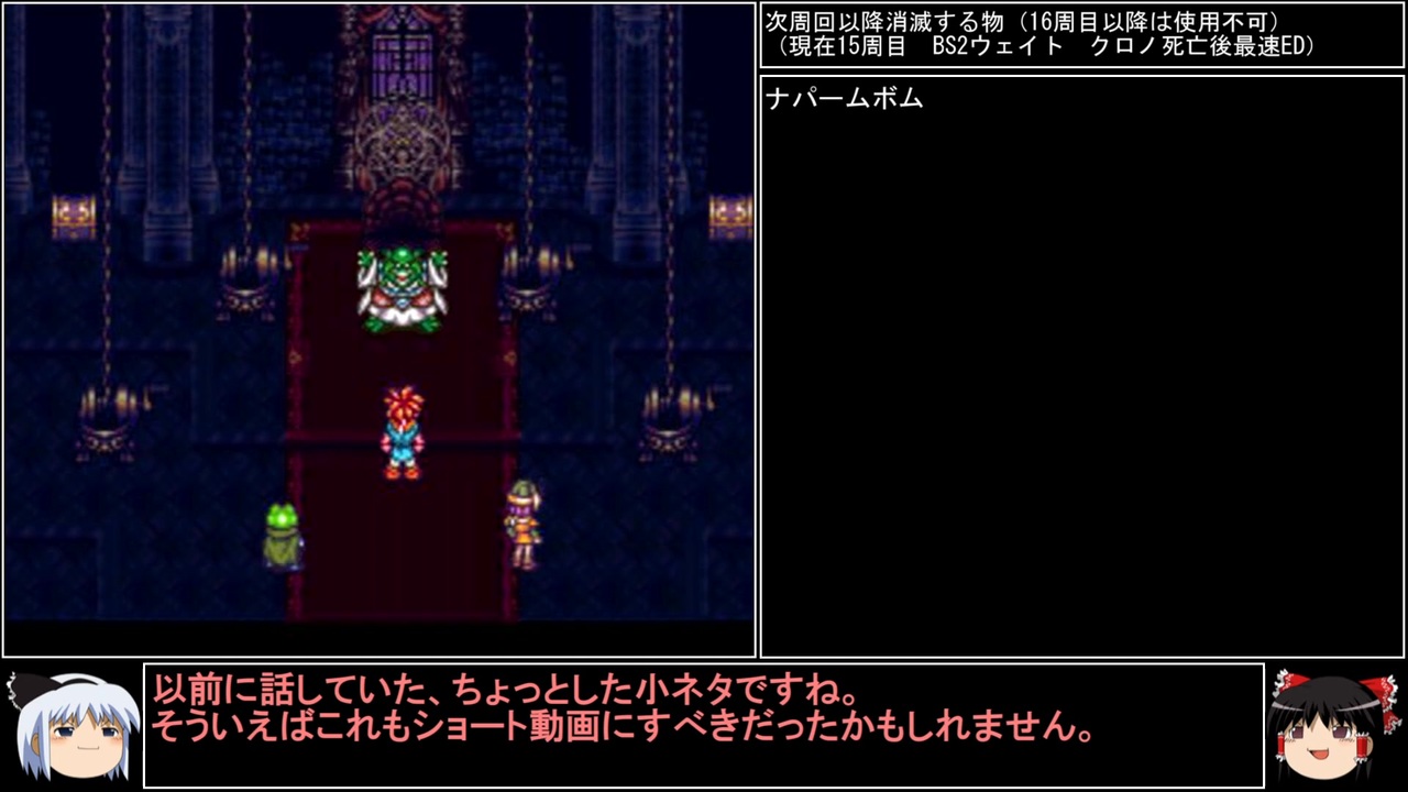 15周目のpart1です。<br>またまたアドリブチャートに入ります。<br>こうしたハプニングがあってもリカバリーできる程度には余裕ある縛りプレイです。それ故に息抜き!<br><br>前→<a href="https://www.nicovideo.jp/watch/sm44877883" class="watch">sm44877883</a><br>次→<a href="https://www.nicovideo.jp/watch/sm44998764" class="watch">sm44998764</a><br><br>YouTube版→<a href="https://youtu.be/bow-WtF_p2g" target="_blank" rel="noopener nofollow">https://youtu.be/bow-WtF_p2g</a><br><br>縛りルール<br>①一度使った武器・防具・アクセサリー・道具・技・連携は<br> 次周回以降使用禁止(売却も解禁扱い)<br><br>②一度戦った敵シンボルとの再戦禁止。<br><br>③初戦闘の敵からの逃走禁止。<br><br>④裏技、バグ技、状況再現禁止。<br><br>⑤BS1アクティブからBS8ウェイトまで<br> 全てのバトルスピードとバトルモードで攻略する。<br><br>⑥各周回において見る予定のED条件を<br> 満たした段階で即ラヴォスと戦いに行く。<br><br>※ネタバレ注意です<br><br>このページ、動画で利用している弊社または弊社のライセンサーが権利を有する著作物の転載・配布は禁止いたします。<br>© 1995, 2018 SQUARE ENIX<br>Illustration: © 1995 BIRD STUDIO / SHUEISHA<br>Story and Screenplay: © 1995, 2008 ARMOR PROJECT / SQUARE ENIX<br><br>AquesTalk2ライセンスID:AQTK2WINUSR23122185<br /><br><br>❤いいねを押していただけるとモチベーションと投稿速度が上がるので宜しくお願い致します!<br><br>作者ツイッター→ <a href="https://twitter.com/nig0117" target="_blank" rel="noopener nofollow">https://twitter.com/nig0117</a><br>PIXIV FANBOX→ <a href="https://sutanokeiji.fanbox.cc/" target="_blank" rel="noopener nofollow">https://sutanokeiji.fanbox.cc/</a><br><br>( 以前はWEB小説書いてました→ <a href="https://kakuyomu.jp/works/1177354054884910267" target="_blank" rel="noopener nofollow">https://kakuyomu.jp/works/1177354054884910267</a> )