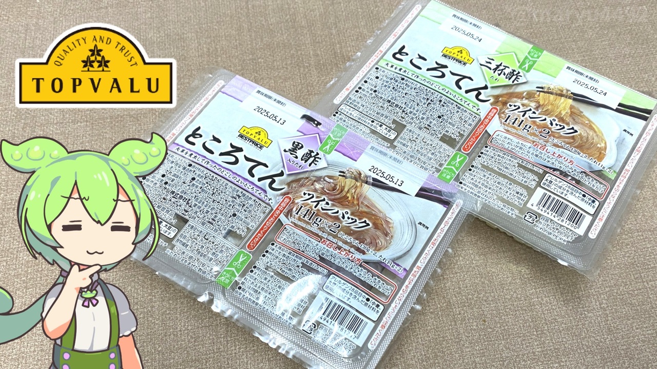 年に数回、健康に気をつかわなきゃって思うことがあります。<br>そういう時に体によさそうなものはないかと探していたら<br>ところでんがいいなかと試しに買ってみることにしました。<br><br><br>【関連動画】<br>トップバリュの「寒天入りカスタードプリン風(118円)」2025.05.01<br><a href="https://www.nicovideo.jp/watch/sm44930594" target="_blank" rel="noopener nofollow">https://www.nicovideo.jp/watch/sm44930594</a><br><br>【参考】<br>ところてんツインパック黒酢たれ付き ※本体価格128円/141g×2個(トップバリュ)<br><a href="https://www.topvalu.net/items/detail/4549414281217/" target="_blank" rel="noopener nofollow">https://www.topvalu.net/items/detail/4549414281217/</a><br>ところてんツインパック三杯酢たれ ※本体価格128円/141g×2個(トップバリュ)<br><a href="https://www.topvalu.net/items/detail/4549414281200/" target="_blank" rel="noopener nofollow">https://www.topvalu.net/items/detail/4549414281200/</a><br>寒天入りカスタードプリン風 ※本体価格118円/270g(トップバリュ)<br><a href="https://www.topvalu.net/items/detail/4549414626698/" target="_blank" rel="noopener nofollow">https://www.topvalu.net/items/detail/4549414626698/</a><br>株式会社細萱食品<br><a href="https://hosogaya-foods.jp/" target="_blank" rel="noopener nofollow">https://hosogaya-foods.jp/</a><br>イオントップバリュ/2023年度売上目標1兆円、新ブランド体系発表2023.03.16(流通ニュース)<br><a href="https://www.ryutsuu.biz/commodity/p031641.html" target="_blank" rel="noopener nofollow">https://www.ryutsuu.biz/commodity/p031641.html</a><br><br>【使用した素材】(※敬称略) <br>(合成音声)VOICEVOX/ずんだもん/四国めたん/<br><a href="https://voicevox.hiroshiba.jp/" target="_blank" rel="noopener nofollow">https://voicevox.hiroshiba.jp/</a> <br>(立ち絵)坂本アヒル<br> <a href="https://seiga.nicovideo.jp/seiga/im10788496?track" target="_blank" rel="noopener nofollow">https://seiga.nicovideo.jp/seiga/im10788496?track</a><br>(楽曲)甘茶の音楽工房/「楽しい麦畑」「フルーツパフェ」「お城の舞踏会」<br><a href="https://amachamusic.chagasi.com/" target="_blank" rel="noopener nofollow">https://amachamusic.chagasi.com/</a>