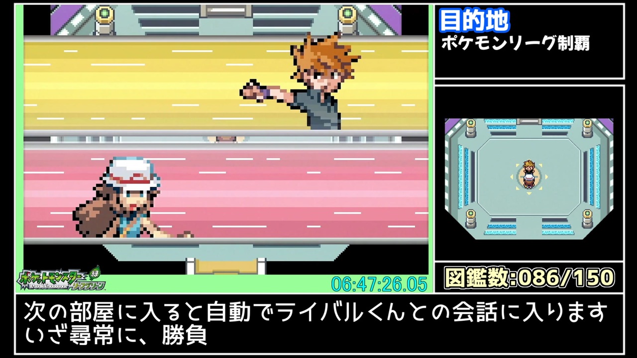 主にチャンピオンロードとポケモンリーグ<br><br>・計測方法<br>-開始:どちらかのソフトで「さいしょからはじめる」を選択したタイミング<br>-終了:どちらかのソフトでカントー図鑑完成の賞状が表示されたタイミング<br><br>・捕捉<br>-使用ソフトはファイアレッド・リーフグリーン1本ずつ <br>-バグ技無し <br>-通信中以外の同時操作無し <br>-ミュウは不要<br><br>全part結合版<br><a href="https://youtu.be/kES7NkXELjE" target="_blank" rel="noopener nofollow">https://youtu.be/kES7NkXELjE</a><br><br>無編集の記録動画<br><a href="https://youtu.be/4KohYxLe99o" target="_blank" rel="noopener nofollow">https://youtu.be/4KohYxLe99o</a><br><br>次→<a href="https://www.nicovideo.jp/watch/sm44966342" class="watch">sm44966342</a><br>前→<a href="https://www.nicovideo.jp/watch/sm44959873" class="watch">sm44959873</a><br>最初→<a href="https://www.nicovideo.jp/watch/sm44941288" class="watch">sm44941288</a><br><br>投稿したRTA解説part1まとめ<br><a href="https://www.nicovideo.jp/mylist/67368614" target="_blank" rel="noopener">mylist/67368614</a><br>