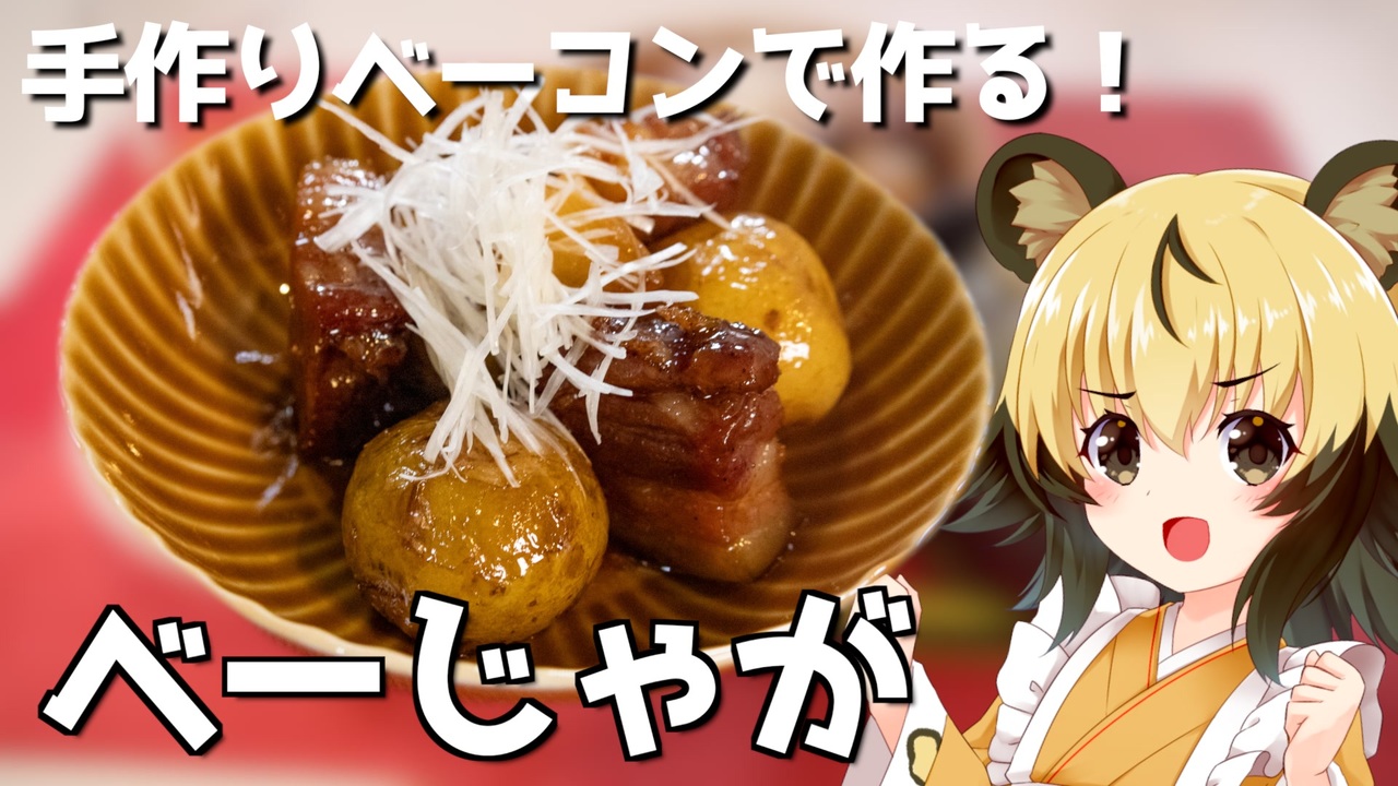今回は、手作りベーコンを使った「ベーコンじゃがいもの甘辛煮」略して「ベーじゃが」を作りましょう!<br><br>ベーコン作ってみたかったのです!<br>でもちゃんとしたベーコンは、燻製などハードルが高いですよね。<br><br>ということで、<br>・家庭のオーブンでできる<br>・匂いもあまり気にならない<br>・スパイス感は控えめに、和食に合う<br>そんなベーコンを作っていきましょう!<br><br>できたベーコンそのまま炙って食べても最高なのですが、<br>今回はさらにお酒やご飯との相性抜群な甘辛煮にしてみました。<br><br>■材料<br>・ベーコン 300〜400g<br>・じゃがいも ベーコンと同じかやや多め<br>・ニンニク 3かけ<br>・水 2カップ<br>・白だし 大さじ2<br>・砂糖 大さじ2<br>・醤油 大さじ2+α<br>・白髪ネギ お好みで<br><br>■所要時間<br>調理時間:ベーコン1週間<br> ベーじゃが40分<br><br><br>ーーーーーーーーーーーーーーーー<br>音声:AI VOICE2紲星あかり<br>立ち絵:星華彩二魔さん<br>音源:DOVA-SYNDROME<br>イラスト:いらすとや<br>機材:Canon EOS R10<br>編集ソフト:Final Cut Pro<br>ーーーーーーーーーーーーーーーー<br><br>youtube:<a href="https://youtu.be/DhxA5CNUdlU" target="_blank" rel="noopener nofollow">https://youtu.be/DhxA5CNUdlU</a><br>X(旧:twitter):@lycaon_kitchen<br><br>りおんの和風喫茶:<a href="https://www.nicovideo.jp/series/77190" target="_blank" rel="noopener">series/77190</a><br>おつかれごはん:<a href="https://www.nicovideo.jp/series/155690" target="_blank" rel="noopener">series/155690</a><br>手作り和菓子でちょっとひとやすみしませんか?:<a href="https://www.nicovideo.jp/series/155691" target="_blank" rel="noopener">series/155691</a>