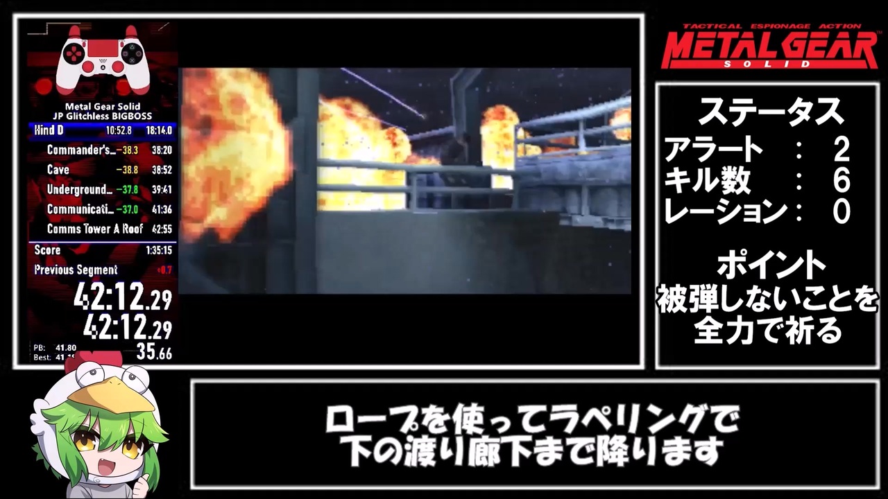 スナイパーウルフ戦~ハインドD戦直前<br>ウルフは4ぬことはあまりないけど、柱の裏に隠れられると厄介ね。<br>時間めっちゃ持ってかれる(ウルフの乱数のせいで30秒ほどプラスついちゃう、なんてことも多々あります)<br><br><span style="color: #ff0000; font-size: 16px;"><strong><u>ニコニコ超会議2025「超RTA」 (4/27)</u></strong></span><span style="color: #ff0000; font-size: 16px;"><strong> </strong></span>に出演させていただきました。<br>本当にありがとうございました。<br>内容はほぼあの時走ったのと同じですが、ところどころ変更点あります。<br>よかったら見つけてみてください。<br><br>「日本語版+バグなし+BIGBOSS縛り」たった一人の走者です。挑戦者お待ちしております!