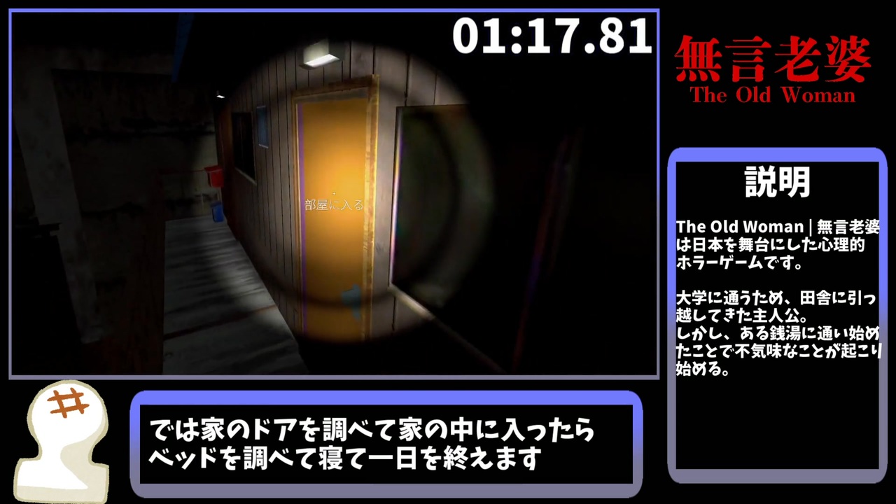 ゲーム→<a href="https://store.steampowered.com/app/3653910/The_Old_Woman/" target="_blank" rel="noopener nofollow">https://store.steampowered.com/app/3653910/The_Old_Woman/</a><br><br>今回は無言老婆を遊びました<br>くっさ<br><br><span style="color: #000000; font-size: 14px;">単発RTA→</span><span style="color: #006699; font-size: 14px;"><a href="https://www.nicovideo.jp/mylist/66917940" target="_blank" rel="noopener">mylist/66917940</a></span><br><br>生放送コミュ→co4338697<br><br><span style="color: #000000; font-size: 14px;">ΔYoutube→</span><span style="color: #006699; font-size: 14px;"><a href="https://www.youtube.com/channel/UC4jVPBw6dP3mXCGJvRi3Xbw?view_as=subscriber" target="_blank" rel="noopener nofollow">https://www.youtube.com/channel/UC4jVPBw6dP3mXCGJvRi3Xbw?view_as=subscriber</a></span>