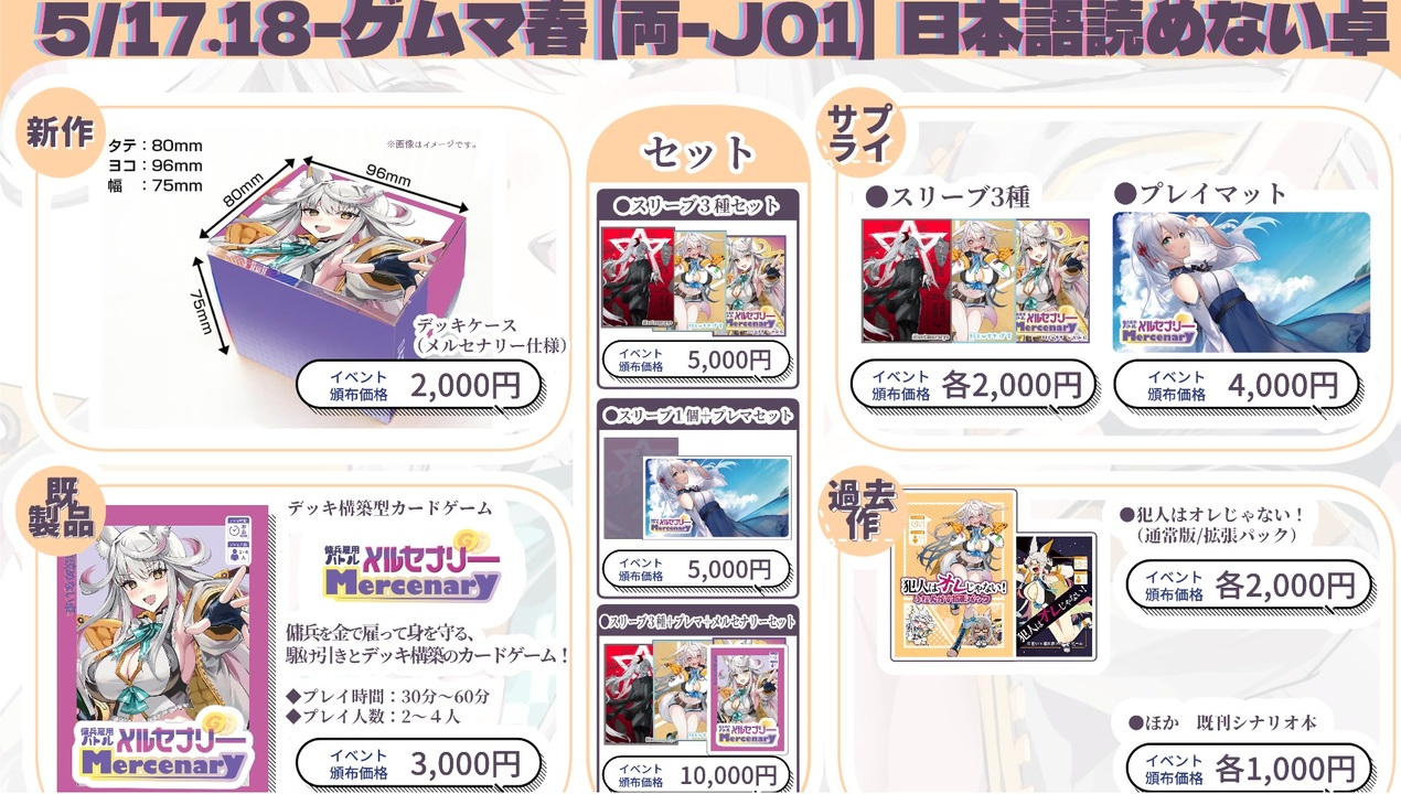<span style="font-size: 16px;"><strong>メルセナリー販売ページ:<a href="https://nihonngoyomenai.booth.pm/items/6208738" target="_blank" rel="noopener nofollow">https://nihonngoyomenai.booth.pm/items/6208738</a> <br>ブース番号:J01 日本語読めない卓</strong></span><br><br><br>投稿したTRPG動画第一話集→<a href="https://www.nicovideo.jp/mylist/53857218" target="_blank" rel="noopener">mylist/53857218</a> <br>Twitter→<a href="https://twitter.com/nikoraiTRPG" target="_blank" rel="noopener nofollow">https://twitter.com/nikoraiTRPG</a><br>YouTubeチャンネル→<a href="https://www.youtube.com/channel/UCx75tsELw0rmXG5i2_sXf4g?view_as=subscriber" target="_blank" rel="noopener nofollow">https://www.youtube.com/channel/UCx75tsELw0rmXG5i2_sXf4g?view_as=subscriber</a><br>BOOTH:<a href="https://nihonngoyomenai.booth.pm/" target="_blank" rel="noopener nofollow">https://nihonngoyomenai.booth.pm/</a><br>メロブ:<a href="https://www.melonbooks.co.jp/circle/index.php?circle_id=101170" target="_blank" rel="noopener nofollow">https://www.melonbooks.co.jp/circle/index.php?circle_id=101170</a><br><br><span style="color: #000000; font-size: 14px;">お借りした素材元様<br>ニコニココモンズの皆様 </span>