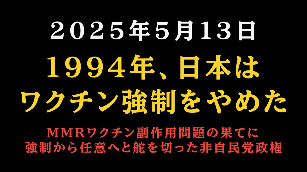 【けっこうな問題作かも】◆1994年、日本はワクチン強制をやめた ~ MMRワクチン副作用問題の果てに、強制から任意へと舵を切った非自民党政権<br><br><br>1994年、日本は24か月未満の乳児へのワクチン接種を「強制」から「任意」へと転換しました。当時の首相は村山富市氏、厚生大臣は井出正一氏。これは異例の非自民政権による大胆な制度改革でした。<br>この“任意化”により、予防接種を見送る家庭も現れましたが、その後、日本の乳児死亡率は世界最低水準へと下がっていきます。制度を見直すことで、健康被害を防ぐ選択肢がある――この歴史が、いま再び問いかけます。私たちは本当に正しい道を選んでいるのか? その先にある“変わる力”を、見つめてみてください。<br><br><br>◆ 今回の台本<br><a href="https://keiichiro8140.hatenablog.com/entry/20250513001" target="_blank" rel="noopener nofollow">https://keiichiro8140.hatenablog.com/entry/20250513001</a><br><br><br>◆マイリンク<br><a href="https://lit.link/keiichiro8140" target="_blank" rel="noopener nofollow">https://lit.link/keiichiro8140</a><br><br><br>ワクチン<br>1994年<br>ワクチン強制<br>予防接種<br>村山富市<br>MMRワクチン<br>副作用<br>ワクチン被害<br>mRNAワクチン<br>ニュース<br>気になったニュース<br><br><br>画像:「村山富市内閣(1994年6月30日)」<br>出典:内閣広報室(<a href="https://commons.m.wikimedia.org/wiki/File:Tomiichi_Murayama_Cabinet_19940630.jpg)" target="_blank" rel="noopener nofollow">https://commons.m.wikimedia.org/wiki/File:Tomiichi_Murayama_Cabinet_19940630.jpg)</a><br>ライセンス: CC BY 4.0 <a href="https://creativecommons.org/licenses/by/4.0/deed.ja" target="_blank" rel="noopener nofollow">https://creativecommons.org/licenses/by/4.0/deed.ja</a><br>※一部トリミングを行っています<br><br><br />著作権、肖像権に配慮して作成しております。<br><br>◆気になったニュースの台本!?<br>メモ代わりに作った台本をそのままあげてます<br><a href="https://keiichiro8140.hatenablog.com/." target="_blank" rel="noopener nofollow">https://keiichiro8140.hatenablog.com/.</a><br><br><br>ここからはシリーズ紹介<br><br><br>◆ ワクチン解毒・デトックス<br><a href="https://x.gd/fZweg" target="_blank" rel="noopener nofollow">https://x.gd/fZweg</a><br><br>◆ウイリアム・マキス博士のがん治療(イベルメクチン・フェンベンダゾール等)<br><a href="https://x.gd/AtFYS" target="_blank" rel="noopener nofollow">https://x.gd/AtFYS</a><br><br>◆予防接種健康被害救済制度<br><a href="https://x.gd/0xK9x" target="_blank" rel="noopener nofollow">https://x.gd/0xK9x</a><br><br>◆気になったニュース #1501~<br><br>◆ 【ショートver】気になったニュース<br><a href="https://x.gd/7MxXC" target="_blank" rel="noopener nofollow">https://x.gd/7MxXC</a><br><br>◆ 気になったニュース #1001~<br><a href="https://x.gd/Lp8gv" target="_blank" rel="noopener nofollow">https://x.gd/Lp8gv</a><br><br>◆ 気になったニュース #501~<br><a href="https://x.gd/EmbS4" target="_blank" rel="noopener nofollow">https://x.gd/EmbS4</a><br><br>◆ 気になったニュース #1~#500<br><a href="https://x.gd/uPhNb" target="_blank" rel="noopener nofollow">https://x.gd/uPhNb</a><br><br>◆ X(旧Twitter)・テレグラムで気になった情報<br><a href="https://x.gd/YG6FT" target="_blank" rel="noopener nofollow">https://x.gd/YG6FT</a><br><br>◆ 日比谷5万人パレードデ⚪生放送アーカイブ動画<br><a href="https://x.gd/3CHJv" target="_blank" rel="noopener nofollow">https://x.gd/3CHJv</a><br><br>◆日比谷5万人パレード⚪モのマイリスト作ってみました<br><a href="https://nico.ms/mylist/76828848?ref=sp_other" target="_blank" rel="noopener nofollow">https://nico.ms/mylist/76828848?ref=sp_other</a><br><br>◆3.30 令和の百姓⚪⚪<br><a href="https://www.nicovideo.jp/series/511791?ref=garage_share_other" target="_blank" rel="noopener nofollow">https://www.nicovideo.jp/series/511791?ref=garage_share_other</a><br><br>◆ 及川幸久さんの【XNEWS】シリーズ<br><a href="https://x.gd/3k78K" target="_blank" rel="noopener nofollow">https://x.gd/3k78K</a><br><br>◆これまでの動画<a href="https://x.gd/sPXoJ" target="_blank" rel="noopener nofollow">https://x.gd/sPXoJ</a><br><br>◆もしも(BAN)の時のためのマイリンク集<a href="https://lit.link/K-16_News44" target="_blank" rel="noopener nofollow">https://lit.link/K-16_News44</a><br><br>