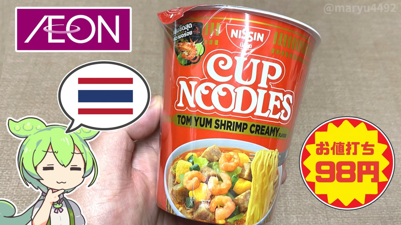 イオンで買ってきた、タイで作られたトムヤムクンヌードルです。<br>調べたのですがどういう経緯で入ってきたのかよくわかりませんでした。<br><br><br>【参考】<br>「カップヌードル たまごまみれ ビッグ」(5月12日発売)(日清食品)<br><a href="https://www.nissin.com/jp/company/news/13278/" target="_blank" rel="noopener nofollow">https://www.nissin.com/jp/company/news/13278/</a><br><br>【使用した素材】(※敬称略) <br>(合成音声)VOICEVOX/ずんだもん/四国めたん/<br><a href="https://voicevox.hiroshiba.jp/" target="_blank" rel="noopener nofollow">https://voicevox.hiroshiba.jp/</a> <br>(立ち絵)坂本アヒル<br> <a href="https://seiga.nicovideo.jp/seiga/im10788496?track" target="_blank" rel="noopener nofollow">https://seiga.nicovideo.jp/seiga/im10788496?track</a><br>(楽曲)甘茶の音楽工房/「楽しい麦畑」「フルーツパフェ」「お城の舞踏会」<br><a href="https://amachamusic.chagasi.com/" target="_blank" rel="noopener nofollow">https://amachamusic.chagasi.com/</a>