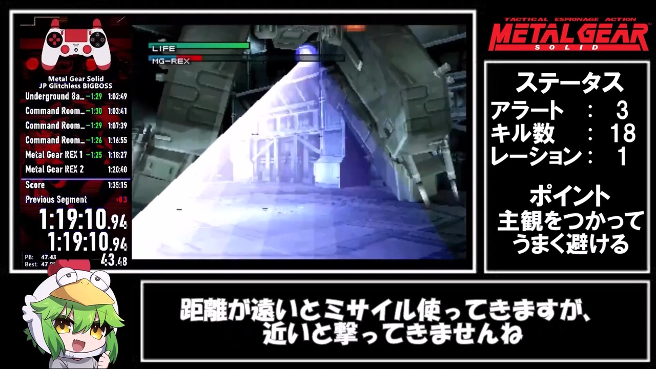 いよいよ最終回!メタルギアREXをてきとーに倒します<br>ここまでご視聴いただきありがとうございました。<br><br><span style="color: #ff0000; font-size: 16px;"><strong><u>ニコニコ超会議2025「超RTA」 (4/27)</u></strong></span><span style="color: #ff0000; font-size: 16px;"><strong> </strong></span>に出演させていただきました。<br>本当にありがとうございました。<br>内容はほぼあの時走ったのと同じですが、ところどころ変更点あります。<br>よかったら見つけてみてください。<br><br>「日本語版+バグなし+BIGBOSS縛り」たった一人の走者です。挑戦者お待ちしております!