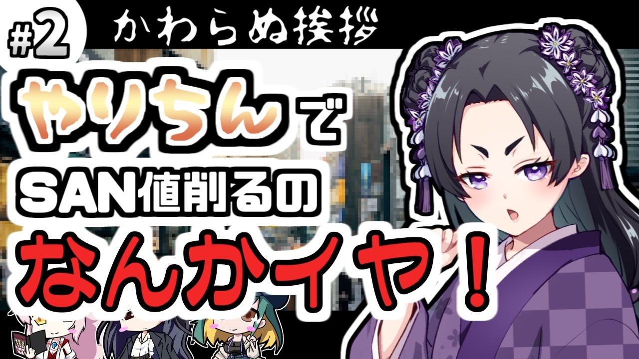 <span style="color: #ff0000; font-size: 18px;"><strong><i>いいねボタンをよろしくお願いします!</i></strong></span><br><br>「かわらぬ挨拶」1~2週目<br>NPCへの接し方が前回はまだ「雑な扱い」で済んでたけど<br>今回はもう人ではなくモノを見る目してる気がする<br><br>マイリスト:<a href="https://www.nicovideo.jp/mylist/77573353" target="_blank" rel="noopener">mylist/77573353</a><br><a href="https://www.nicovideo.jp/watch/sm44965466" class="watch">sm44965466</a>←前回 次回→<a href="https://www.nicovideo.jp/watch/sm45013365" class="watch">sm45013365</a><br><br>part1から見る→<a href="https://www.nicovideo.jp/watch/sm44620921" class="watch">sm44620921</a><br>他のpart1→<a href="https://www.nicovideo.jp/mylist/36166089" target="_blank" rel="noopener">mylist/36166089</a><br><br>Twitter→<a href="https://twitter.com/ku_yanekonabe" target="_blank" rel="noopener nofollow">https://twitter.com/ku_yanekonabe</a><br>ミスキー→<a href="https://misskey.io/@kuyatorinabe" target="_blank" rel="noopener nofollow">https://misskey.io/@kuyatorinabe</a><br>pixiv→<a href="https://www.pixiv.net/users/43742619" target="_blank" rel="noopener nofollow">https://www.pixiv.net/users/43742619</a><br>skeb→<a href="https://skeb.jp/@kuyatorinabe" target="_blank" rel="noopener nofollow">https://skeb.jp/@kuyatorinabe</a><br>youtube→<a href="https://www.youtube.com/channel/UCXpcVOIoC3iyGNclrsFkuIg" target="_blank" rel="noopener nofollow">https://www.youtube.com/channel/UCXpcVOIoC3iyGNclrsFkuIg</a><br><br>参加者<br>KP:投稿者<br>世迷永遠:髪流(<a href="https://www.nicovideo.jp/user/7644658" target="_blank" rel="noopener">user/7644658</a>) <a href="https://x.com/katiku2" target="_blank" rel="noopener nofollow">https://x.com/katiku2</a><br>麒麟塚寧々:煉獄ハプリーフ・アスタロット <a href="https://x.com/rengoku_astarot" target="_blank" rel="noopener nofollow">https://x.com/rengoku_astarot</a><br>百足かがみ:モクゥバ・東北 <a href="https://x.com/mokuuba_touhoku" target="_blank" rel="noopener nofollow">https://x.com/mokuuba_touhoku</a><br><br>遊んだシナリオ:くまさん様作「かわらぬ挨拶」<a href="https://www.pixiv.net/novel/show.php?id=8168387" target="_blank" rel="noopener nofollow">https://www.pixiv.net/novel/show.php?id=8168387</a><br><br>お借りした素材元<br>イズノヤト様/髪流様/ミラーイメージ様/Pexels様/戯屋様/ペリチューン様/ayatosoundcreate様/魔王魂様/音人様<br><br>使用楽曲<br>森羅万象様 「シンクロ2」より「children's game」<br><br>この動画はサンディ・ピーターセン、ポール・フリッカー、マイク・メイソン、坂本雅之/アーカム・メンバーズ及びケイオシアム/アークライト/KADOKAWAが権利を有する新クトゥルフ神話TRPGの二次創作です。
