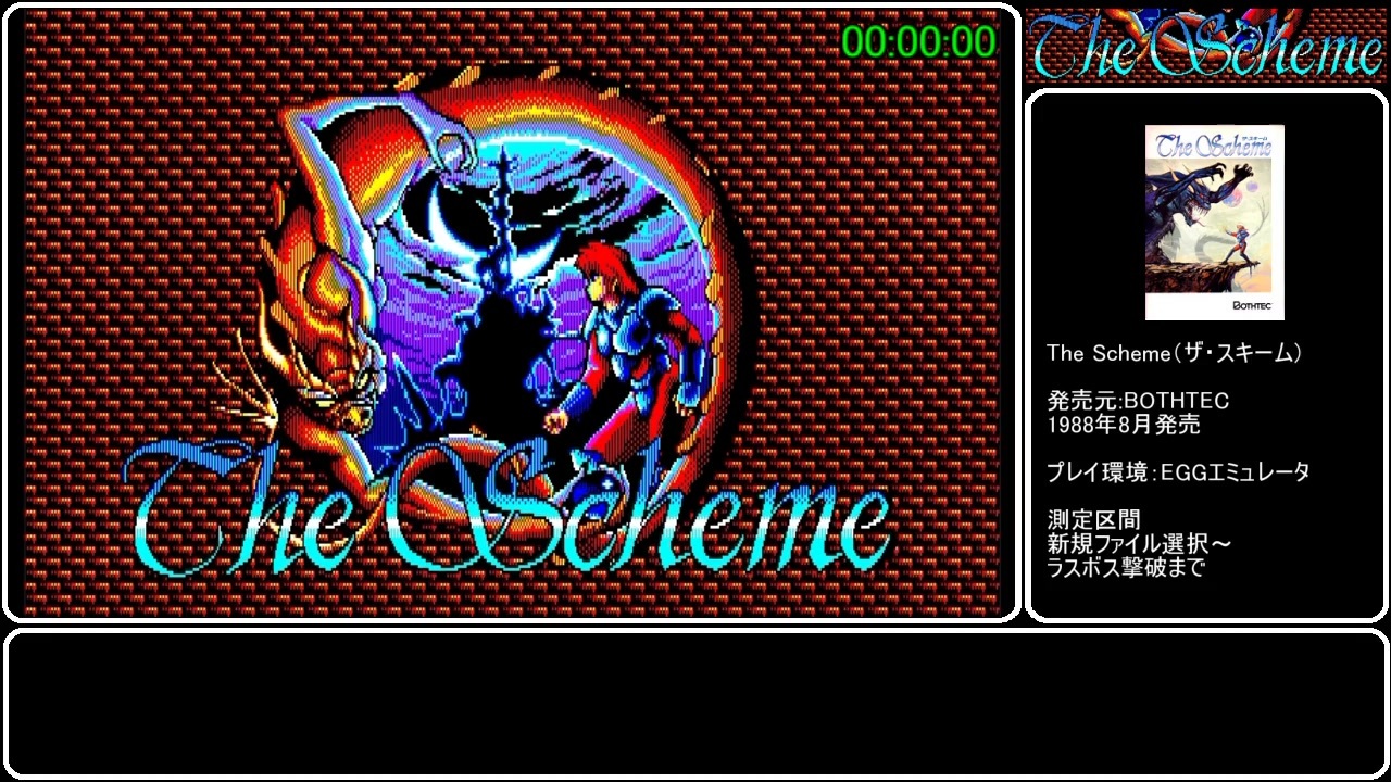 ザ・スキーム のRTAです<br>The Scheme RTA<br><br>PC8801mk2SR版 ザ・スキームのEGG版でのRTA動画です<br>ANY%<br>計測区間は<br> 新規ファイル選択 ~ ラスボス撃破まで<br><br>・公式HP <a href="https://www.amusement-center.com/project/egg/game/?product_id=1288" target="_blank" rel="noopener nofollow">https://www.amusement-center.com/project/egg/game/?product_id=1288</a><br>・Switch版も発売中 <a href="https://store-jp.nintendo.com/item/software/D70010000088626" target="_blank" rel="noopener nofollow">https://store-jp.nintendo.com/item/software/D70010000088626</a><br>転載禁止<br><br>関連サイト<br>・オニタマさんとそのオニオン製作所HP<br><a href="https://www.onionsoft.net/" target="_blank" rel="noopener nofollow">https://www.onionsoft.net/</a><br><a href="https://onitama.tv/" target="_blank" rel="noopener nofollow">https://onitama.tv/</a><br><br>雑談多め<br>投稿時点では世界記録です<br><br>・その他レゲー中心RTA動画part1集<br><a href="https://www.nicovideo.jp/mylist/72875584" target="_blank" rel="noopener">mylist/72875584</a>