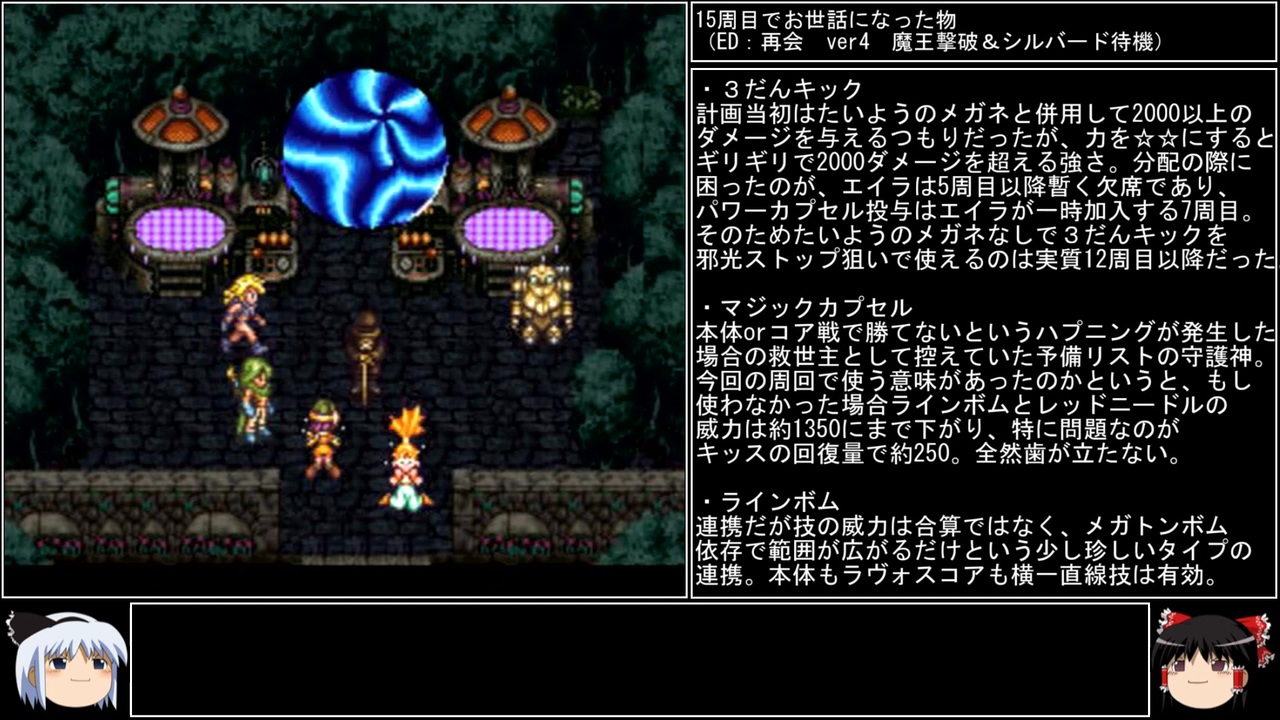 15周目のpart2です。<br>グレンの真の姿が見られるEDの存在は知っていても、色々なアングルで見られるこのEDを知らない人とかいるかも?<br><br>前→<a href="https://www.nicovideo.jp/watch/sm44957626" class="watch">sm44957626</a><br>次→<a href="https://www.nicovideo.jp/watch/sm44999489" class="watch">sm44999489</a><br>YouTube版→<a href="https://youtu.be/mudYpBytPbA" target="_blank" rel="noopener nofollow">https://youtu.be/mudYpBytPbA</a><br><br>縛りルール<br>①一度使った武器・防具・アクセサリー・道具・技・連携は<br> 次周回以降使用禁止(売却も解禁扱い)<br><br>②一度戦った敵シンボルとの再戦禁止。<br><br>③初戦闘の敵からの逃走禁止。<br><br>④裏技、バグ技、状況再現禁止。<br><br>⑤BS1アクティブからBS8ウェイトまで<br> 全てのバトルスピードとバトルモードで攻略する。<br><br>⑥各周回において見る予定のED条件を<br> 満たした段階で即ラヴォスと戦いに行く。<br><br>※ネタバレ注意です<br><br>このページ、動画で利用している弊社または弊社のライセンサーが権利を有する著作物の転載・配布は禁止いたします。<br>© 1995, 2018 SQUARE ENIX<br>Illustration: © 1995 BIRD STUDIO / SHUEISHA<br>Story and Screenplay: © 1995, 2008 ARMOR PROJECT / SQUARE ENIX<br><br>AquesTalk2ライセンスID:AQTK2WINUSR23122185<br /><br><br>❤いいねを押していただけるとモチベーションと投稿速度が上がるので宜しくお願い致します!<br><br>作者ツイッター→ <a href="https://twitter.com/nig0117" target="_blank" rel="noopener nofollow">https://twitter.com/nig0117</a><br>PIXIV FANBOX→ <a href="https://sutanokeiji.fanbox.cc/" target="_blank" rel="noopener nofollow">https://sutanokeiji.fanbox.cc/</a><br><br>( 以前はWEB小説書いてました→ <a href="https://kakuyomu.jp/works/1177354054884910267" target="_blank" rel="noopener nofollow">https://kakuyomu.jp/works/1177354054884910267</a> )