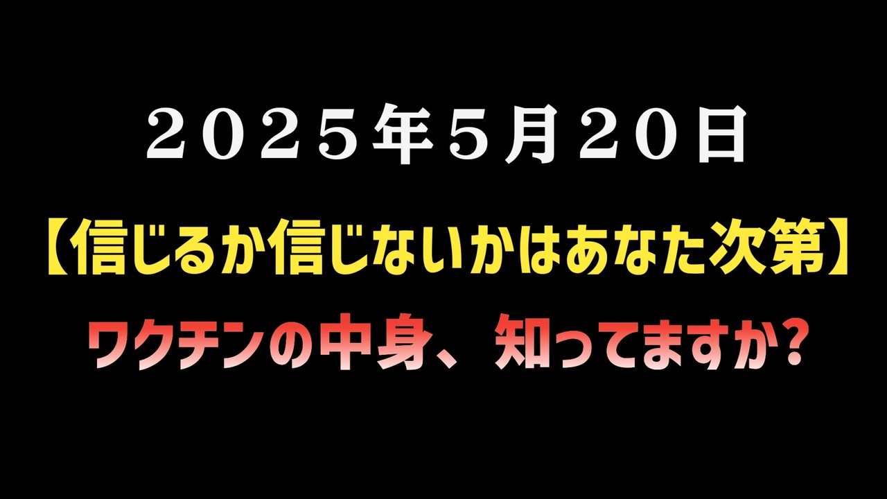 【信じるか信じないかはあなた次第】ワクチンの中身、知ってますか?<br><br>回覧板です。<br>ワクチンの中身と言われるもの<br>どこからか回ってきました。再投稿<br> <a href="https://t.co/ubZXiBXRta" target="_blank" rel="noopener nofollow">https://t.co/ubZXiBXRta</a><br><br><br>◆ 今回の台本<br><a href="https://keiichiro8140.hatenablog.com/entry/20250520001" target="_blank" rel="noopener nofollow">https://keiichiro8140.hatenablog.com/entry/20250520001</a><br><br><br>◆マイリンク<br><a href="https://lit.link/keiichiro8140" target="_blank" rel="noopener nofollow">https://lit.link/keiichiro8140</a><br><br><br />著作権、肖像権に配慮して作成しております。<br><br>◆気になったニュースの台本!?<br>メモ代わりに作った台本をそのままあげてます<br><a href="https://keiichiro8140.hatenablog.com/." target="_blank" rel="noopener nofollow">https://keiichiro8140.hatenablog.com/.</a><br><br><br>ここからはシリーズ紹介<br><br><br>◆ ワクチン解毒・デトックス<br><a href="https://x.gd/fZweg" target="_blank" rel="noopener nofollow">https://x.gd/fZweg</a><br><br>◆ウイリアム・マキス博士のがん治療(イベルメクチン・フェンベンダゾール等)<br><a href="https://x.gd/AtFYS" target="_blank" rel="noopener nofollow">https://x.gd/AtFYS</a><br><br>◆予防接種健康被害救済制度<br><a href="https://x.gd/0xK9x" target="_blank" rel="noopener nofollow">https://x.gd/0xK9x</a><br><br>◆気になったニュース #1501~<br><br>◆ 【ショートver】気になったニュース<br><a href="https://x.gd/7MxXC" target="_blank" rel="noopener nofollow">https://x.gd/7MxXC</a><br><br>◆ 気になったニュース #1001~<br><a href="https://x.gd/Lp8gv" target="_blank" rel="noopener nofollow">https://x.gd/Lp8gv</a><br><br>◆ 気になったニュース #501~<br><a href="https://x.gd/EmbS4" target="_blank" rel="noopener nofollow">https://x.gd/EmbS4</a><br><br>◆ 気になったニュース #1~#500<br><a href="https://x.gd/uPhNb" target="_blank" rel="noopener nofollow">https://x.gd/uPhNb</a><br><br>◆ X(旧Twitter)・テレグラムで気になった情報<br><a href="https://x.gd/YG6FT" target="_blank" rel="noopener nofollow">https://x.gd/YG6FT</a><br><br>◆ 日比谷5万人パレードデ⚪生放送アーカイブ動画<br><a href="https://x.gd/3CHJv" target="_blank" rel="noopener nofollow">https://x.gd/3CHJv</a><br><br>◆日比谷5万人パレード⚪モのマイリスト作ってみました<br><a href="https://nico.ms/mylist/76828848?ref=sp_other" target="_blank" rel="noopener nofollow">https://nico.ms/mylist/76828848?ref=sp_other</a><br><br>◆3.30 令和の百姓⚪⚪<br><a href="https://www.nicovideo.jp/series/511791?ref=garage_share_other" target="_blank" rel="noopener nofollow">https://www.nicovideo.jp/series/511791?ref=garage_share_other</a><br><br>◆ 及川幸久さんの【XNEWS】シリーズ<br><a href="https://x.gd/3k78K" target="_blank" rel="noopener nofollow">https://x.gd/3k78K</a><br><br>◆これまでの動画<a href="https://x.gd/sPXoJ" target="_blank" rel="noopener nofollow">https://x.gd/sPXoJ</a><br><br>◆もしも(BAN)の時のためのマイリンク集<a href="https://lit.link/K-16_News44" target="_blank" rel="noopener nofollow">https://lit.link/K-16_News44</a><br><br>
