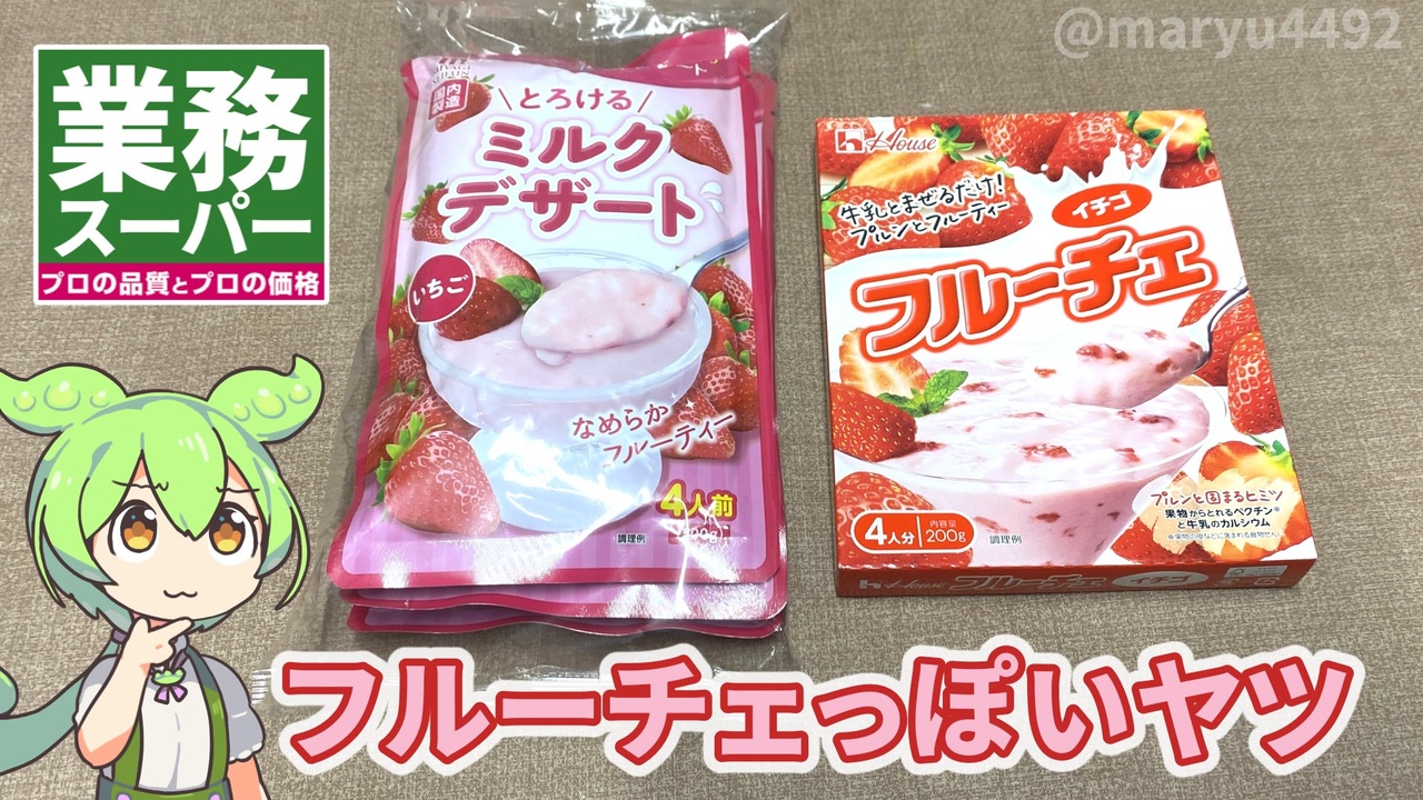 業務スーパーのフルーチェっぽい商品です。<br>本家フルーチェと味はどれくらい違うのでしょうか?<br><br><br><br>【関連動画】<br>トップバリュの「りんご酢と国産果汁で作ったフルーチェっぽいやつ(各278円)」2025.04.07<br><a href="https://www.nicovideo.jp/watch/sm44852931" target="_blank" rel="noopener nofollow">https://www.nicovideo.jp/watch/sm44852931</a><br><br>【参考】<br>とろけるミルクデザート いちご(業務スーパー)<br><a href="https://gyomusuper.jp/product/detail.php?go_id=7681" target="_blank" rel="noopener nofollow">https://gyomusuper.jp/product/detail.php?go_id=7681</a><br>フルーチェ <イチゴ>(ハウス)<br><a href="https://housefoods.jp/products/catalog/cd_1,091826,dess,pdt,furu.html#materials" target="_blank" rel="noopener nofollow">https://housefoods.jp/products/catalog/cd_1,091826,dess,pdt,furu.html#materials</a> <br><br>【使用した素材】(※敬称略) <br>(合成音声)VOICEVOX/ずんだもん/四国めたん<br><a href="https://voicevox.hiroshiba.jp/" target="_blank" rel="noopener nofollow">https://voicevox.hiroshiba.jp/</a> <br>(立ち絵)坂本アヒル<br> <a href="https://seiga.nicovideo.jp/seiga/im10788496?track" target="_blank" rel="noopener nofollow">https://seiga.nicovideo.jp/seiga/im10788496?track</a><br>(楽曲)甘茶の音楽工房/「楽しい麦畑」「フルーツパフェ」「お城の舞踏会」<br><a href="https://amachamusic.chagasi.com/" target="_blank" rel="noopener nofollow">https://amachamusic.chagasi.com/</a>