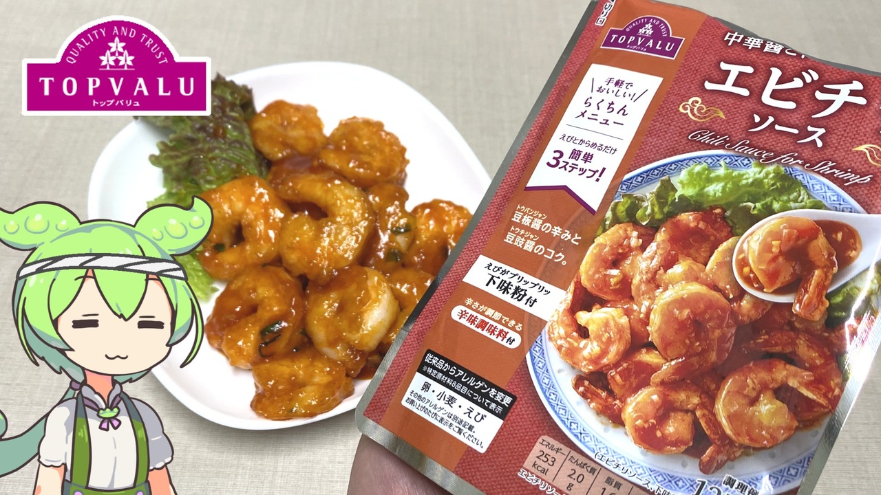 使うトップバリュ製品は、エビチリの素と冷凍むきえびのみ。<br>好みでネギや葉っぱを使ってみましょう。<br>(訂正)動画で使用しているBGMですが、正しくは「のほほん喫茶」です。<br><br>【参考】<br>エビチリソース ※本体価格198円/125g(トップバリュ)<br><a href="https://www.topvalu.net/items/detail/4549414626650/" target="_blank" rel="noopener nofollow">https://www.topvalu.net/items/detail/4549414626650/</a><br>※冷凍むきエビはデータがありませんでした。<br>ホームコーディ 軽くて持ちやすいフライパン ガス火対応(イオンスタイルオンライン)<br><a href="https://aeonretail.com/product/0/P-4973996026063/P-497399602606305/" target="_blank" rel="noopener nofollow">https://aeonretail.com/product/0/P-4973996026063/P-497399602606305/</a><br>株式会社 ダイショー<br><a href="https://www.daisho.co.jp/" target="_blank" rel="noopener nofollow">https://www.daisho.co.jp/</a><br><br>【使用した素材】(※敬称略) <br>(合成音声)VOICEVOX/ずんだもん/四国めたん<br><a href="https://voicevox.hiroshiba.jp/" target="_blank" rel="noopener nofollow">https://voicevox.hiroshiba.jp/</a> <br>(立ち絵)坂本アヒル<br> <a href="https://seiga.nicovideo.jp/seiga/im10788496?track" target="_blank" rel="noopener nofollow">https://seiga.nicovideo.jp/seiga/im10788496?track</a><br>(楽曲)甘茶の音楽工房/「のほほん喫茶」<br><a href="https://amachamusic.chagasi.com/" target="_blank" rel="noopener nofollow">https://amachamusic.chagasi.com/</a>