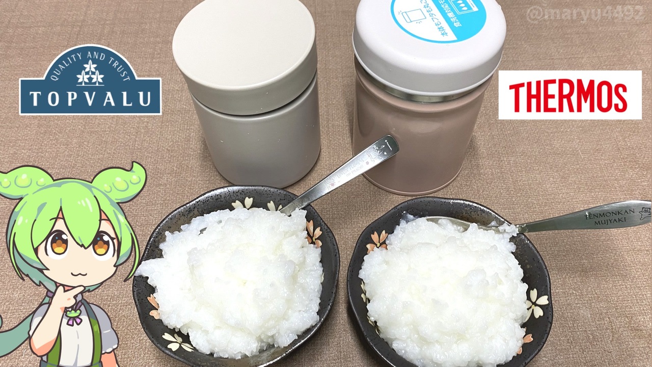 以前、トップバリュの「シンプルフードジャー」を紹介しましたが<br>これでお粥が作れるそうなので試してみようと思います。<br><br><br><br>【関連動画】<br>トップバリュの「シンプルフードジャー」とサーモスの「スープジャー」2025.04.04<br><a href="https://www.nicovideo.jp/watch/sm44842449" target="_blank" rel="noopener nofollow">https://www.nicovideo.jp/watch/sm44842449</a><br><br>【参考】<br>ホームコーディ シンプルフードジャー(イオンスタイルオンライン)<br><a href="https://aeonretail.com/product/0/P-4549414536645/P-454941453664501/" target="_blank" rel="noopener nofollow">https://aeonretail.com/product/0/P-4549414536645/P-454941453664501/</a><br>真空断熱スープジャー/JEB-400(サーモス)<br><a href="https://www.thermos.jp/product/detail/jeb-400.html" target="_blank" rel="noopener nofollow">https://www.thermos.jp/product/detail/jeb-400.html</a><br>おすすめレシピ(農林水産省 東海農政局)※PDFファイル<br><a href="https://www.maff.go.jp/tokai/kikaku/jikyu/recipe/attach/pdf/kantan-8.pdf" target="_blank" rel="noopener nofollow">https://www.maff.go.jp/tokai/kikaku/jikyu/recipe/attach/pdf/kantan-8.pdf</a><br>青菜の和風おかゆ(サーモス)<br><a href="https://www.thermos.jp/recipe/detail/fo_804.html" target="_blank" rel="noopener nofollow">https://www.thermos.jp/recipe/detail/fo_804.html</a><br><br>【使用した素材】(※敬称略) <br>(合成音声)VOICEVOX/ずんだもん/四国めたん<br><a href="https://voicevox.hiroshiba.jp/" target="_blank" rel="noopener nofollow">https://voicevox.hiroshiba.jp/</a> <br>(立ち絵)坂本アヒル<br> <a href="https://seiga.nicovideo.jp/seiga/im10788496?track" target="_blank" rel="noopener nofollow">https://seiga.nicovideo.jp/seiga/im10788496?track</a><br>(楽曲)甘茶の音楽工房/「楽しい麦畑」「フルーツパフェ」「お城の舞踏会」「残業戦士」<br><a href="https://amachamusic.chagasi.com/" target="_blank" rel="noopener nofollow">https://amachamusic.chagasi.com/</a>