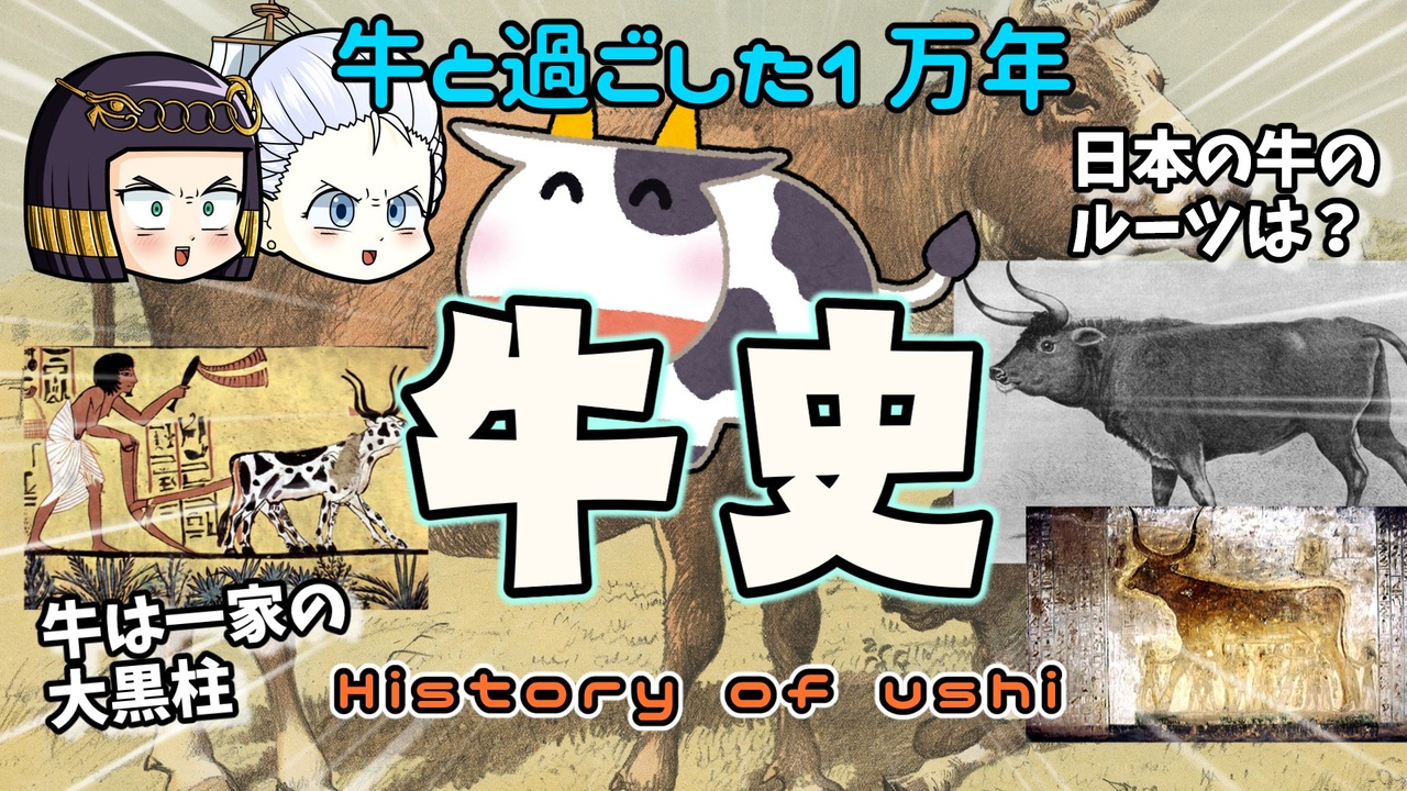 マリーはお腹がいっぱいなようです。 <br><br>現在の地球上には15億頭のウシがいるそうですよ。野生?いません。全部家畜です。 <br>そんなウシちゃんたちのルーツを探ってみたいと思っていましたよね?当然ですよね?それじゃ観ていってくださいそうしましょう。<br><br>☆ニコニコチャンネル「モンド・ヒストリカの離宮」 <br>→<a href="https://ch.nicovideo.jp/mond-historica" target="_blank" rel="noopener nofollow">https://ch.nicovideo.jp/mond-historica</a> <br><br>今回の主要参考文献: <br>遠藤秀紀(2019)『ウシの動物学』東京大学出版会<br>フロリアン・ヴェルナー(2011)『牛の文化史』臼井隆一郎訳 東洋書林<br>平田昌弘(2014)『人とミルクの1万年』岩波書店<br>ハンナ・ヴェルテン(2014)『ミルクの歴史』堤里華訳 原書房<br>ルース・ドフリース(2021)『食糧と人類 飢餓を克服した大増産の文明史』小川敏子訳 日経BP<br><br>その他 Wikipediaなど<br><br />━━━━━━━━━━━━━━━━━━━━━<br><br>この動画はクリエイティブ・コモンズ継承(CC-BY-SA)ライセンスの素材を使用して制作しています。(<a href="https://creativecommons.org/licenses/by-sa/4.0/)" target="_blank" rel="noopener nofollow">https://creativecommons.org/licenses/by-sa/4.0/)</a><br>規約に基づき、この動画もCC-BY-SA 4.0 のもとで公開します。<br><br>投稿者共通情報☆彡<br><br>BGM, SE:ニコニ・コモンズ様<br><a href="http://commons.nicovideo.jp/" target="_blank" rel="noopener nofollow">http://commons.nicovideo.jp/</a><br>魔王魂様<br><a href="https://maoudamashii.jokersounds.com/" target="_blank" rel="noopener nofollow">https://maoudamashii.jokersounds.com/</a><br>Audiostock様<br><a href="https://audiostock.jp/" target="_blank" rel="noopener nofollow">https://audiostock.jp/</a><br><br>立ち絵 霊夢・魔理沙(黒子式):nicotalk様<br><a href="http://www.nicotalk.com/charasozai.html" target="_blank" rel="noopener nofollow">http://www.nicotalk.com/charasozai.html</a><br><br>立ち絵 パトラ、マリー、アン、メアリ:ライフライフ様<br><a href="https://0801lifelife.tumblr.com/" target="_blank" rel="noopener nofollow">https://0801lifelife.tumblr.com/</a><br><br>使用ツール1:ゆっくりムービーメーカー4<br><a href="https://manjubox.net/ymm4/" target="_blank" rel="noopener nofollow">https://manjubox.net/ymm4/</a><br><br>使用ツール2:AviUtl<br><a href="http://spring-fragrance.mints.ne.jp/aviutl/" target="_blank" rel="noopener nofollow">http://spring-fragrance.mints.ne.jp/aviutl/</a><br><br>各時代の地図 : World History Maps & Timelines <br><a href="http://geacron.com/home-en/" target="_blank" rel="noopener nofollow">http://geacron.com/home-en/</a><br><br>ゆっくりボイスについて:AquesTalkライセンス取得済み<br><br>キャラクターボイス<br>アン・ボニー:羽ノ華(A.I.VOICE)<br>メアリ・リード:琴葉 葵(A.I.VOICE)<br>クレオパトラ:結月ゆかり(VOICEROID2)<br>マリー‐アントワネット:東北きりたん (VOICEROID EX)<br>その他キャラ:青山龍星(A.I.VOICE)、伊織弓鶴(A.I.VOICE2)、栗田まろん(A.I.VOICE)、宮舞モカ(VOICEPEAK)、フリモメン(VOICEPEAK)<br><br><br><br>その他フリー素材ご提供元の皆様に圧倒的感謝<br>