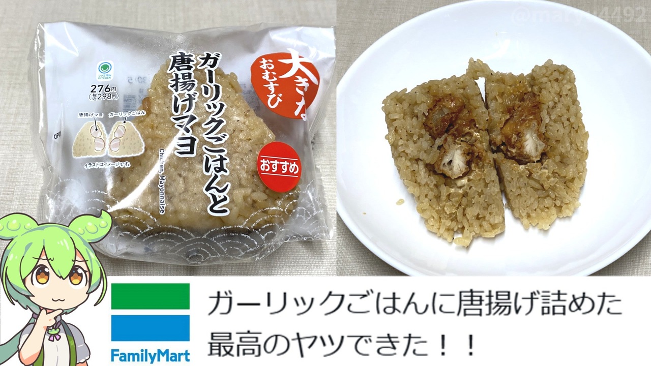 X(旧:ツイッター)を見ていたら、ファミリーマート公式が<br>「最高のヤツできた!!」とポストしていたので<br>味が気になり買ってみることにしました。<br><br><br><br>【前回のファミリーマート】<br>ファミリーマートの東海・北陸エリア限定「とろっとしたチーズのキーマカレーパン(147円)」<br><a href="https://www.nicovideo.jp/watch/sm44685266" target="_blank" rel="noopener nofollow">https://www.nicovideo.jp/watch/sm44685266</a><br><br>【参考】<br>ファミリーマート公式X 2025.05.29<br><a href="https://x.com/famima_now/status/1927922854886318310" target="_blank" rel="noopener nofollow">https://x.com/famima_now/status/1927922854886318310</a><br>大きなおむすび ガーリックごはんと唐揚げマヨ(ファミリーマート)<br><a href="https://www.family.co.jp/goods/omusubi/0411264.html" target="_blank" rel="noopener nofollow">https://www.family.co.jp/goods/omusubi/0411264.html</a><br>株式会社ファーストフーズ名古屋<br><a href="https://ffn.jp/" target="_blank" rel="noopener nofollow">https://ffn.jp/</a><br>株式会社ファーストフーズ名古屋(リクナビ)<br><a href="https://job.rikunabi.com/2026/company/r953762009/" target="_blank" rel="noopener nofollow">https://job.rikunabi.com/2026/company/r953762009/</a><br><br>【使用した素材】(※敬称略) <br>(合成音声)VOICEVOX/ずんだもん/四国めたん/春日部つむぎ<br><a href="https://voicevox.hiroshiba.jp/" target="_blank" rel="noopener nofollow">https://voicevox.hiroshiba.jp/</a> <br>(立ち絵)坂本アヒル<br> <a href="https://seiga.nicovideo.jp/seiga/im10788496?track" target="_blank" rel="noopener nofollow">https://seiga.nicovideo.jp/seiga/im10788496?track</a><br>(楽曲)甘茶の音楽工房/「楽しい麦畑」「フルーツパフェ」「お城の舞踏会」<br><a href="https://amachamusic.chagasi.com/" target="_blank" rel="noopener nofollow">https://amachamusic.chagasi.com/</a>