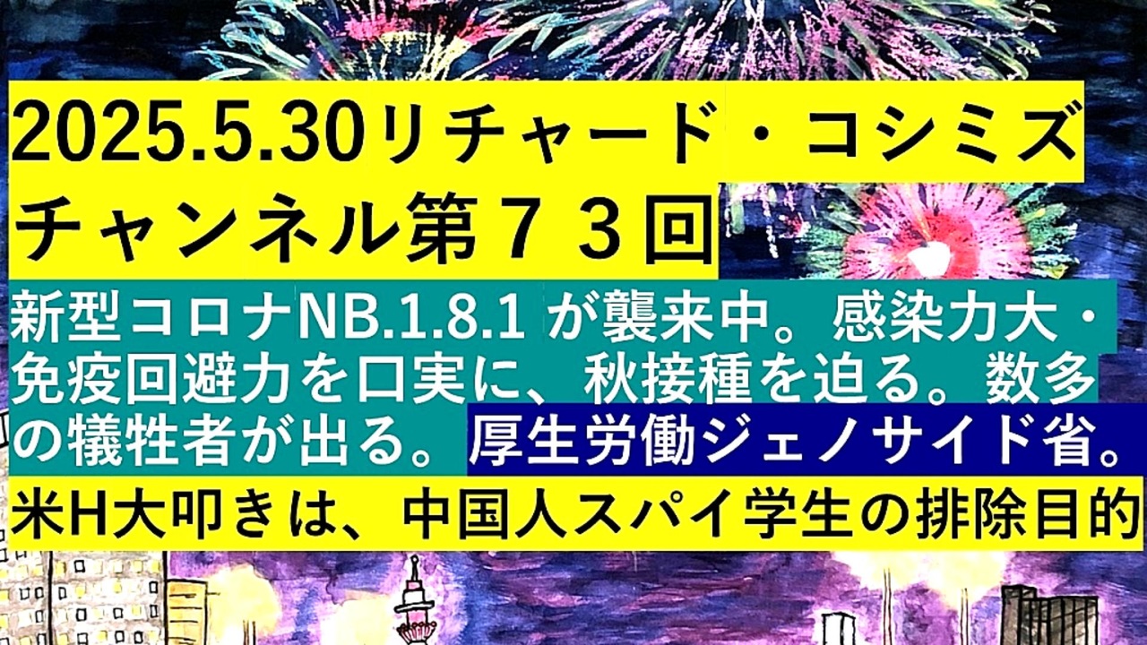 <span style="color: #cc0000;"><strong>◐『「 リチャード・コシミズ・チャンネル 」⦅ 第73回放送 ⦆⦅ 暫定版 ⦆』</strong></span><br><br> <span style="color: #ff0000;"><strong>「『 新型コロナ NB.1.8.1 』が『 襲来中 』。『 感染力大 』・『 免疫回避力 』を『 口実 』に、『 秋接種 』を『 迫る 』。『 数多 』の『 犠牲者 』が『 出る 』。<br> 『 厚生労働ジェノサイド省 』。『 米ハーバード大学叩き 』は、『 中国人スパイ学生 』の『 排除目的 』」</strong></span><br><br> <span style="color: #38761d;"><strong>◐『 リチャード・コシミズ・チャンネル⦅ ニコニコ チャンネル ⦆』</strong></span><br> <span style="color: #0000ff;"><strong><a href="https://ch.nicovideo.jp/richardkoshimizu" target="_blank" rel="noopener nofollow">https://ch.nicovideo.jp/richardkoshimizu</a></strong></span><br><br> <span style="color: #38761d;"><strong>◐『 リチャード・コシミズ「 ニコニコ生放送⦅ LIVE ⦆」』</strong></span><br> <span style="color: #0000ff;"><strong><a href="https://www.nicovideo.jp/user/120930363/live_programs" target="_blank" rel="noopener nofollow">https://www.nicovideo.jp/user/120930363/live_programs</a></strong></span><br><br> <span style="color: #38761d;"><strong>◐『「 リチャード・コシミズ 講演会 」公式「 動画ギャラリー 」⦅ 最新動画 ⦆⦅ YouTube版 ⦆』</strong></span><br> <span style="color: #0000ff;"><strong><a href="https://www.youtube.com/@richardkoshimizu-video-gallery" target="_blank" rel="noopener nofollow">https://www.youtube.com/@richardkoshimizu-video-gallery</a></strong></span><br><br> <span style="color: #38761d;"><strong>◐『「 リチャード・コシミズ 講演会 」公式「 動画ギャラリー 」⦅ 全動画 ⦆⦅ YouTube版 ⦆』</strong></span><br> <span style="color: #0000ff;"><strong><a href="https://www.youtube.com/@RK-Video-Gallery" target="_blank" rel="noopener nofollow">https://www.youtube.com/@RK-Video-Gallery</a></strong></span><br>