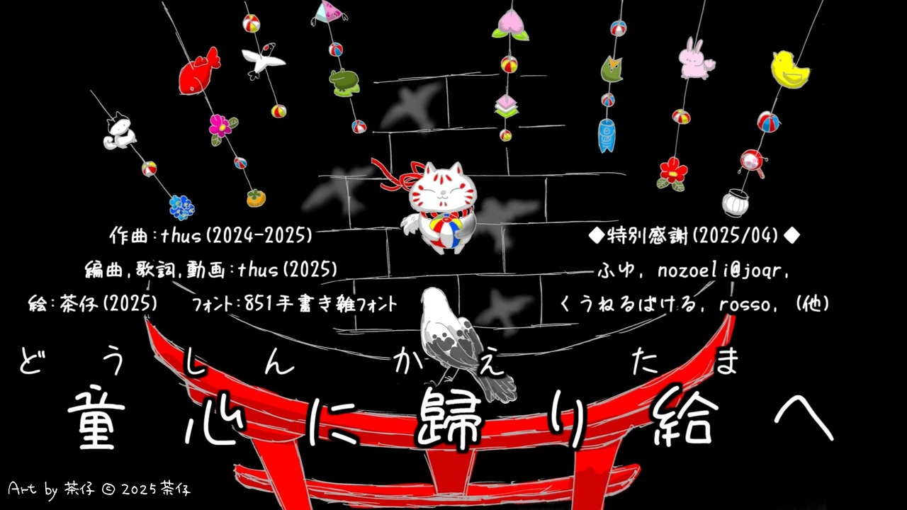 Art by 茶仔 © 2025 茶仔<br>(X:<a href="https://x.com/chacomalo" target="_blank" rel="noopener nofollow">https://x.com/chacomalo</a> )<br>―<br>◆「第五回ボイパロイド投稿祭」出展作品です(詳細:<a href="https://sites.google.com/view/voiperroid-fes5/%E3%83%9B%E3%83%BC%E3%83%A0" target="_blank" rel="noopener nofollow">https://sites.google.com/view/voiperroid-fes5/%E3%83%9B%E3%83%BC%E3%83%A0</a> )<br>・開催日時:2025/06/(07 - 22)<br>・主催:にゃんちゃ(<a href="https://www.nicovideo.jp/user/18857375" target="_blank" rel="noopener">user/18857375</a> ), ぬーぴー(<a href="https://www.nicovideo.jp/user/33929252" target="_blank" rel="noopener">user/33929252</a> )<br>―――<br><br> 童心に歸り給ヘ。(カラオケ動画:<a href="https://www.nicovideo.jp/watch/sm45053954" class="watch">sm45053954</a> )<br> 前回鳥渡書いた通り、ボカコレアプリ歌詞用に、タイムタグ付き歌詞ファイルからsrt/lrcファイルへ翻訳するマクロが無事完成しまして、ボタンを押すだけでsrt/lrc歌詞がどんどん大量生産されます。カラオケ動画用に既に作っていたタイムタグ付き歌詞ファイル、そんな無かった筈と思って見ると何と60曲強…そんな前からカラオケ動画は作っていたかと思いながら勝手に生成される字幕ファイルを眺めるだけ。それからそれらの字幕ファイルはYouTubeにも投稿可能でして、概要欄に歌詞書いてるからいらんかと思っていたのですが、YouTubeの動画再生プレーヤーには自動字幕翻訳機能があるので、これを利用すれば動画に同期した機械翻訳字幕が表示されるのです。という訳で、これでYouTubeは曲がりなりにもYouTubeが対応する言語全部で私の歌詞へアクセスできるようになったという訳だァ。良いぞ…その調子だ…どんどん増えろ、YouTube対応言語よ……ふーっふっふwあーはぁーはぁーはーっwうあぁーはぁーはぁーはぁーはぁーはっwふぁっはっはっはっはぁーっwwひぁっはっはっはっww<br> …でも矢張りちゃんと母語話者の方の翻訳を経て私の監修を通ったものは迚もプライスレスなので、この機械翻訳は飽くまで応急手当(クッパを諫めるような声色)。<br> ああんもう、変な笑い声書いてたら字数が一気に消費されてしまった。これじゃ書きたいCHAOSが書けないじゃないか。ふーっふっふwあーはぁーはぁーはーっwうあぁーはぁーはぁーはぁーはぁーはっwふぁっはっはっはっはぁーっwwひぁっはっはっはっww<br><br> 因みに曰く、srtはSubRipText(SubRipテキスト(SubRipという字幕抽出ソフト用の保存データ))の略らしく、lrcはLyRiCs(歌詞)の略らしいです。これで覚えましょう。<br><br>2025/06/09 08:08:2,525再生<br /><br><br><br>====================<br>| 2026/01/04 21:00「インスペクタの自死未遂」:<a href="https://www.nicovideo.jp/watch/sm45800854" class="watch">sm45800854</a><br>| 投稿曲マイリスト:<a href="https://www.nicovideo.jp/mylist/57867175" target="_blank" rel="noopener">mylist/57867175</a><br>|――――――――――――――――――<br>| pixivFANBOX:<a href="https://thus.fanbox.cc/" target="_blank" rel="noopener nofollow">https://thus.fanbox.cc/</a><br>| アルバム等配信中:<a href="https://thus-library.blogspot.com/search/label/discography" target="_blank" rel="noopener nofollow">https://thus-library.blogspot.com/search/label/discography</a><br>| つなぐ(依頼・リクエスト):<a href="https://tsunagu.cloud/users/thus" target="_blank" rel="noopener nofollow">https://tsunagu.cloud/users/thus</a><br>|――――――――――――――――――<br>| YouTube:<a href="https://youtube.com/@thus" target="_blank" rel="noopener nofollow">https://youtube.com/@thus</a><br>| X:<a href="https://x.com/thus_submission" target="_blank" rel="noopener nofollow">https://x.com/thus_submission</a><br>| 他全リンク:<a href="https://lit.link/thus" target="_blank" rel="noopener nofollow">https://lit.link/thus</a><br>|――――――――――――――――――<br>| オフボーカル等:<a href="https://piapro.jp/thus_999discommunication" target="_blank" rel="noopener nofollow">https://piapro.jp/thus_999discommunication</a><br>| 楽曲/動画の二次利用に関して:<a href="https://bit.ly/3JRQQiZ" target="_blank" rel="noopener nofollow">https://bit.ly/3JRQQiZ</a><br><span style="color: #262626;">| </span><span style="color: #262626;"><strong>歌詞図書館(ふりがな有るよ!):</strong></span><a href="https://thus-library.blogspot.com/" target="_blank" rel="noopener nofollow">https://thus-library.blogspot.com/</a><br>====================