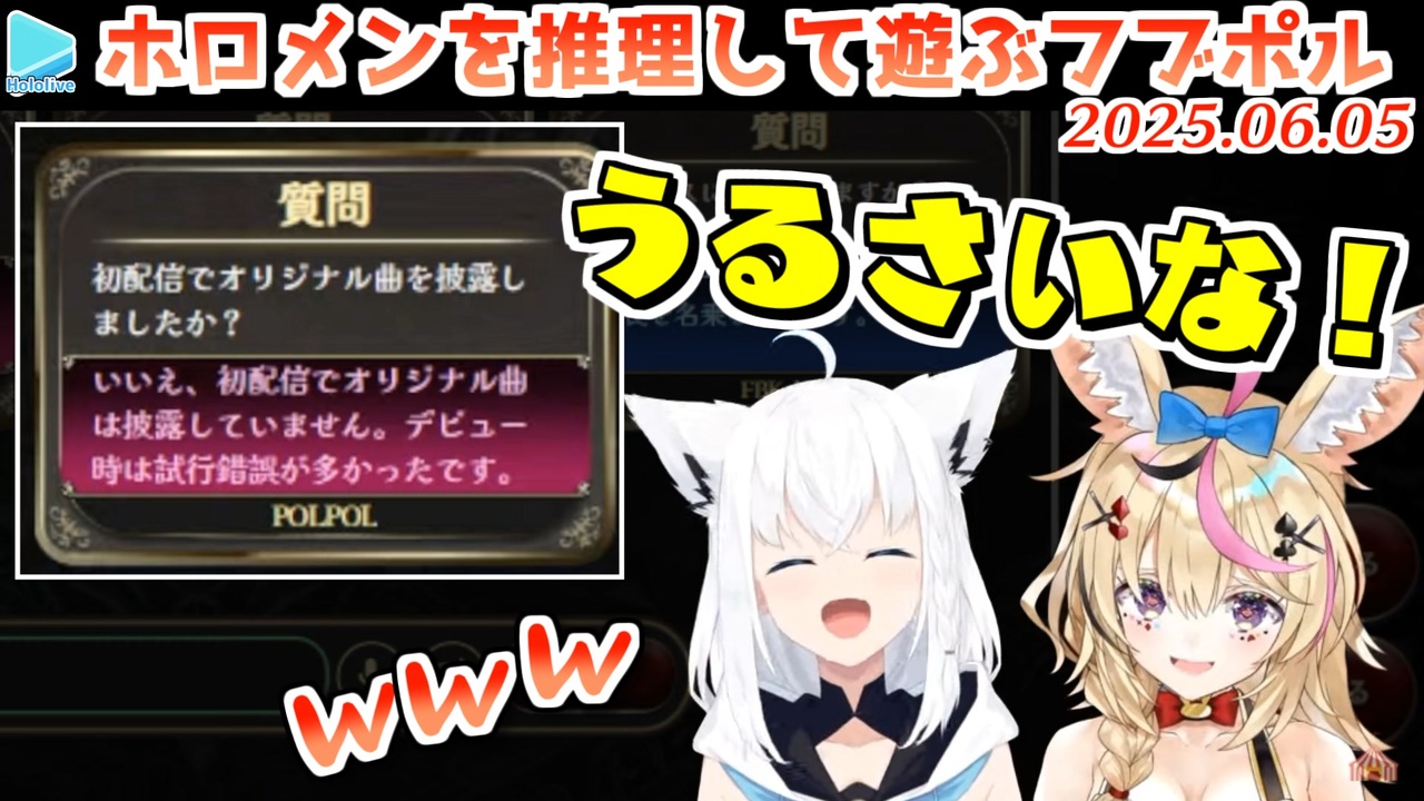 <a href="#" class="seekTime" data-seekTime="00:00" onclick="seekNicoPlayer('#00:00'); return false;">#00:00</a> ホロメンクイズで遊ぼう<br><a href="#" class="seekTime" data-seekTime="00:19" onclick="seekNicoPlayer('#00:19'); return false;">#00:19</a> 1問目<br><a href="#" class="seekTime" data-seekTime="00:49" onclick="seekNicoPlayer('#00:49'); return false;">#00:49</a> 2問目<br><a href="#" class="seekTime" data-seekTime="01:14" onclick="seekNicoPlayer('#01:14'); return false;">#01:14</a> 3問目<br><a href="#" class="seekTime" data-seekTime="02:07" onclick="seekNicoPlayer('#02:07'); return false;">#02:07</a> 4問目<br><a href="#" class="seekTime" data-seekTime="02:56" onclick="seekNicoPlayer('#02:56'); return false;">#02:56</a> 5問目<br><a href="#" class="seekTime" data-seekTime="03:56" onclick="seekNicoPlayer('#03:56'); return false;">#03:56</a> 6問目<br><a href="#" class="seekTime" data-seekTime="04:58" onclick="seekNicoPlayer('#04:58'); return false;">#04:58</a> 7問目<br><a href="#" class="seekTime" data-seekTime="06:13" onclick="seekNicoPlayer('#06:13'); return false;">#06:13</a> 8問目<br><a href="#" class="seekTime" data-seekTime="08:05" onclick="seekNicoPlayer('#08:05'); return false;">#08:05</a> 9問目<br><a href="#" class="seekTime" data-seekTime="10:36" onclick="seekNicoPlayer('#10:36'); return false;">#10:36</a> 10問目<br><br>元動画様はこちら<br>【みんなで推理】違うな、その推理…間違っているぞ!朝から推理wwwwwww #フブポル 【尾丸ポルカ/白上フブキ/ホロライブ】<br><a href="https://youtu.be/UWp6KLUiHpE" target="_blank" rel="noopener nofollow">https://youtu.be/UWp6KLUiHpE</a><br><br>《BAE-GEMITE DOMINATION》Episode 7 w/ A-chan and Yagoo<br><a href="https://youtu.be/Gp1j9_0BOiU" target="_blank" rel="noopener nofollow">https://youtu.be/Gp1j9_0BOiU</a><br><br>『ホロライブ・オルタナティブ』 ティザーPV(Fullver)<br><a href="https://youtu.be/3RxlzJWWzdY" target="_blank" rel="noopener nofollow">https://youtu.be/3RxlzJWWzdY</a><br><br>【 行方不明 】犬のおまわりさん、参る!!【 Missing Children 】<br><a href="https://youtu.be/LktYk5npPFo" target="_blank" rel="noopener nofollow">https://youtu.be/LktYk5npPFo</a><br><br>フブキCh。白上フブキ <a href="https://t.co/R9TNhC7sPO" target="_blank" rel="noopener nofollow">https://t.co/R9TNhC7sPO</a><br>Polka Ch. 尾丸ポルカ <a href="https://t.co/vndDeLCxUE" target="_blank" rel="noopener nofollow">https://t.co/vndDeLCxUE</a><br><br>みんなで推理<br><a href="https://store.steampowered.com/app/3023190/" target="_blank" rel="noopener nofollow">https://store.steampowered.com/app/3023190/</a><br /><span style="color: #b7b7b7; font-size: 10px;">ホロライブ切り抜き/なめたけ <a href="https://t.co/CBwJLnYR2c" target="_blank" rel="noopener nofollow">https://t.co/CBwJLnYR2c</a></span>
