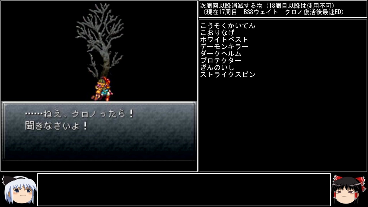 17周目のpart1です。<br>せっかくのタイマンなのに、またしてもサムネでの出番を奪われる魔王様。<br><br>前→<a href="https://www.nicovideo.jp/watch/sm45029967" class="watch">sm45029967</a><br>次→<a href="https://www.nicovideo.jp/watch/sm45082801" class="watch">sm45082801</a><br><br>YouTube版→<a href="https://youtu.be/FXiasXO1neo" target="_blank" rel="noopener nofollow">https://youtu.be/FXiasXO1neo</a><br><br>縛りルール<br>①一度使った武器・防具・アクセサリー・道具・技・連携は<br> 次周回以降使用禁止(売却も解禁扱い)<br><br>②一度戦った敵シンボルとの再戦禁止。<br><br>③初戦闘の敵からの逃走禁止。<br><br>④裏技、バグ技、状況再現禁止。<br><br>⑤BS1アクティブからBS8ウェイトまで<br> 全てのバトルスピードとバトルモードで攻略する。<br><br>⑥各周回において見る予定のED条件を<br> 満たした段階で即ラヴォスと戦いに行く。<br><br>※ネタバレ注意です<br><br>このページ、動画で利用している弊社または弊社のライセンサーが権利を有する著作物の転載・配布は禁止いたします。<br>© 1995, 2018 SQUARE ENIX<br>Illustration: © 1995 BIRD STUDIO / SHUEISHA<br>Story and Screenplay: © 1995, 2008 ARMOR PROJECT / SQUARE ENIX<br><br>AquesTalk2ライセンスID:AQTK2WINUSR23122185<br /><br><br>❤いいねを押していただけるとモチベーションと投稿速度が上がるので宜しくお願い致します!<br><br>作者ツイッター→ <a href="https://twitter.com/nig0117" target="_blank" rel="noopener nofollow">https://twitter.com/nig0117</a><br>PIXIV FANBOX→ <a href="https://sutanokeiji.fanbox.cc/" target="_blank" rel="noopener nofollow">https://sutanokeiji.fanbox.cc/</a><br><br>( 以前はWEB小説書いてました→ <a href="https://kakuyomu.jp/works/1177354054884910267" target="_blank" rel="noopener nofollow">https://kakuyomu.jp/works/1177354054884910267</a> )