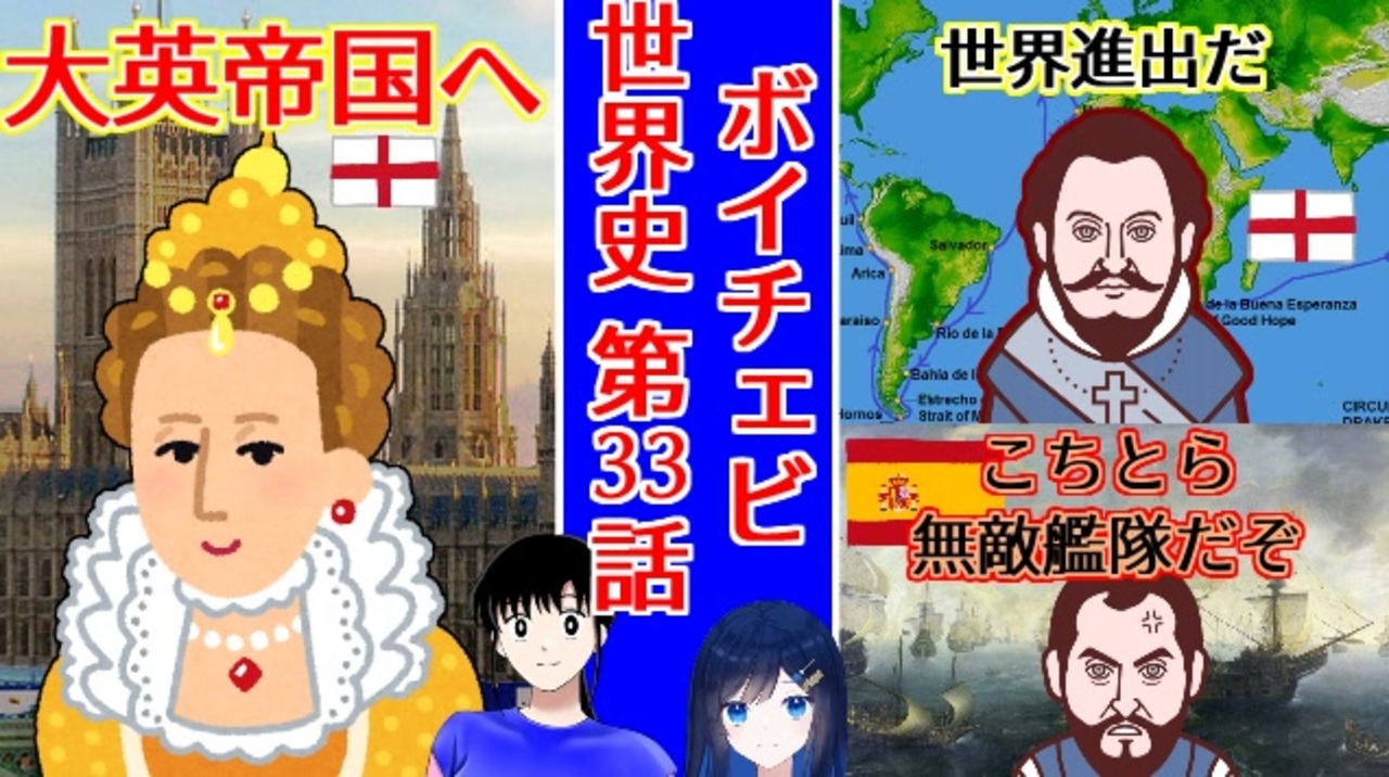 日テレ系「まんが日本史」をオマージュし、<br>学習漫画「世界の歴史」を教科書とした<br>ボイチェビ世界史 第33回は、<br>エリザベス1世のイングランド王国です。<br><br>「歴史学者・ことりさん」が、<br>no.7(voicevox)の声でご案内いたします。<br>そしてアシスタントに双葉湊音ちゃんを起用。<br><br>EDテーマ「風のメルヘン」は、<br>波音リツ(voicevox)が歌います。<br><br>注意点<br>・独自の解釈で作成しておりますので、<br> 皆様の思想とそぐわない場合がございます。<br>・セリフおよび画像は、その一部は教科書など参考文献から<br>引用させていただくことがあります。<br>・演出のために、舞台の時代にそぐわない画像や<br>音楽を使う場合がございます。<br>・セリフ発声はすべて合成音声(ゆっくり系は使いません)<br>・BGMは、他者作成のBGMや音楽を借ります。<br>・若干の表記ゆれはご容赦ください。<br>・親作品は動画最後のスタッフロール画面に掲載します。<br><br>0:57 第1章 ブラッディ・メアリ<br><a href="https://www.nicovideo.jp/watch/sm45074970?from=57" target="_blank" rel="noopener nofollow">https://www.nicovideo.jp/watch/sm45074970?from=57</a><br><br>5:45 第2章 エリザベス女王即位<br><a href="https://www.nicovideo.jp/watch/sm45074970?from=345" target="_blank" rel="noopener nofollow">https://www.nicovideo.jp/watch/sm45074970?from=345</a><br><br>8:41 第3章 太陽の沈まない国・スペイン<br><a href="https://www.nicovideo.jp/watch/sm45074970?from=521" target="_blank" rel="noopener nofollow">https://www.nicovideo.jp/watch/sm45074970?from=521</a><br><br>10:52 第4章 アルマダの海戦<br><a href="https://www.nicovideo.jp/watch/sm45074970?from=652" target="_blank" rel="noopener nofollow">https://www.nicovideo.jp/watch/sm45074970?from=652</a><br><br>15:04 第5章 晩年のエリザベス1世<br><a href="https://www.nicovideo.jp/watch/sm45074970?from=904" target="_blank" rel="noopener nofollow">https://www.nicovideo.jp/watch/sm45074970?from=904</a><br><br>17:07 いきなり!本編終了<br><a href="https://www.nicovideo.jp/watch/sm45074970?from=1027" target="_blank" rel="noopener nofollow">https://www.nicovideo.jp/watch/sm45074970?from=1027</a><br><br>20:55 ???<br><a href="https://www.nicovideo.jp/watch/sm45074970?from=1255" target="_blank" rel="noopener nofollow">https://www.nicovideo.jp/watch/sm45074970?from=1255</a>
