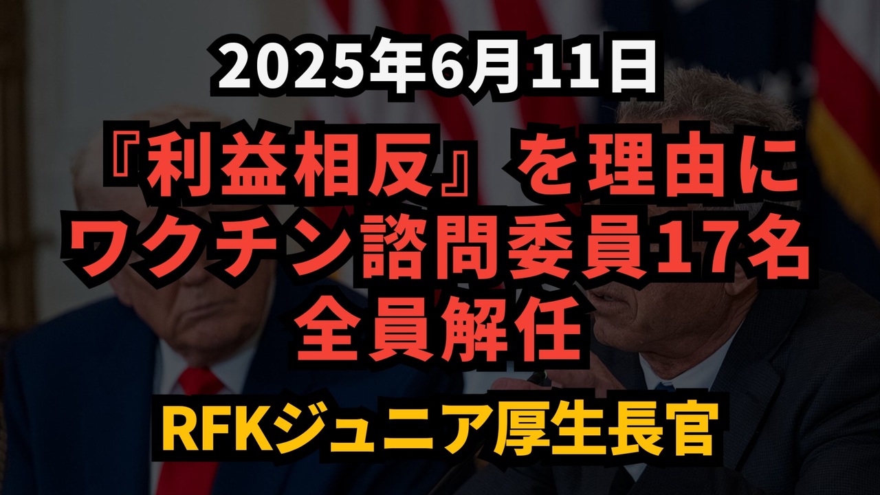 アメリカ保健福祉長官のロバート・F・ケネディ・ジュニア氏が、CDCのワクチン政策を助言する諮問委員会「ACIP」の全17名を突然解任。長年にわたり医薬業界の利害と結びついてきたと批判されるこの委員会への、大胆かつ前例のない「クリーン・スイープ」が行われました。これは単なる人事ではなく、アメリカのワクチン政策そのものの根幹を揺るがす一大改革。果たしてこれは信頼回復の一歩か、それとも新たな論争の始まりか──注目が集まっています。<br><br><a href="https://x.com/AaronOtsuka/status/1932190889881059511?t=4lMCPzuIzribjTKLUjOElQ&s=19" target="_blank" rel="noopener nofollow">https://x.com/AaronOtsuka/status/1932190889881059511?t=4lMCPzuIzribjTKLUjOElQ&s=19</a><br><br><br>◆ 今回の台本<br><a href="https://keiichiro8140.hatenablog.com/entry/20250611222" target="_blank" rel="noopener nofollow">https://keiichiro8140.hatenablog.com/entry/20250611222</a><br><br><br>◆YouTubeでも投稿中!チャンネル登録よろしくお願いします<br><a href="https://x.gd/uxU5M" target="_blank" rel="noopener nofollow">https://x.gd/uxU5M</a><br><br><br>◆もしもの時のためのマイリンク集<br><a href="https://lit.link/keiichiro8140" target="_blank" rel="noopener nofollow">https://lit.link/keiichiro8140</a><br><br><br />著作権、肖像権に配慮して作成しております。<br><br>◆気になったニュースの台本!?<br>メモ代わりに作った台本をそのままあげてます<br><a href="https://keiichiro8140.hatenablog.com/." target="_blank" rel="noopener nofollow">https://keiichiro8140.hatenablog.com/.</a><br><br><br>ここからはシリーズ紹介<br><br><br>◆ ワクチン解毒・デトックス<br><a href="https://x.gd/fZweg" target="_blank" rel="noopener nofollow">https://x.gd/fZweg</a><br><br>◆ウイリアム・マキス博士のがん治療(イベルメクチン・フェンベンダゾール等)<br><a href="https://x.gd/AtFYS" target="_blank" rel="noopener nofollow">https://x.gd/AtFYS</a><br><br>◆予防接種健康被害救済制度<br><a href="https://x.gd/0xK9x" target="_blank" rel="noopener nofollow">https://x.gd/0xK9x</a><br><br>◆気になったニュース #1501~<br><br>◆ 【ショートver】気になったニュース<br><a href="https://x.gd/7MxXC" target="_blank" rel="noopener nofollow">https://x.gd/7MxXC</a><br><br>◆ 気になったニュース #1001~<br><a href="https://x.gd/Lp8gv" target="_blank" rel="noopener nofollow">https://x.gd/Lp8gv</a><br><br>◆ 気になったニュース #501~<br><a href="https://x.gd/EmbS4" target="_blank" rel="noopener nofollow">https://x.gd/EmbS4</a><br><br>◆ 気になったニュース #1~#500<br><a href="https://x.gd/uPhNb" target="_blank" rel="noopener nofollow">https://x.gd/uPhNb</a><br><br>◆ X(旧Twitter)・テレグラムで気になった情報<br><a href="https://x.gd/YG6FT" target="_blank" rel="noopener nofollow">https://x.gd/YG6FT</a><br><br>◆ 日比谷5万人パレードデ⚪生放送アーカイブ動画<br><a href="https://x.gd/3CHJv" target="_blank" rel="noopener nofollow">https://x.gd/3CHJv</a><br><br>◆日比谷5万人パレード⚪モのマイリスト作ってみました<br><a href="https://nico.ms/mylist/76828848?ref=sp_other" target="_blank" rel="noopener nofollow">https://nico.ms/mylist/76828848?ref=sp_other</a><br><br>◆3.30 令和の百姓⚪⚪<br><a href="https://www.nicovideo.jp/series/511791?ref=garage_share_other" target="_blank" rel="noopener nofollow">https://www.nicovideo.jp/series/511791?ref=garage_share_other</a><br><br>◆ 及川幸久さんの【XNEWS】シリーズ<br><a href="https://x.gd/3k78K" target="_blank" rel="noopener nofollow">https://x.gd/3k78K</a><br><br>◆これまでの動画<a href="https://x.gd/sPXoJ" target="_blank" rel="noopener nofollow">https://x.gd/sPXoJ</a><br><br>◆もしも(BAN)の時のためのマイリンク集<a href="https://lit.link/K-16_News44" target="_blank" rel="noopener nofollow">https://lit.link/K-16_News44</a><br><br>