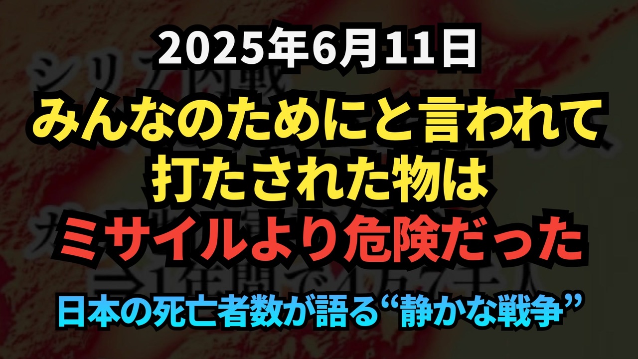 2023年、日本の死亡者数は158万人超。シリア内戦やガザの戦闘を遥かに超えるこの数字の意味とは?「銃やミサイルより、静かに効いてしまう“生物兵器”の方が恐ろしい」と語る元教授。そして「次に“強制”されたらどうしますか?」という問いに、原口一博議員は即答。「絶対やっちゃダメです!」と警告。警察官出身のゆりさんも「私も同じ意見です」と応じました。さらに原口議員は、政治家への脅迫やハニートラップの実態についても赤裸々に言及。「敵は外じゃない。中にいる」──。静かに進行する“見えない戦争”をあなたは見抜けるか。<br>①<a href="https://x.com/MdHosokawa/status/1932143007643697435" target="_blank" rel="noopener nofollow">https://x.com/MdHosokawa/status/1932143007643697435</a><br><br>②<a href="https://x.com/JmaxTopics/status/1932581127795204188" target="_blank" rel="noopener nofollow">https://x.com/JmaxTopics/status/1932581127795204188</a><br><br>③<a href="https://x.com/jinkouzouka_jp/status/1932480077142610317?s=46&t=JNap8KXr0s6Q-ujfeBOWHw" target="_blank" rel="noopener nofollow">https://x.com/jinkouzouka_jp/status/1932480077142610317?s=46&t=JNap8KXr0s6Q-ujfeBOWHw</a><br><br><br>◆ 今回の台本<br><a href="https://keiichiro8140.hatenablog.com/entry/20250611444" target="_blank" rel="noopener nofollow">https://keiichiro8140.hatenablog.com/entry/20250611444</a><br><br><br>◆もしもの時のためのマイリンク集<br><a href="https://lit.link/keiichiro8140" target="_blank" rel="noopener nofollow">https://lit.link/keiichiro8140</a><br><br><br>【過去最悪】◆自然増減人口93万人減は異常事態!過去最悪の統計に「高齢化」では説明不可能な死者急増の実態<br><a href="https://www.nicovideo.jp/watch/sm45031315" class="watch">sm45031315</a><br><br><br />著作権、肖像権に配慮して作成しております。<br><br>◆気になったニュースの台本!?<br>メモ代わりに作った台本をそのままあげてます<br><a href="https://keiichiro8140.hatenablog.com/." target="_blank" rel="noopener nofollow">https://keiichiro8140.hatenablog.com/.</a><br><br><br>ここからはシリーズ紹介<br><br><br>◆ ワクチン解毒・デトックス<br><a href="https://x.gd/fZweg" target="_blank" rel="noopener nofollow">https://x.gd/fZweg</a><br><br>◆ウイリアム・マキス博士のがん治療(イベルメクチン・フェンベンダゾール等)<br><a href="https://x.gd/AtFYS" target="_blank" rel="noopener nofollow">https://x.gd/AtFYS</a><br><br>◆予防接種健康被害救済制度<br><a href="https://x.gd/0xK9x" target="_blank" rel="noopener nofollow">https://x.gd/0xK9x</a><br><br>◆気になったニュース #1501~<br><br>◆ 【ショートver】気になったニュース<br><a href="https://x.gd/7MxXC" target="_blank" rel="noopener nofollow">https://x.gd/7MxXC</a><br><br>◆ 気になったニュース #1001~<br><a href="https://x.gd/Lp8gv" target="_blank" rel="noopener nofollow">https://x.gd/Lp8gv</a><br><br>◆ 気になったニュース #501~<br><a href="https://x.gd/EmbS4" target="_blank" rel="noopener nofollow">https://x.gd/EmbS4</a><br><br>◆ 気になったニュース #1~#500<br><a href="https://x.gd/uPhNb" target="_blank" rel="noopener nofollow">https://x.gd/uPhNb</a><br><br>◆ X(旧Twitter)・テレグラムで気になった情報<br><a href="https://x.gd/YG6FT" target="_blank" rel="noopener nofollow">https://x.gd/YG6FT</a><br><br>◆ 日比谷5万人パレードデ⚪生放送アーカイブ動画<br><a href="https://x.gd/3CHJv" target="_blank" rel="noopener nofollow">https://x.gd/3CHJv</a><br><br>◆日比谷5万人パレード⚪モのマイリスト作ってみました<br><a href="https://nico.ms/mylist/76828848?ref=sp_other" target="_blank" rel="noopener nofollow">https://nico.ms/mylist/76828848?ref=sp_other</a><br><br>◆3.30 令和の百姓⚪⚪<br><a href="https://www.nicovideo.jp/series/511791?ref=garage_share_other" target="_blank" rel="noopener nofollow">https://www.nicovideo.jp/series/511791?ref=garage_share_other</a><br><br>◆ 及川幸久さんの【XNEWS】シリーズ<br><a href="https://x.gd/3k78K" target="_blank" rel="noopener nofollow">https://x.gd/3k78K</a><br><br>◆これまでの動画<a href="https://x.gd/sPXoJ" target="_blank" rel="noopener nofollow">https://x.gd/sPXoJ</a><br><br>◆もしも(BAN)の時のためのマイリンク集<a href="https://lit.link/K-16_News44" target="_blank" rel="noopener nofollow">https://lit.link/K-16_News44</a><br><br>