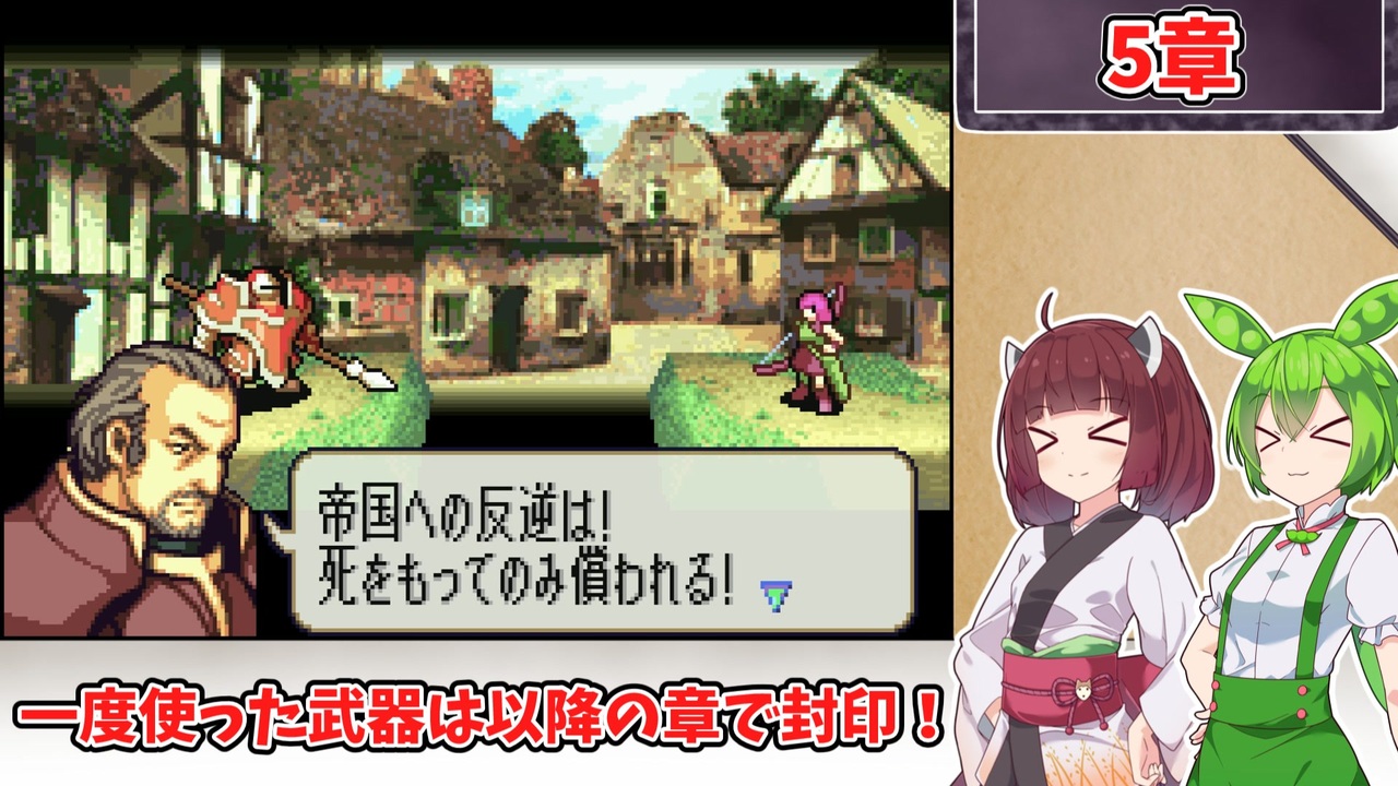 <span style="color: #85200c; font-size: 24px;"><strong><i>ユニットとしての出番は暫く先となる人達が<br>顔見せだけしてくる章</i></strong></span><br><br><br><span style="font-size: 16px;"><strong>1:一度使用した武器種は、以降の章で使用する事を禁止する。<br>2:武器の使用の定義は『その武器を装備した状態で敵との戦闘が発生したタイミング』<br>または『その武器を売却したタイミング』<br>杖の場合は『対象に対して使用した時点(命中の可否は問わない)』とする。 </strong></span><br><span style="color: #ff0000; font-size: 16px;"><strong>※同盟軍、演出による戦闘イベントでは使用した判定にはならないこととする。</strong></span><span style="font-size: 16px;"><strong> <br>3:仲間候補のユニットを全員加入、生存させた状態でゲームをクリアする。<br>4:上級クラスのユニットは「武器を装備した状態」での戦闘を禁止する。<br>5:バグ技禁止</strong></span><br><br>この動画シリーズ【<a href="https://www.nicovideo.jp/series/516459" target="_blank" rel="noopener">series/516459</a>】<br>『トラ7』の同縛りプレイ【<a href="https://www.nicovideo.jp/series/482976" target="_blank" rel="noopener">series/482976</a>】<br>『烈火』の同縛りプレイ【<a href="https://www.nicovideo.jp/series/406473" target="_blank" rel="noopener">series/406473</a>】<br>『封印』の同縛りプレイ【<a href="https://www.nicovideo.jp/series/316824" target="_blank" rel="noopener">series/316824</a>】<br><br>前:【<a href="https://www.nicovideo.jp/watch/sm45049894" class="watch">sm45049894</a>】次:【<a href="https://www.nicovideo.jp/watch/sm45093503" class="watch">sm45093503</a>】<br><br><strong>使用したソフト</strong><br>VOICEROID+東北きりたんEX<br>VOICEVOX:ずんだもん<br>VOICEPEAK:ずんだもん<br><strong>お借りした素材</strong><br>ニコニコモンズの皆様(コンテンツツリー参照)<br><br><a target="_blank" href="https://qa.nicovideo.jp/faq/show/19424?site_domain=default" style="font-size: 13px;color: #657586; text-decoration: underline; line-height: 1.4">この動画は投稿者によって修正されました</a>