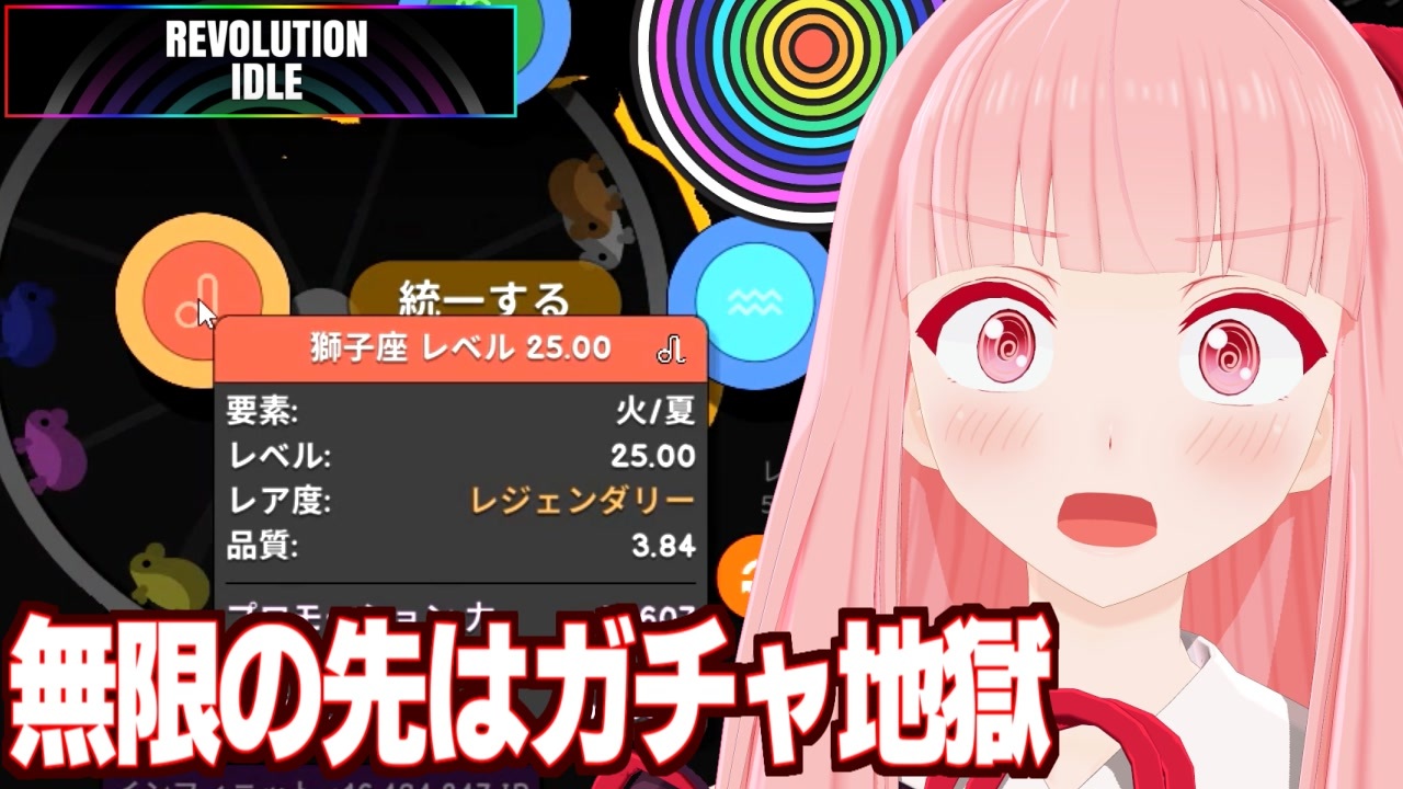 琴葉葵「急にガチャが出ます」 <br>茜ちゃん「本当に急に出てきたよな」<br><br>◇マイリスト <br>単発動画:<a href="https://www.nicovideo.jp/mylist/63434282" target="_blank" rel="noopener">mylist/63434282</a><br>Part1リスト:<a href="https://www.nicovideo.jp/mylist/62982810" target="_blank" rel="noopener">mylist/62982810</a> <br><br>◇投稿者 <br>twitter:<a href="https://twitter.com/moco7800" target="_blank" rel="noopener nofollow">https://twitter.com/moco7800</a><br><br>◇ゲーム<br><a href="https://store.steampowered.com/app/2763740/Revolution_Idle/" target="_blank" rel="noopener nofollow">https://store.steampowered.com/app/2763740/Revolution_Idle/</a><br><br>◇参考<br>Revolution Idle Wiki*<br><br>◇猫のイラスト<br>ねこ画伯コハクちゃん様<br><br>◇チャレンジの順番<br>永遠→数秒待機で再度永遠(スコアを稼いでアニマルを買う)→<br>4-1/4-2/5-1/5-2/6-1/6-2/7-1/7-2/4-3/4-4<br>5-3/5-4/8-1/6-3/8-2/7-3/5-5/9-1/4-5/6-4/<br>8-3/8-4/8-5/6-5/7-4/9-2/9-3/9-4<br>数秒待機(スコアを稼いでアニマルを買う)<br>7-5<br>ダイレーション稼ぎ<br>10-1/9-5/10-2/10-3/10-4/10-5<br><br>※チャレンジの4~5番はユニティを進めるとクリア済になる<br>※待機は稼ぐようになると不要<br><br><a target="_blank" href="https://qa.nicovideo.jp/faq/show/19424?site_domain=default" style="font-size: 13px;color: #657586; text-decoration: underline; line-height: 1.4">この動画は投稿者によって修正されました</a>