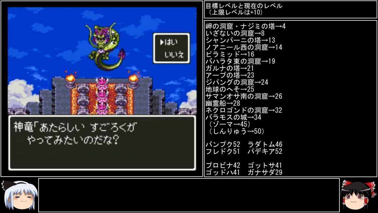 DQⅢの2周目、SFCDQⅢ編part17です。<br><br>神竜「さあ 願いをいうがいい」<br>戦士「あたらしい すごろくが したい」<br>神竜「嘘でしょ(ドン引き)」<br><br>前→<a href="https://www.nicovideo.jp/watch/sm45056359" class="watch">sm45056359</a><br>次→<a href="https://www.nicovideo.jp/watch/sm45082804" class="watch">sm45082804</a><br><br>YouTube版→<a href="https://youtu.be/OsvHHmUfI54" target="_blank" rel="noopener nofollow">https://youtu.be/OsvHHmUfI54</a><br><br>縛りルール(詳細はpart1参照)<br>①一度使った武器・防具・装飾品・道具・呪文・特技は<br> 次作品以降使用禁止。(売却も解禁扱い)<br><br> 一度使った職業(3,6,7)・仲間モンスター(5,6)・スカウトモンスター(8)は<br> 戦士(Ⅲ)、戦士(Ⅵ)のようにナンバリングで分類し次作品以降使用禁止。<br> また複数体加入できる仲間モンスターは一体まで。<br><br>②裏技、バグ技、全滅、逃走、おどかす禁止。<br> またダンジョン攻略とボス戦における状況再現禁止。<br><br>③ダンジョンとボス攻略は、全キャラのレベルを突入時、<br> 1周目は目標レベル+5。2周目は+10。3周目は+15まで。<br> ラスボスの目標レベルは45。裏ボスは50とする。<br>(目標レベルは各公式ガイドブックを参照)<br><br>④1周目はEDまで。2周目は裏ボス撃破まで。<br> 3周目は全てのボスを規定回数、規定ターン以内に倒す。<br>(回避可能なボスも倒し、闇ゾーマは3周全てで倒す)<br><br><br><span style="color: #262626;">※一部機種は互換機を使用してのプレイとなりますが、倍速機能やクイックセーブ・ロード、チートなどは一切使用しません。</span><br><br>※ネタバレ注意です<br><br>この動画で利用している株式会社スクウェア・エニックスを代表とする共同著作者が権利を所有する著作物及びスギヤマ工房有限会社が権利を所有する楽曲の転載・配布は禁止いたします。<br>(C) ARMOR PROJECT/BIRD STUDIO/SQUARE ENIX All Rights Reserved.<br>(C) SUGIYAMA KOBO (P) SUGIYAMA KOBO<br><br>AquesTalk2ライセンスID:AQTK2WINUSR23122185<br /><br><br>❤いいねを押していただけるとモチベーションと投稿速度が上がるので宜しくお願い致します!<br><br>作者ツイッター→ <a href="https://twitter.com/nig0117" target="_blank" rel="noopener nofollow">https://twitter.com/nig0117</a><br>PIXIV FANBOX→ <a href="https://sutanokeiji.fanbox.cc/" target="_blank" rel="noopener nofollow">https://sutanokeiji.fanbox.cc/</a><br><br>( 以前はWEB小説書いてました→ <a href="https://kakuyomu.jp/works/1177354054884910267" target="_blank" rel="noopener nofollow">https://kakuyomu.jp/works/1177354054884910267</a> )