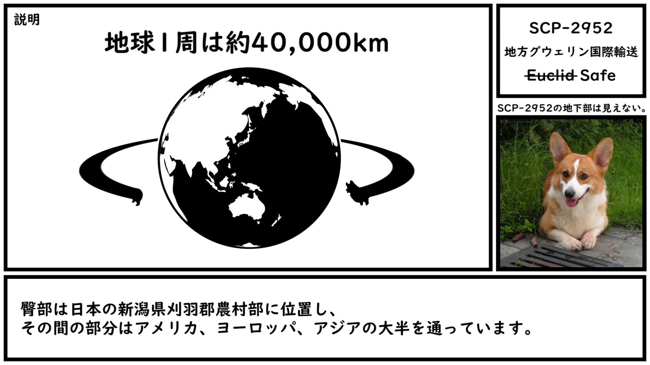 世界にまたがる劇長犬。こう見えて公共交通機関。 <br><br>原語版タイトル: SCP-2952 - Conveyance Of Regional Gwerin Internationally<br>訳者: kidonoi<br>原語版作者: AbsentmindedNihilist<br>ソース: <a href="http://scp-jp.wikidot.com/scp-2952" target="_blank" rel="noopener nofollow">http://scp-jp.wikidot.com/scp-2952</a><br>原語版ソース: <a href="http://scp-wiki.wikidot.com/scp-2952" target="_blank" rel="noopener nofollow">http://scp-wiki.wikidot.com/scp-2952</a><br>ライセンス: CC BY-SA 3.0<br>作成年: 2017<br>原語版作成年: 2017 <br><br>この作品は株式会社アクエストのライセンス(ID:AQALCNTUSR26072467)に基づいて生成された音声データを含んでいます。