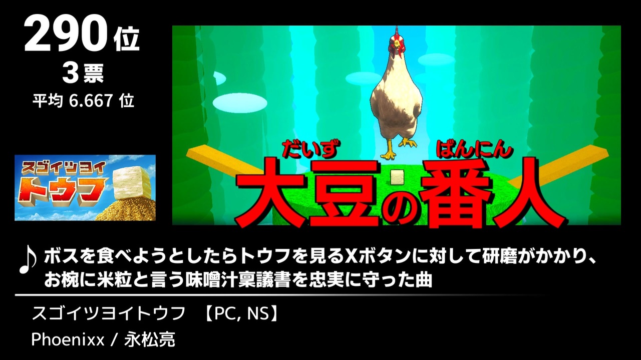 ①<a href="#" class="seekTime" data-seekTime="00:14" onclick="seekNicoPlayer('#00:14'); return false;">#00:14</a> ②<a href="#" class="seekTime" data-seekTime="02:13" onclick="seekNicoPlayer('#02:13'); return false;">#02:13</a> ③<a href="#" class="seekTime" data-seekTime="06:16" onclick="seekNicoPlayer('#06:16'); return false;">#06:16</a> ④<a href="#" class="seekTime" data-seekTime="09:38" onclick="seekNicoPlayer('#09:38'); return false;">#09:38</a> ⑤<a href="#" class="seekTime" data-seekTime="13:03" onclick="seekNicoPlayer('#13:03'); return false;">#13:03</a> ⑥<a href="#" class="seekTime" data-seekTime="20:52" onclick="seekNicoPlayer('#20:52'); return false;">#20:52</a> ⑦<a href="#" class="seekTime" data-seekTime="24:08" onclick="seekNicoPlayer('#24:08'); return false;">#24:08</a> ⑧<a href="#" class="seekTime" data-seekTime="27:42" onclick="seekNicoPlayer('#27:42'); return false;">#27:42</a> ⑨<a href="#" class="seekTime" data-seekTime="29:50" onclick="seekNicoPlayer('#29:50'); return false;">#29:50</a> ⑩<a href="#" class="seekTime" data-seekTime="31:53" onclick="seekNicoPlayer('#31:53'); return false;">#31:53</a> ⑪<a href="#" class="seekTime" data-seekTime="35:34" onclick="seekNicoPlayer('#35:34'); return false;">#35:34</a> ⑫<a href="#" class="seekTime" data-seekTime="37:54" onclick="seekNicoPlayer('#37:54'); return false;">#37:54</a> ⑬<a href="#" class="seekTime" data-seekTime="42:12" onclick="seekNicoPlayer('#42:12'); return false;">#42:12</a> ⑭<a href="#" class="seekTime" data-seekTime="44:40" onclick="seekNicoPlayer('#44:40'); return false;">#44:40</a> ⑮<a href="#" class="seekTime" data-seekTime="47:47" onclick="seekNicoPlayer('#47:47'); return false;">#47:47</a> ⑯<a href="#" class="seekTime" data-seekTime="51:38" onclick="seekNicoPlayer('#51:38'); return false;">#51:38</a> ⑰<a href="#" class="seekTime" data-seekTime="54:03" onclick="seekNicoPlayer('#54:03'); return false;">#54:03</a> ⑱<a href="#" class="seekTime" data-seekTime="57:23" onclick="seekNicoPlayer('#57:23'); return false;">#57:23</a> ⑲<a href="#" class="seekTime" data-seekTime="61:01" onclick="seekNicoPlayer('#61:01'); return false;">#61:01</a> ⑳<a href="#" class="seekTime" data-seekTime="64:33" onclick="seekNicoPlayer('#64:33'); return false;">#64:33</a> ㉑<a href="#" class="seekTime" data-seekTime="69:00" onclick="seekNicoPlayer('#69:00'); return false;">#69:00</a> ㉒<a href="#" class="seekTime" data-seekTime="71:34" onclick="seekNicoPlayer('#71:34'); return false;">#71:34</a> ㉓<a href="#" class="seekTime" data-seekTime="78:06" onclick="seekNicoPlayer('#78:06'); return false;">#78:06</a> <br><br><br>Part5は307~286位の23曲を収録。<br><br><br><br>◆2024年のゲーム・サントラ購入先まとめはこちら!<br><a href="https://sinkyoku.blogspot.com/" target="_blank" rel="noopener nofollow">https://sinkyoku.blogspot.com/</a><br><br><br><br><a href="https://www.nicovideo.jp/watch/sm45064426" class="watch">sm45064426</a> ←前【<a href="https://www.nicovideo.jp/mylist/78058006" target="_blank" rel="noopener">mylist/78058006</a>】次→ 6/28(※6/21は投稿お休みします)<br>